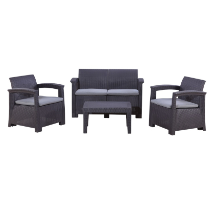 Záhradná zostava: stôl + 4 miesta na sedenie, konštrukcia z ťahokovu, výplet z pevných ôk, povrch...