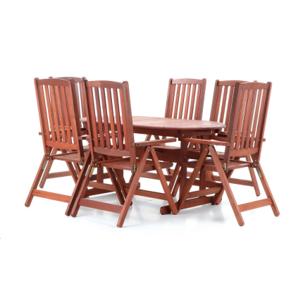 Záhradná zostava: 6 polohovateľných stoličiek + rozkladací stôl, konštrukcia z dreva meranti,...