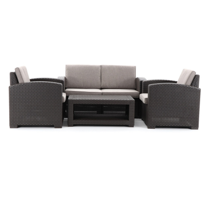 Záhradná zostava: 2 kreslá + 1 dvojsedák + stôl, výplet z umelého ratanu, látkové podsedáky