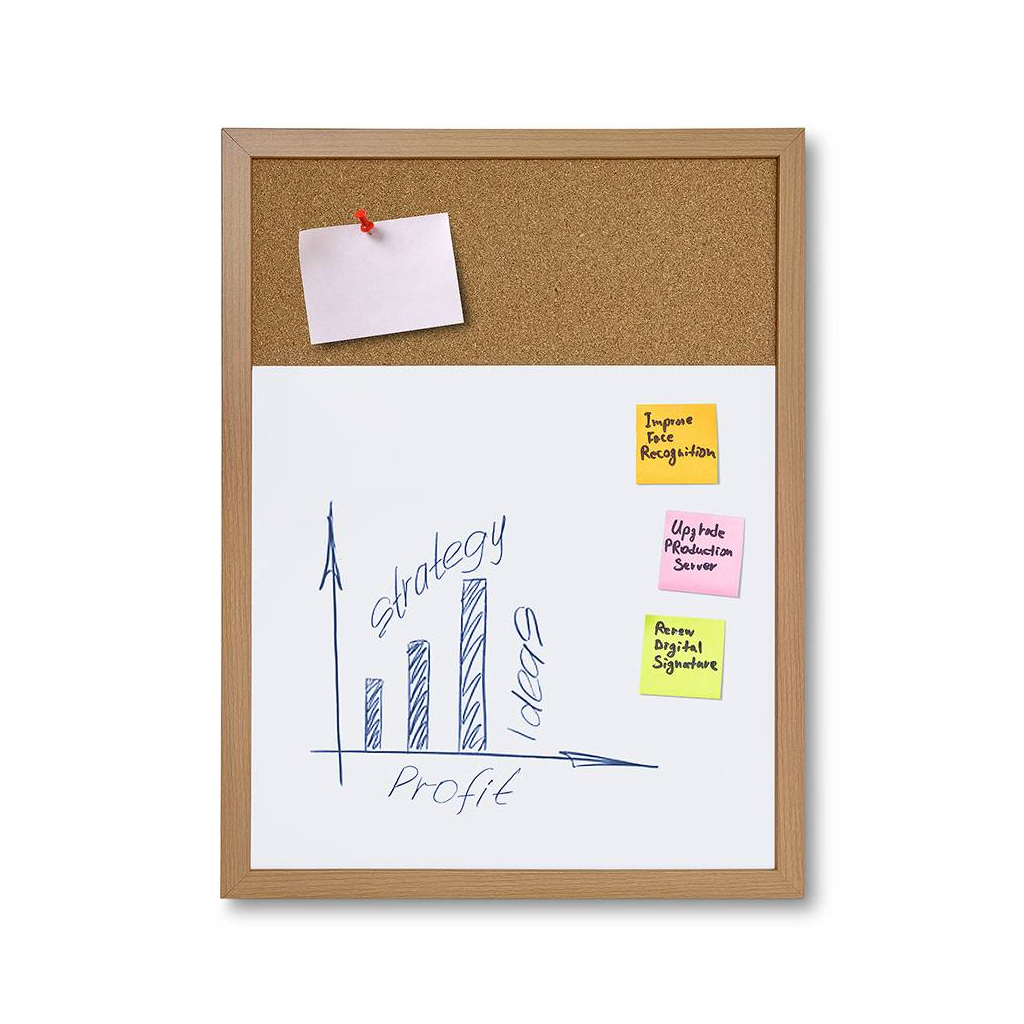 Korkové nástenky sú skvelým prostriedkom na vyvesovanie tlačovín, poznámok a fotografií, whiteboardy a čierne tabule zase ponúkajú možnosť rýchleho popisovania a mazania podľa potreby, spravidla s možnosťou využitia magnetov. A prečo to nespojiť do jedného výrobku? Presne táto filozofia stála pri zrode radu Combi Board.