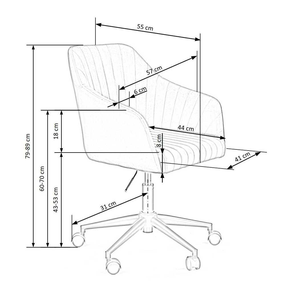 Plastová základňa s piatimi podrúčkami je zakončená plastovými kolieskami, ktoré sú vhodné na mäkké podlahy a koberce.