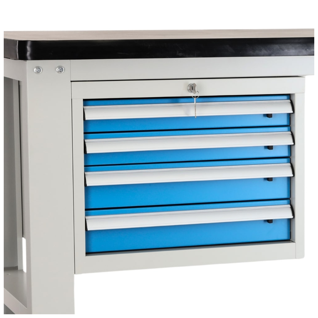 Stôl sa chváli úložnými modulmi na oboch stranách, kam si odložíte náradie alebo súčiastky, ktoré práve nepotrebujete na stole. Dvierka sú lakované štandardným odtieňom RAL 5012, aby dokonale ladili aj s ďalším dielenským nábytkom.