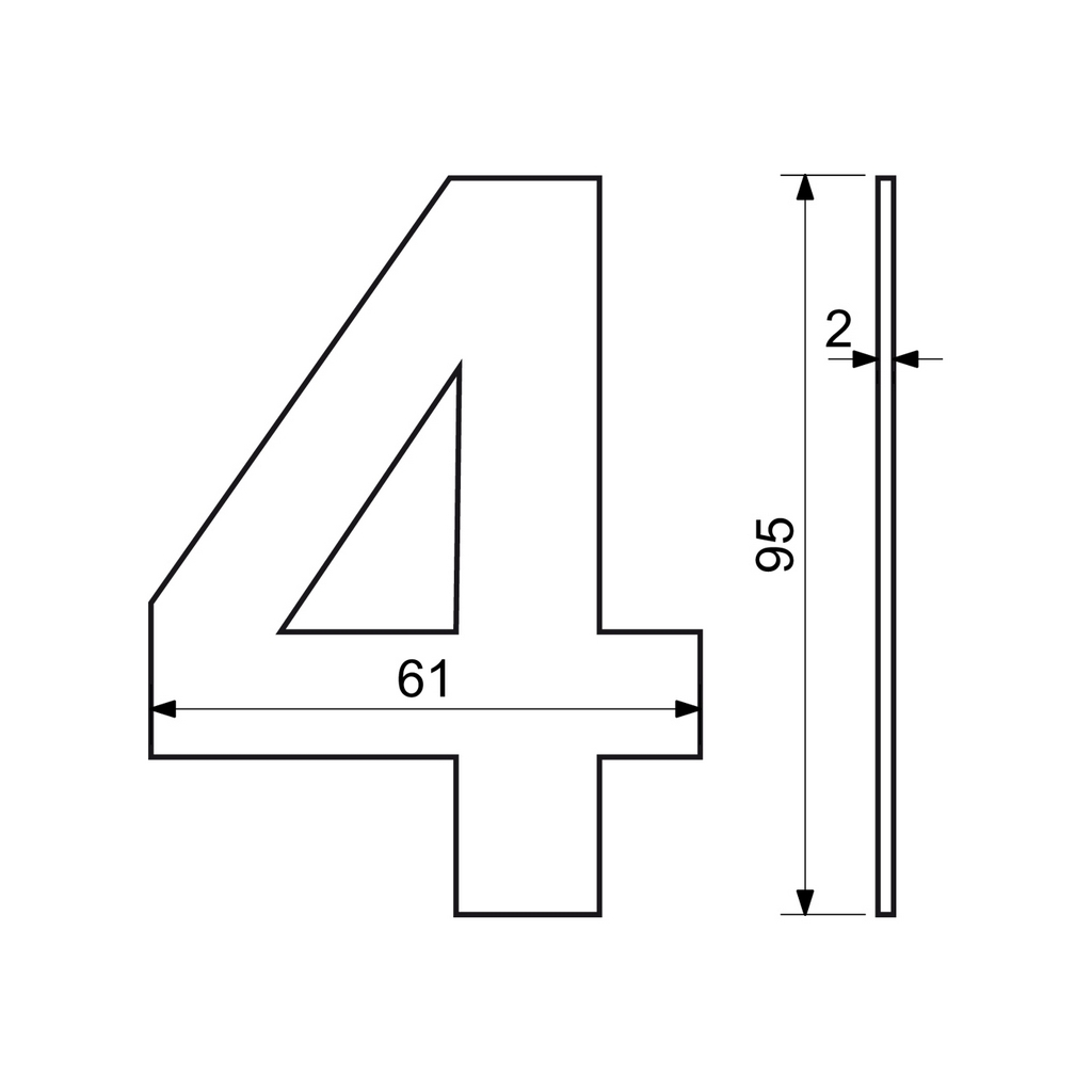 Domové číslo "4" v 2D prevedení využijete pri identifikácii objektov - ako súčasť popisného čísla na fasáde domu, firmy či iných budov. Je vyrobené z nerezovej ocele. Všetky čísla a znaky z tejto rady majú rovnakú výšku i hrúbku. Poskladáte si tak popisné a orientačné číslo v jednom štýle. Tento typ domového čísla je vhodný pre inštaláciu na stredne hrubé a hladké povrchy.
