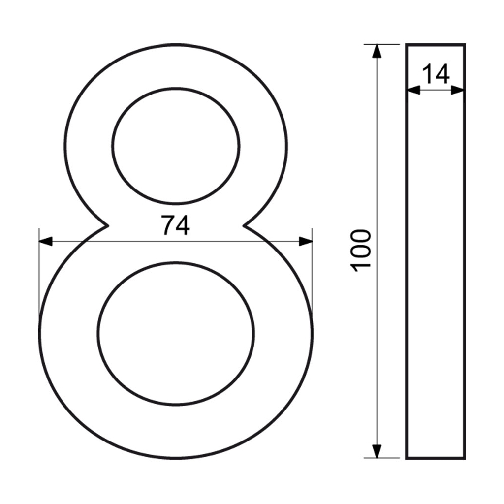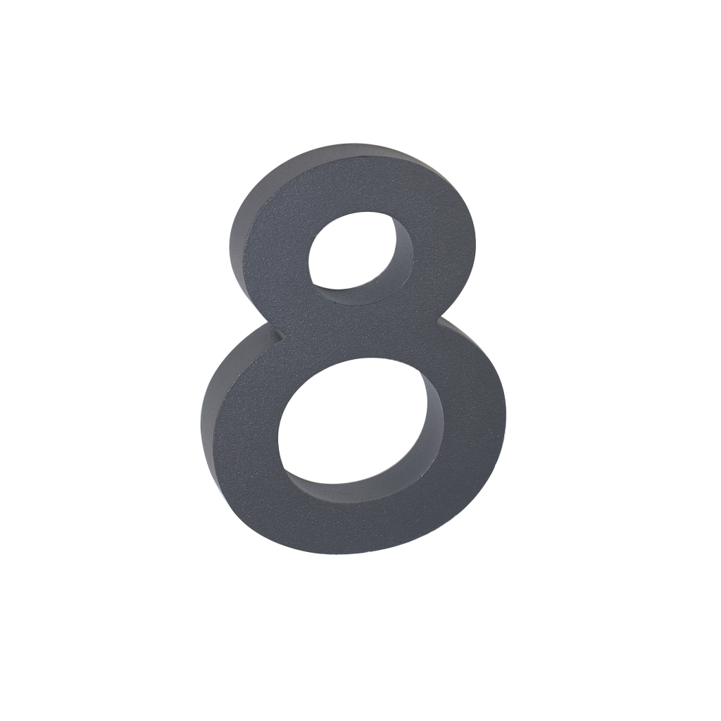 Domové číslo "8" využijete pri identifikácii objektov - ako súčasť popisného čísla na fasáde domu, firmy či iných budov. Je vyrobené z hliníka a má štruktúrovaný povrch vo farbe matného antracitu. Všetky čísla a znaky z tejto rady majú rovnakú výšku i hrúbku. Poskladáte si tak popisné a orientačné číslo v jednom štýle.