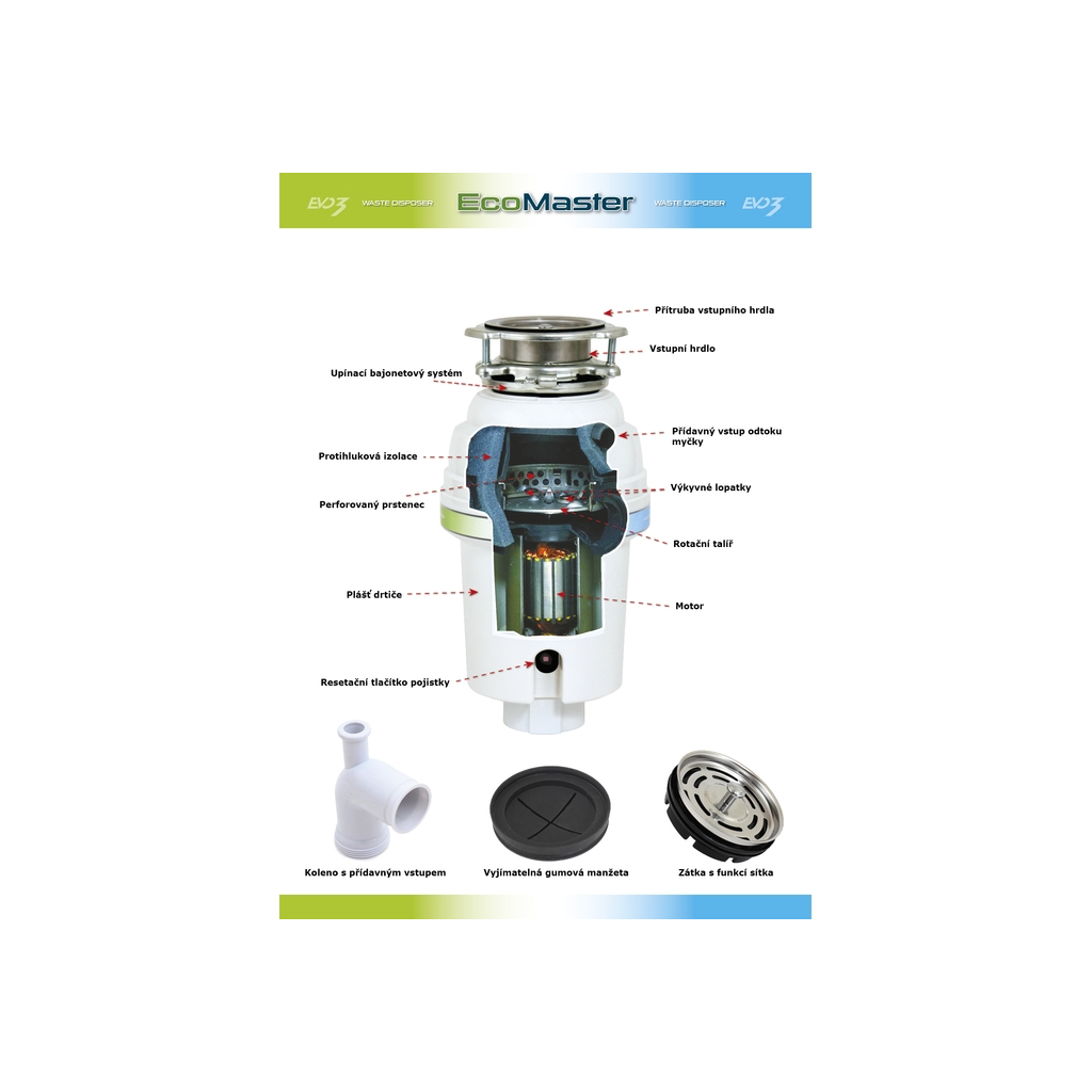 Balenie obsahuje drvič odpadu EcoMaster LCD EVO3, montážny návod, odpadové koleno s prídavným vstupom na prepad/umývačku vrátane príruby a skrutiek, vyberateľnú silikónovú manžetu a zátku z nerezovej ocele s funkciou sitka.