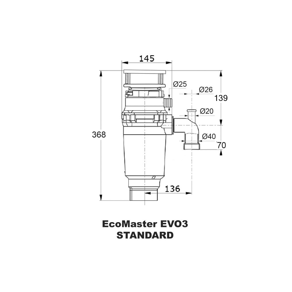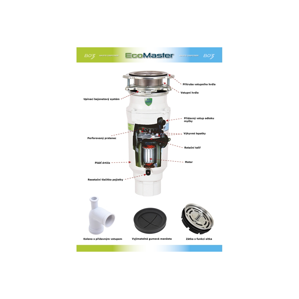 Drvič odpadu EcoMaster STANDARD EVO3 vás raz a navždy zbaví zvyškov jedál z drezu. Vďaka nemu môžete škrabať zeleninu pohodlne nad drezom a jedným tlačidlom zlikvidovať všetky šupky a odrezky. Nikde nič netleje a nehnije. Bez zápachu a nepríjemných kŕdľov múch.