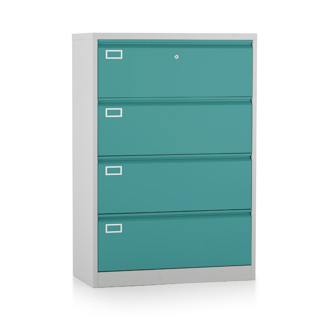 Disponuje 4 širokými zásuvkami so závesom, ktoré sú vhodné pre zložky a dokumenty formátu A4.
