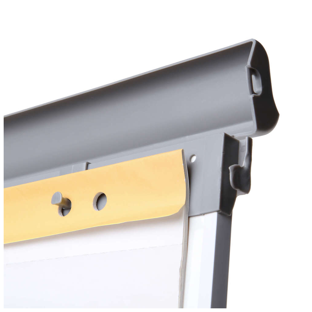 Flipchart s rozmermi pracovnej plochy 68 x 100 cm disponuje vysúvacími ramenami, ktoré rozšíria plochu až trojnásobne. Je vybavený magnetickým popisovateľným povrchom v bielej farbe, ktorý je určený na popisovanie fixkami, ktoré jednoducho zotriete nasucho. Okrem písania však môžete využiť aj magnety na pripnutie všetkých dôležitých dokumentov, ktoré tak budete mať stále na očiach. Flipchart ponúka aj háčiky na zavesenie klasického flipchart papiera.