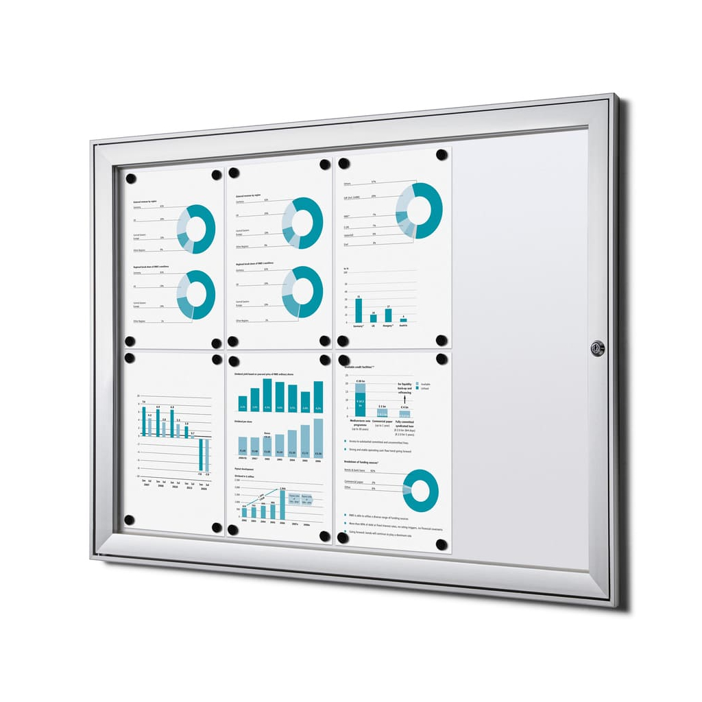 Vitrína vo formáte 8 x A4 disponuje magnetickým popisovateľným povrchom. Ten je určený na popisovanie fixkami, ktoré ľahko zotriete nasucho. Okrem písania môžete využiť aj magnety na pripnutie všetkých dôležitých dokumentov, ktoré tak budete mať stále na očiach.