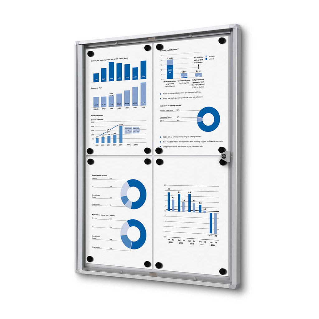 Vitrína Economy vo formáte 4 x A4 disponuje magnetickým popisovateľným povrchom. Ten je určený na popisovanie fixkami, ktoré môžete stierať nasucho. Okrem písania môžete využiť aj magnety na pripnutie všetkých dôležitých dokumentov, ktoré tak budete mať stále na očiach.