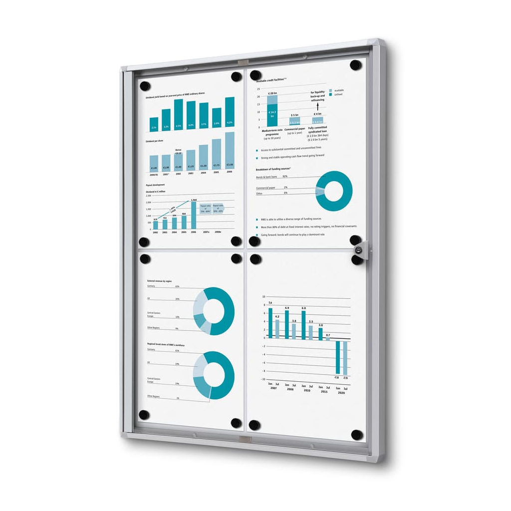 Vitrína vo formáte 4 x A4 disponuje magnetickým popisovateľným povrchom. Ten je určený na popisovanie fixkami, ktoré ľahko zotriete nasucho. Okrem písania môžete využiť aj magnety na pripnutie všetkých dôležitých dokumentov, ktoré tak budete mať stále na očiach.