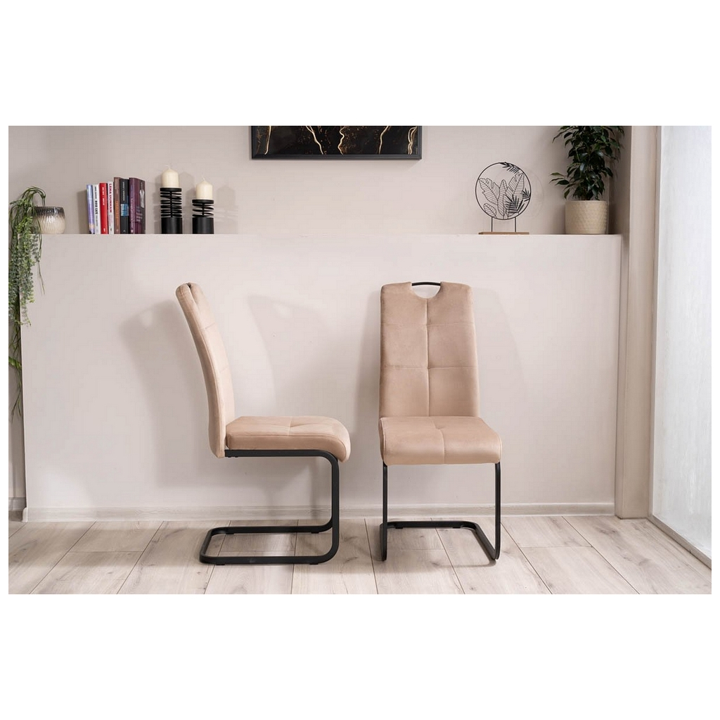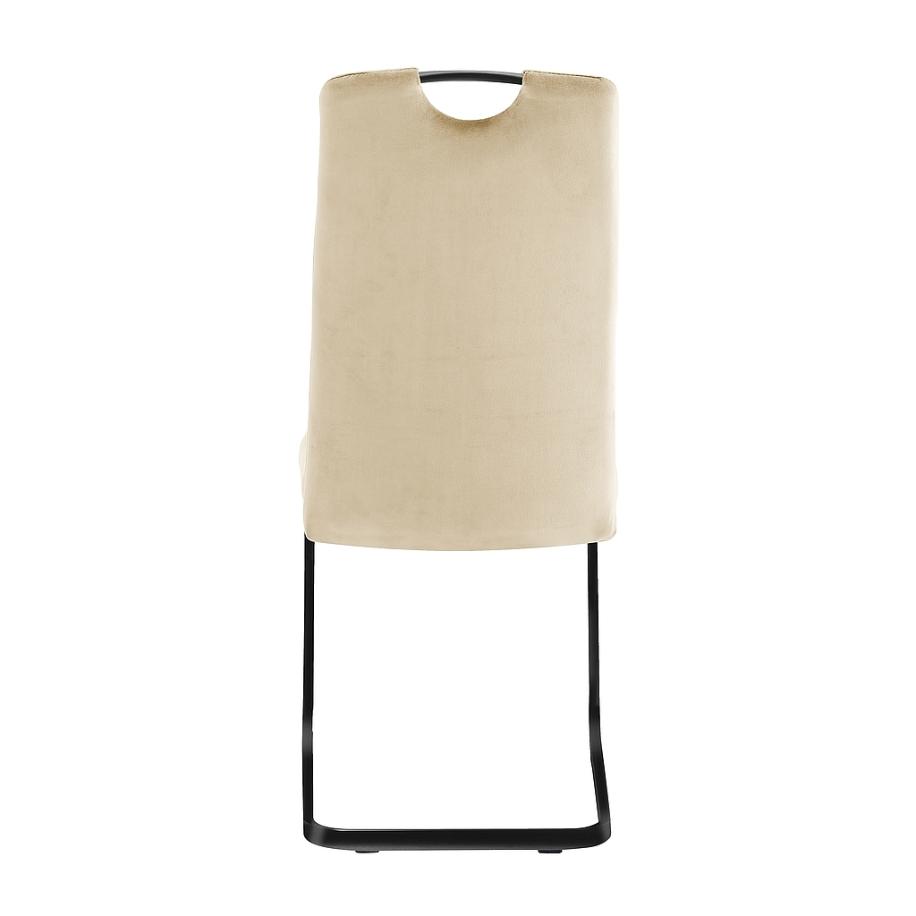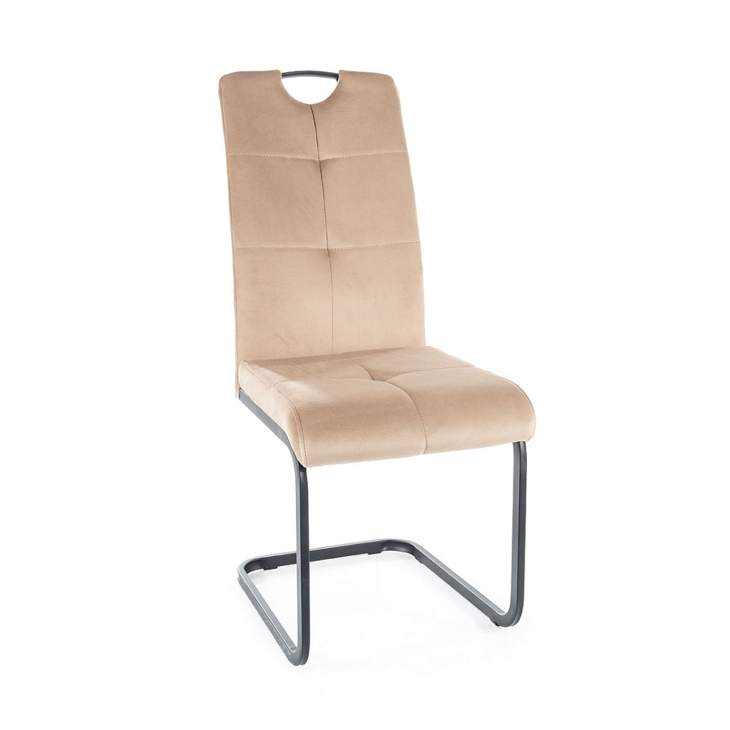 Sedák stoličky je čalúnený mäkkou, na dotyk príjemnou zamatovou látkou, ktorá poskytuje nielen pohodlie, ale aj výrazný vizuálny prvok vďaka prešívaniu. Mäkké polstrovanie sedadla zaisťuje komfort aj počas dlhšieho sedenia, či už pri večeri s rodinou, alebo pri dlhých večerných rozhovoroch s priateľmi.