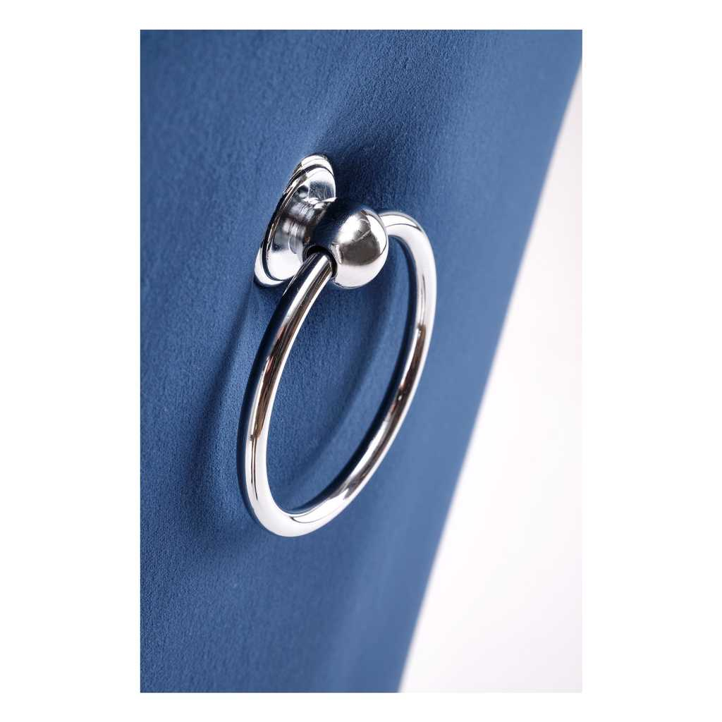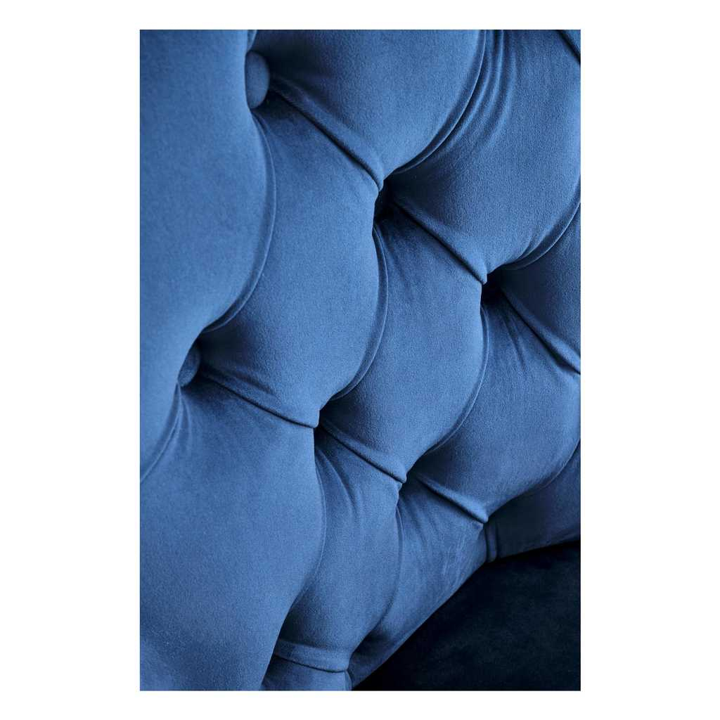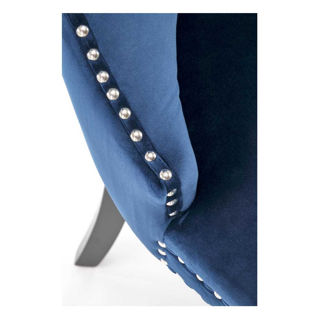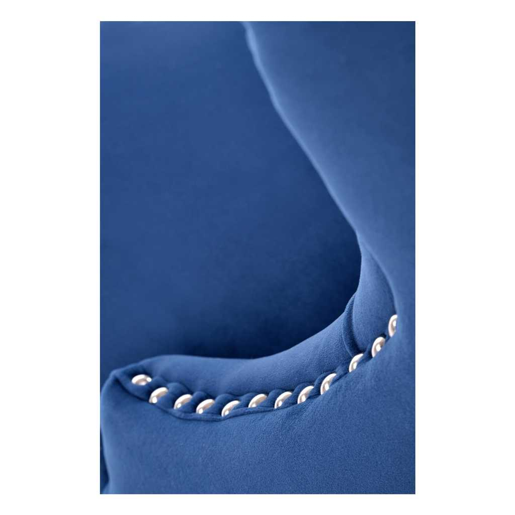 Čalúnenie je vyrobené zo zamatovej látky, ktorá kreslu dodáva na prestíži. Operadlo je zdobené výrazným prešívaním a jeho krivky zvýrazňuje kovové čapové lemovanie.