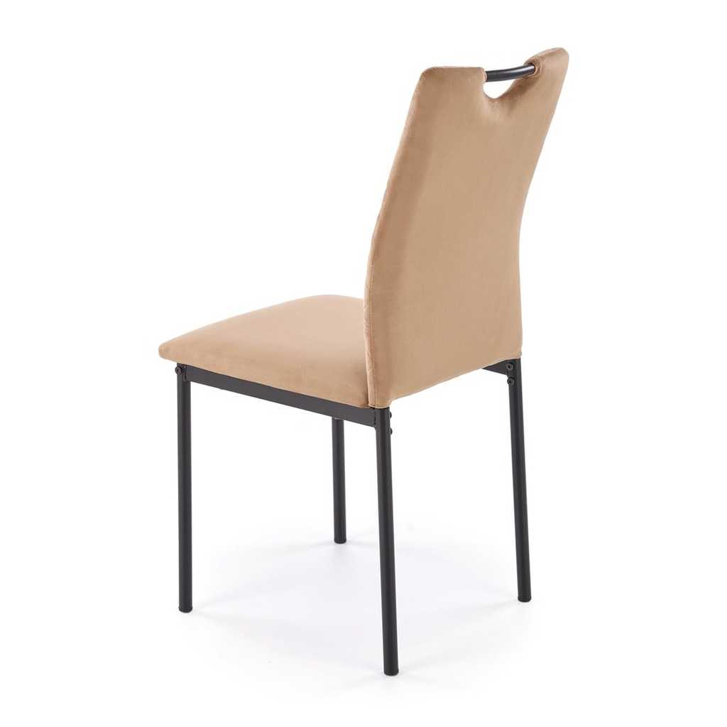 Čalúnené sedadlo a operadlo z látky s jemným zamatovým povrchom zaručujú pohodlné sedenie aj pri dlhšom používaní, zatiaľ čo pevná kovová podnož poskytuje stabilitu a spoľahlivosť. Jedálenská stolička Lucaria nesie záťaž až do 120 kg, vďaka čomu je nielen štýlová, ale aj funkčná.