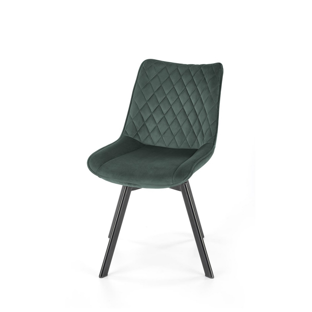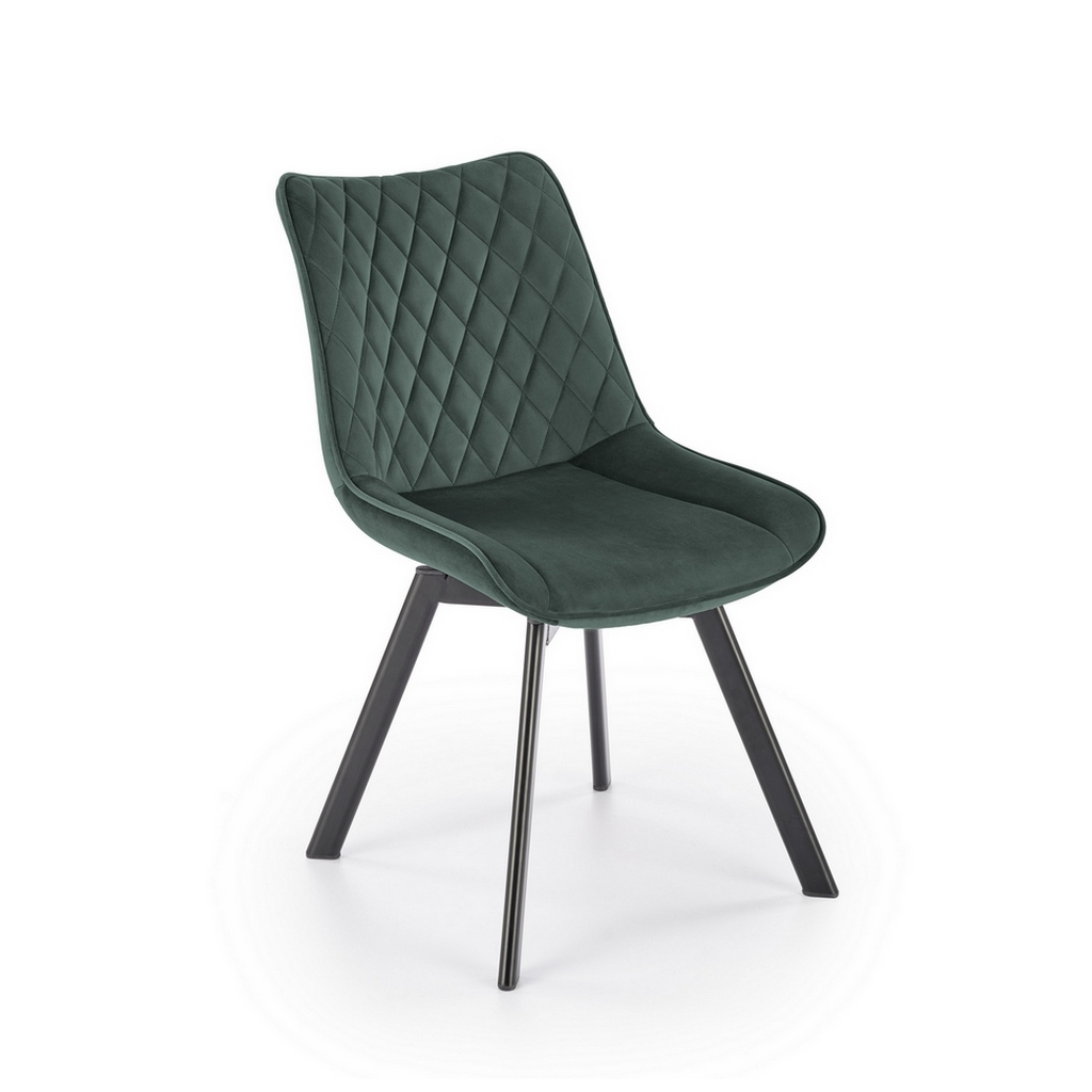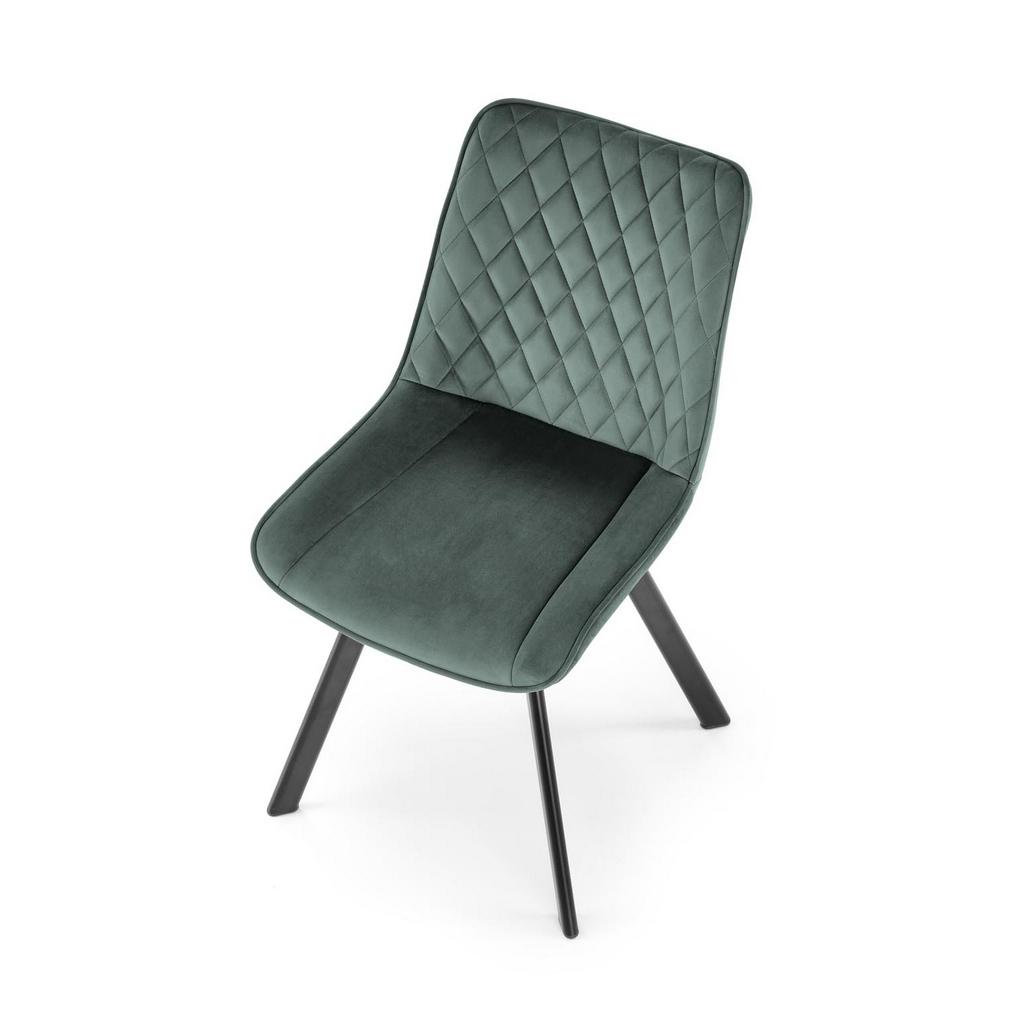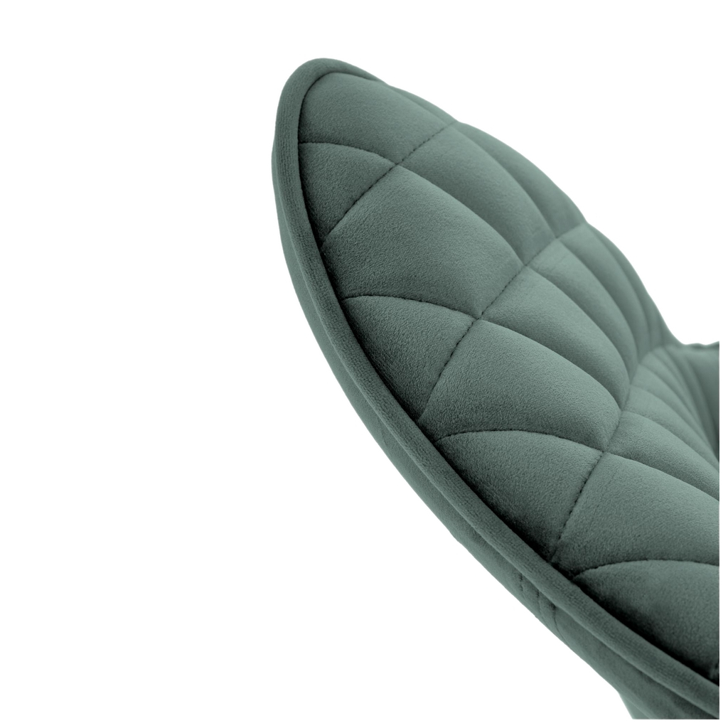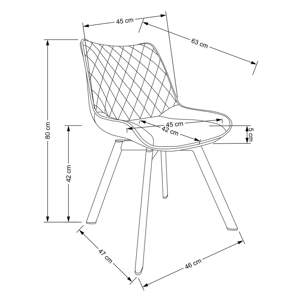 Sedadlo je čalúnené hebkou látkou s kosoštvorcovým vzorom na operadle. Tento vkusný dizajnový prvok ozvláštňuje inak minimalistický vzhľad stoličky.
