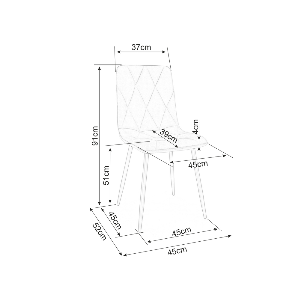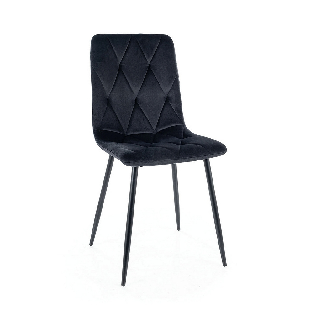 Úzke nohy z kovu dodávajú stoličke stabilitu, zároveň ale pôsobia vzdušne. O efektný vzhľad a pohodlie sa stará polstrovanie a čalúnenie zo zamatovo hebkej látky. Tá zaujme moderným prešívaním do kosoštvorcov.