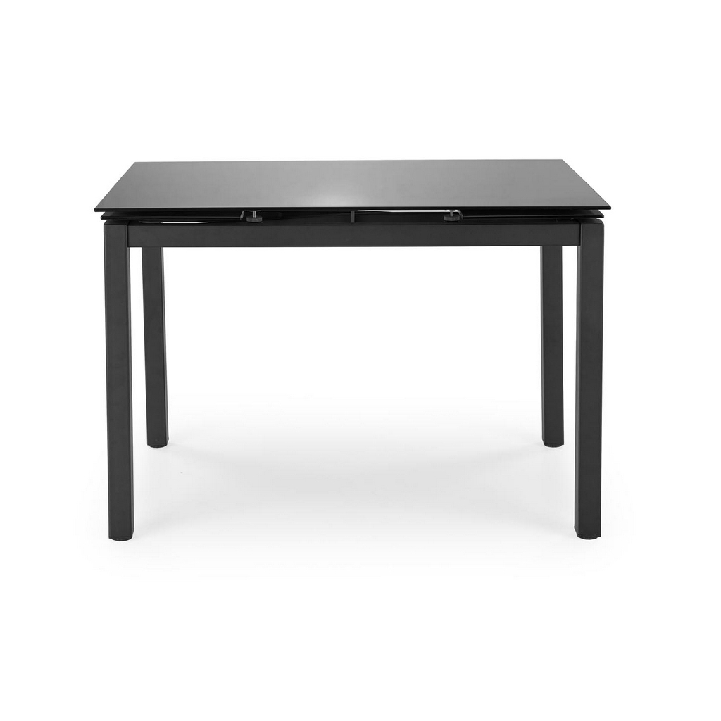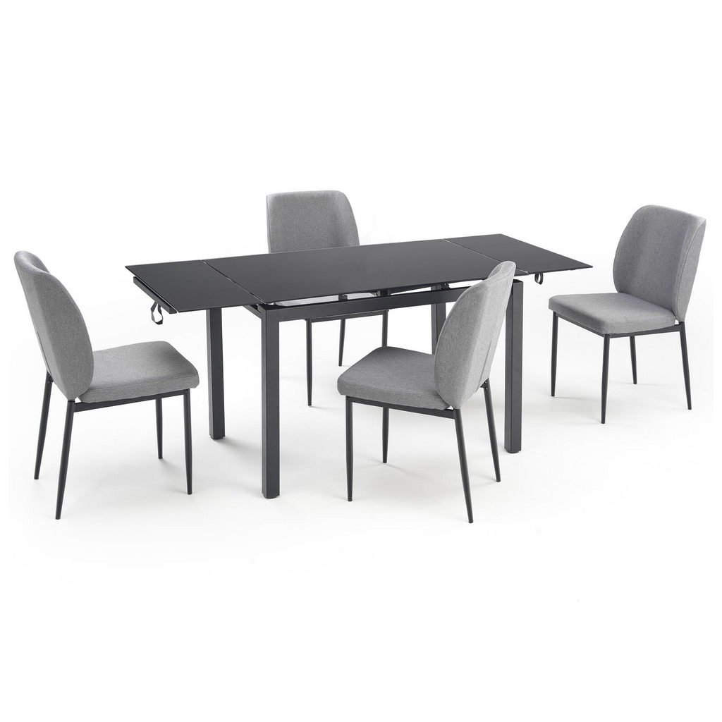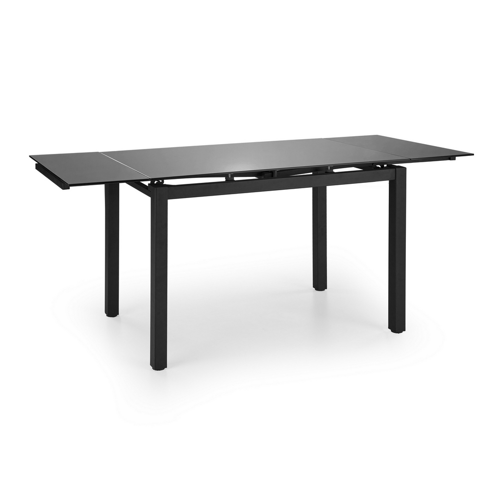 Dominantou je obdĺžnikový stôl s kovovou podnožou a sklenenou doskou, ktorý navyše môžete rozložiť – pridáte tak stolu 60 cm na dĺžku.
