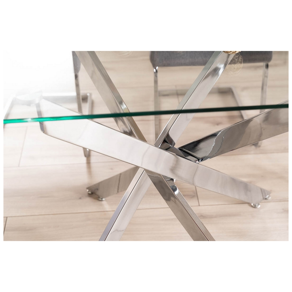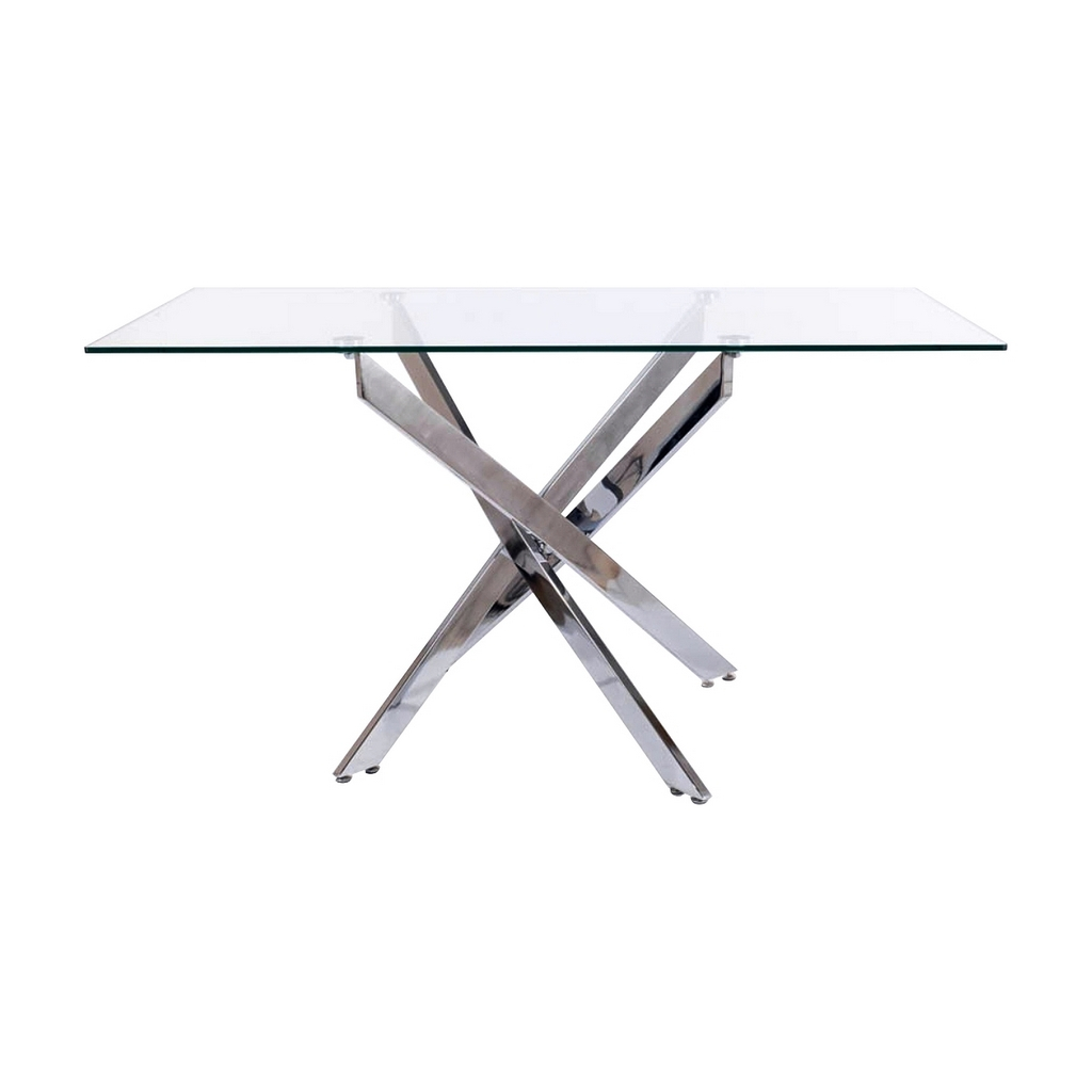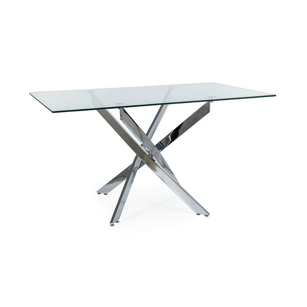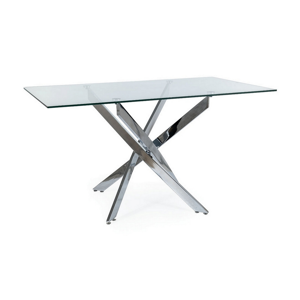 Priezračná obdĺžniková doska z tvrdeného skla o hrúbke 1 cm nenaruší celkovú atmosféru miestnosti a zároveň poskytuje pohľad na originálnu podnož. Skrížené kovové tyče v oslnivej striebornej farbe prepožičiavajú stolu pevnosť a stabilitu bez toho, aby bolo potrebné masívneho podstavca.