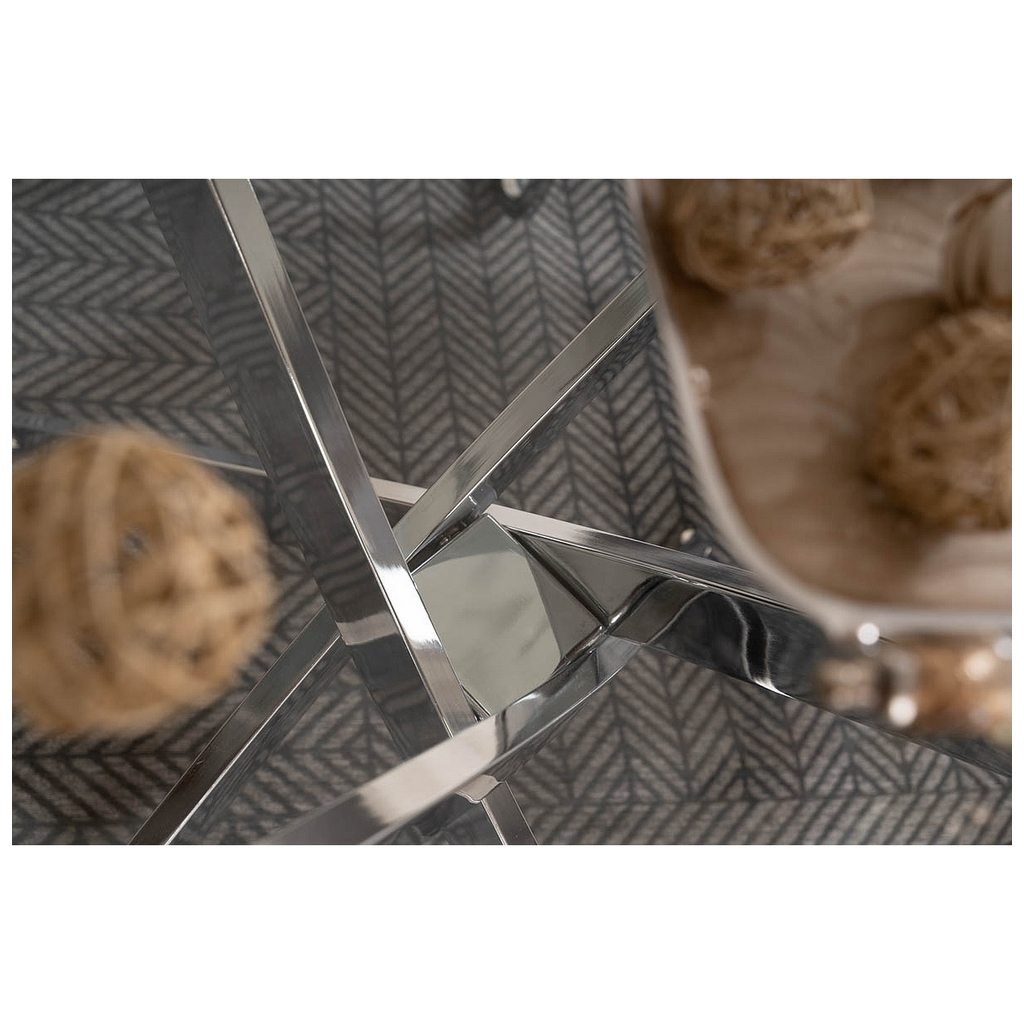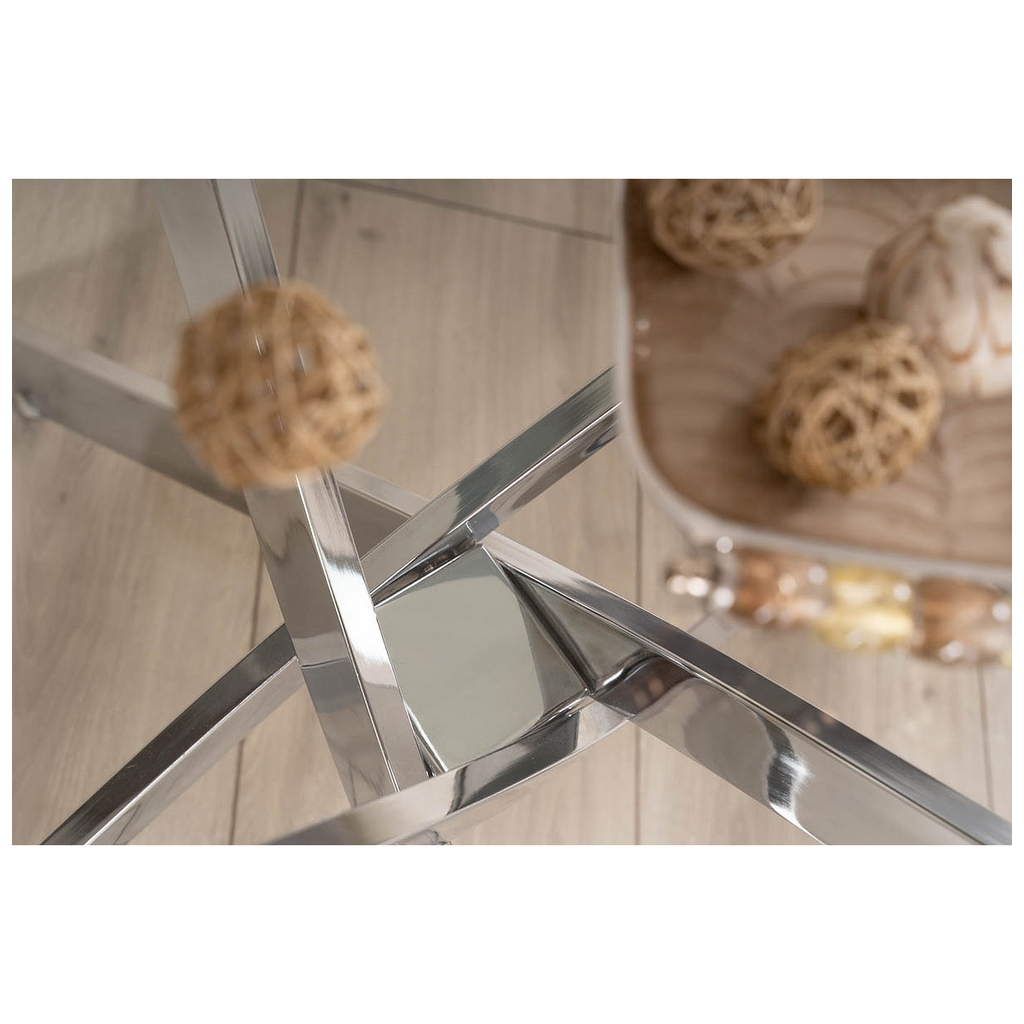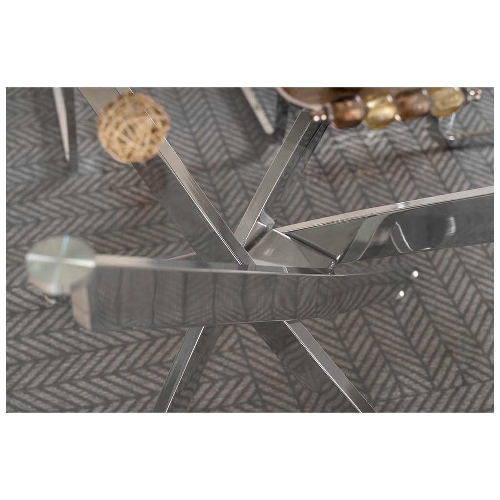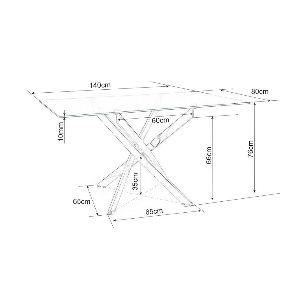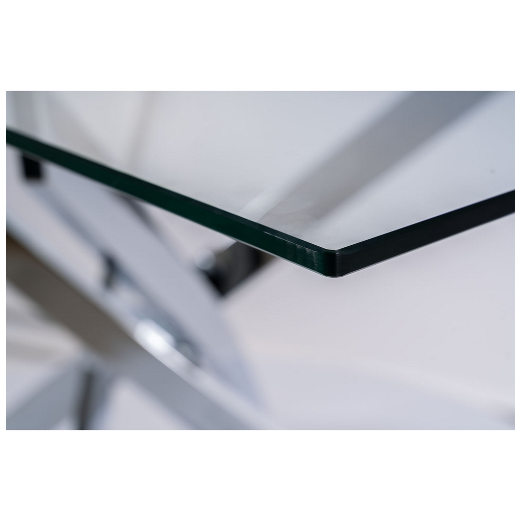 Priezračná obdĺžniková doska z tvrdeného skla o hrúbke 1 cm nenaruší celkovú atmosféru miestnosti a zároveň poskytuje pohľad na originálnu podnož. Skrížené kovové tyče v oslnivej striebornej farbe prepožičiavajú stolu pevnosť a stabilitu bez toho, aby bolo potrebné masívneho podstavca.