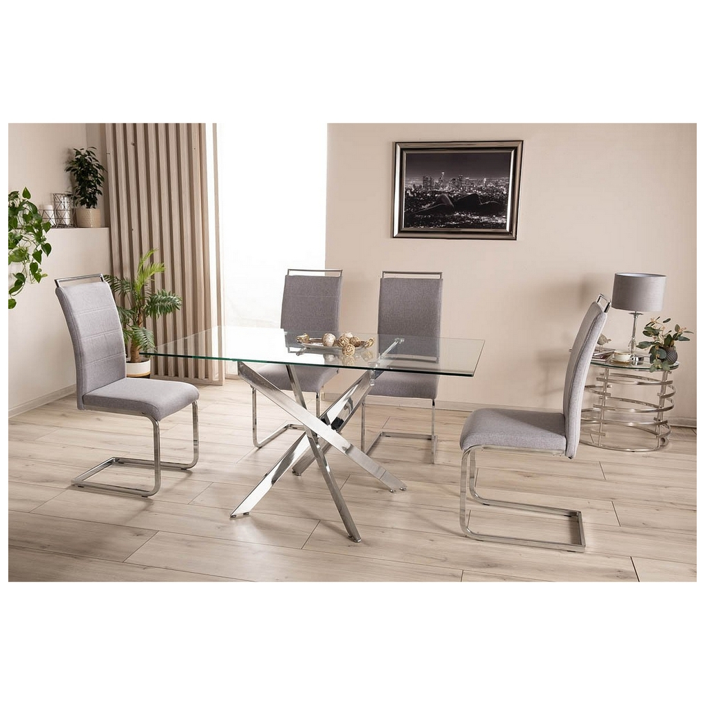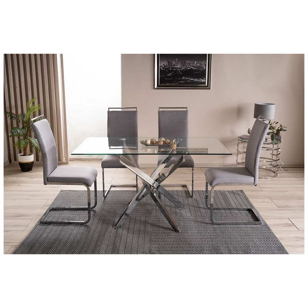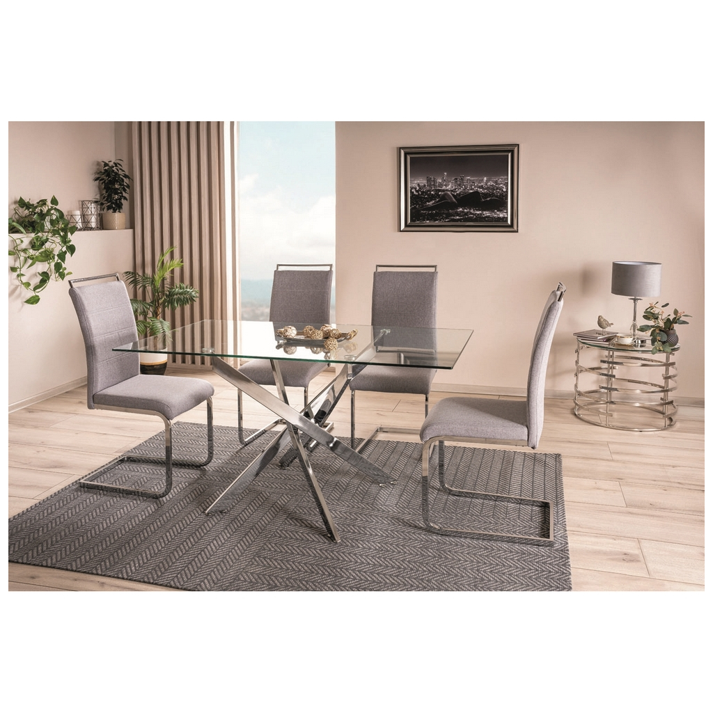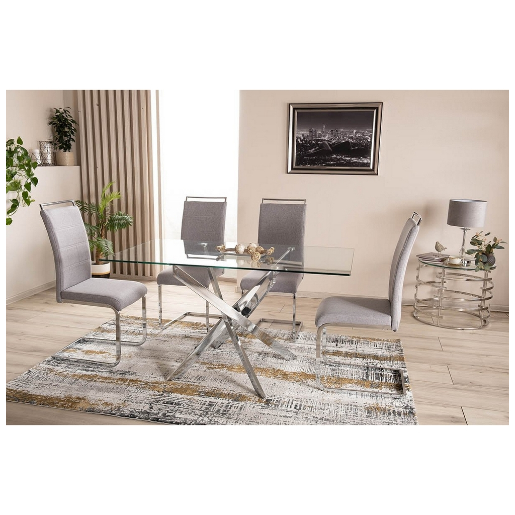 Priezračná obdĺžniková doska z tvrdeného skla o hrúbke 1 cm nenaruší celkovú atmosféru miestnosti a zároveň poskytuje pohľad na originálnu podnož. Skrížené kovové tyče v oslnivej striebornej farbe prepožičiavajú stolu pevnosť a stabilitu bez toho, aby bolo potrebné masívneho podstavca.