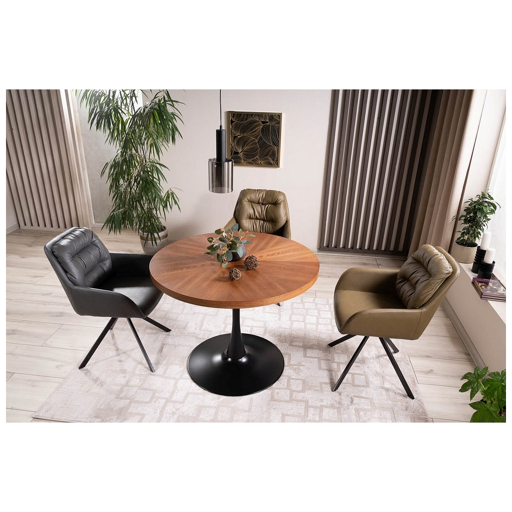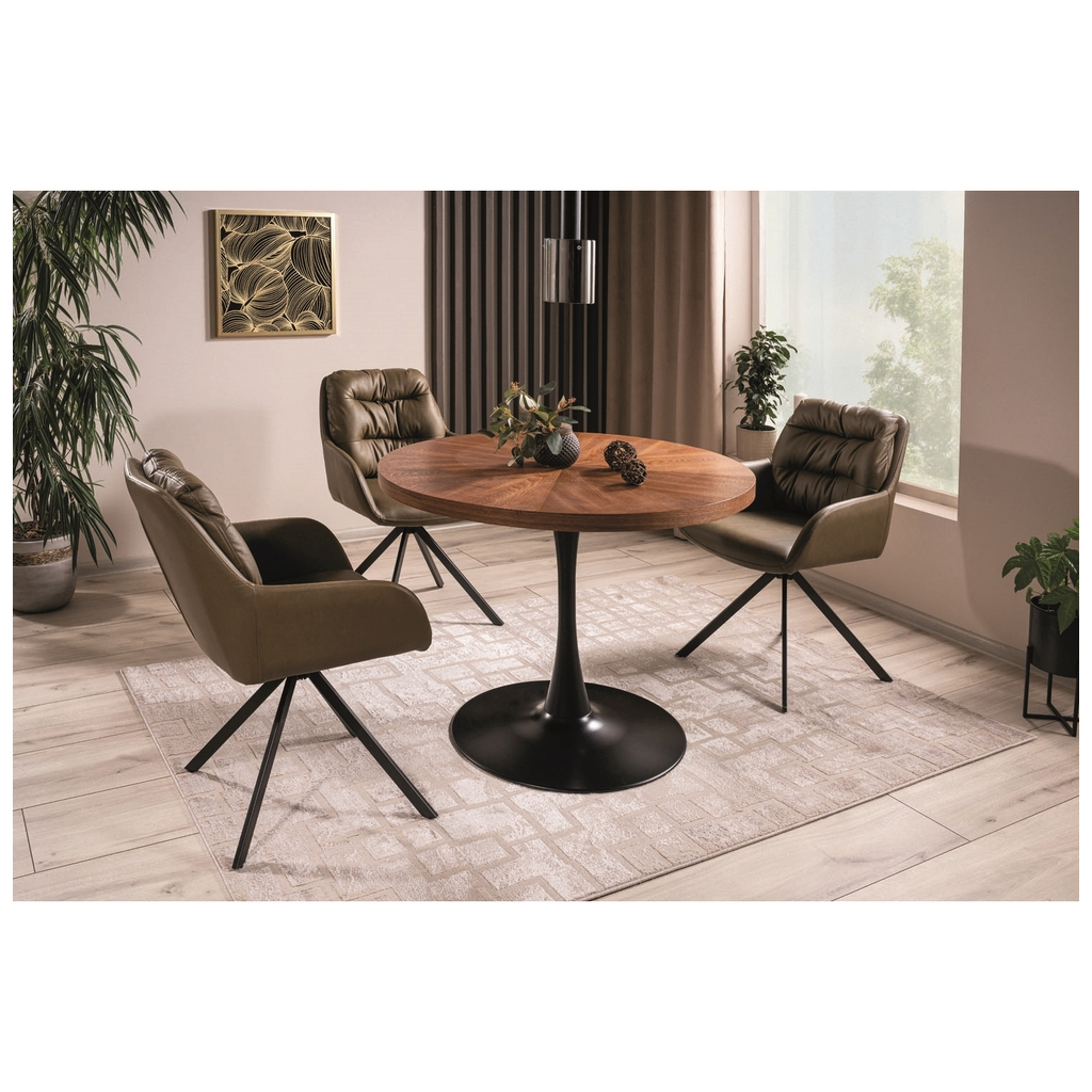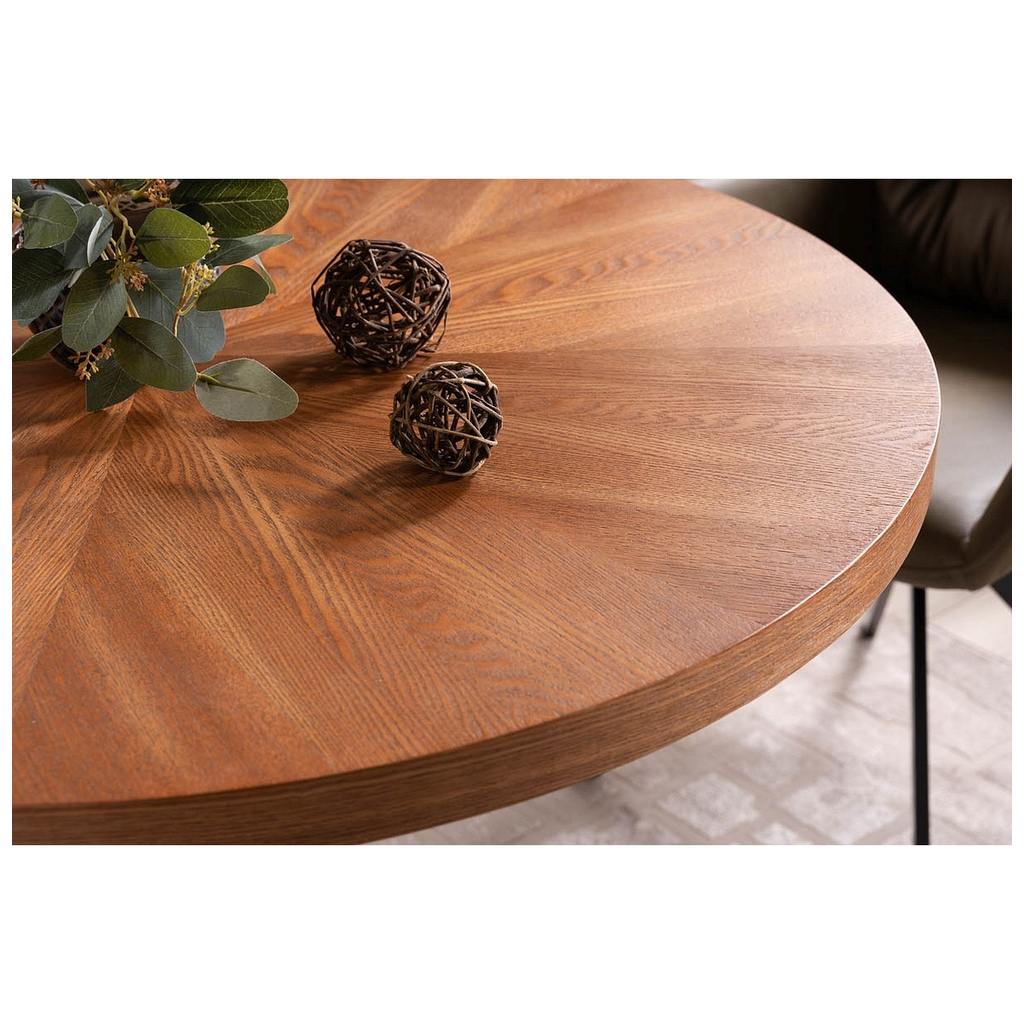 Kruhová doska vyrobená z MDF dosiek je potiahnutá prírodnou dyhou v dekore orechového dreva, ktorá dodáva eleganciu a teplo. S priemerom 100 cm je stôl kompaktný, ale poskytuje dostatok priestoru na jedlo aj interakciu. Zaujímavá kresba na doske jej prepožičiava unikátny vzhľad.