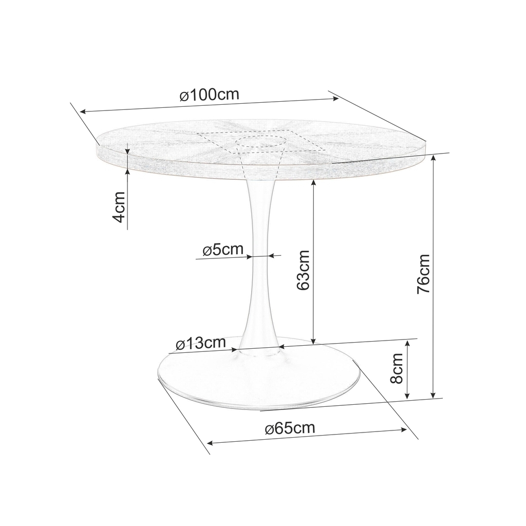 Kovová podnož s kruhovou základňou zaručuje pevnosť a stabilitu a zároveň podporuje celkový design stola. Vhodný je pre až 4 osoby.