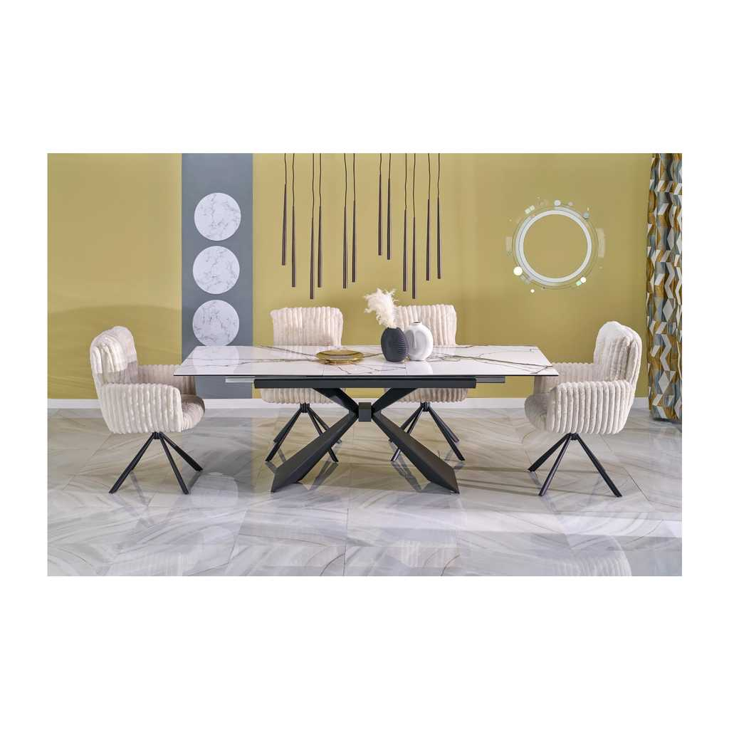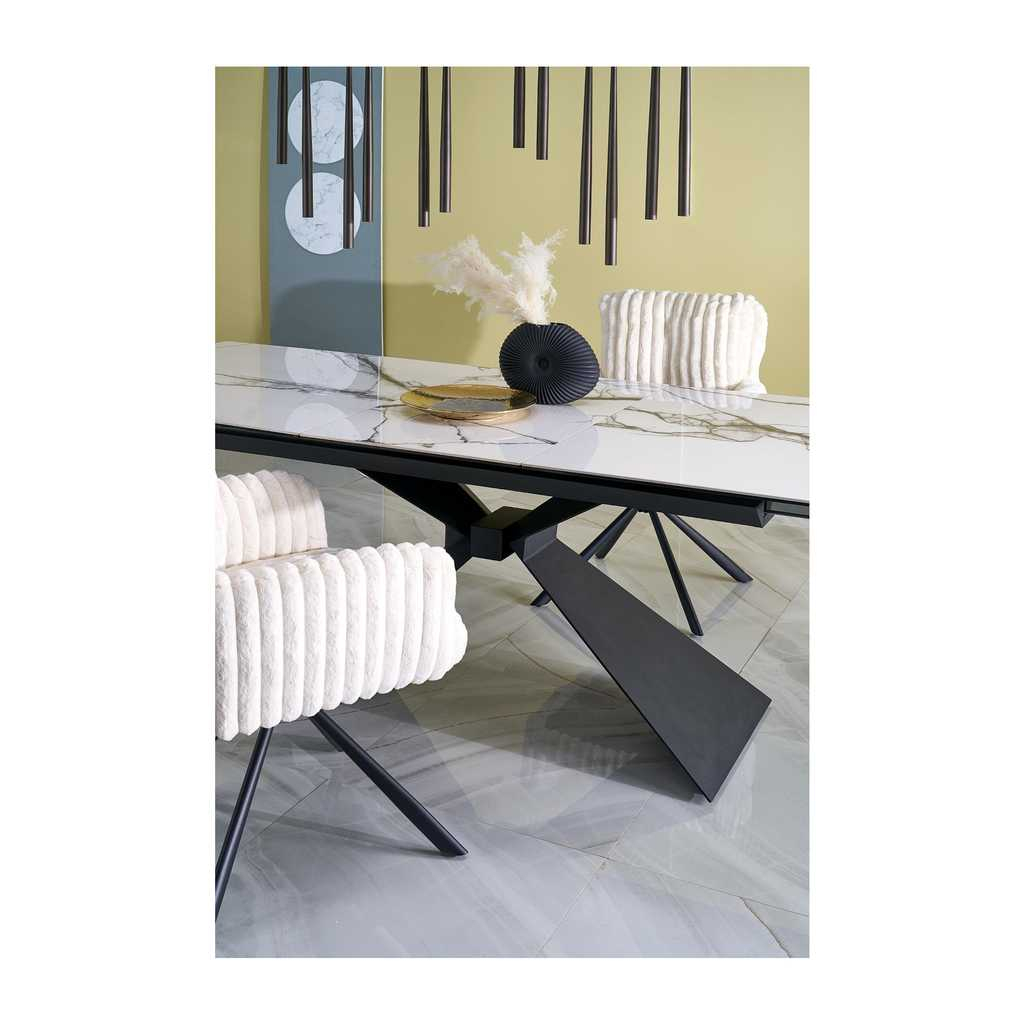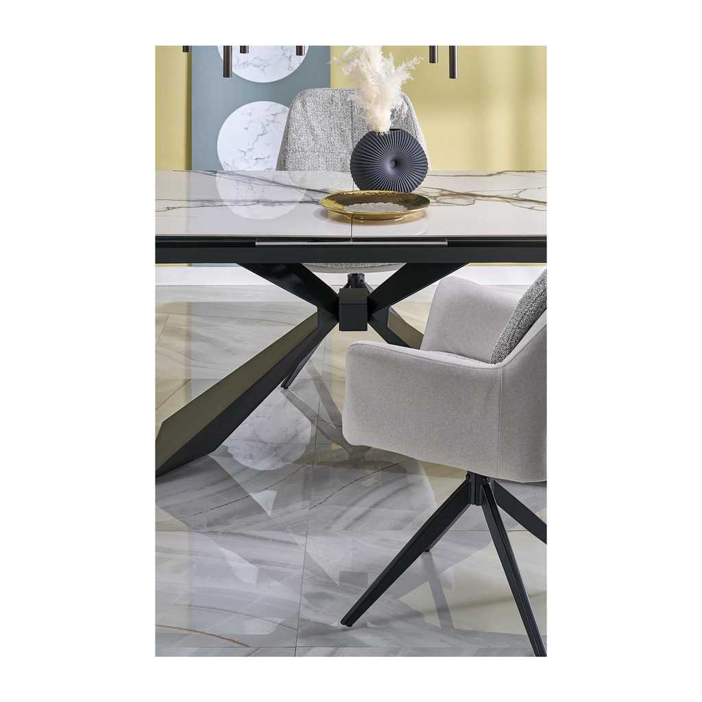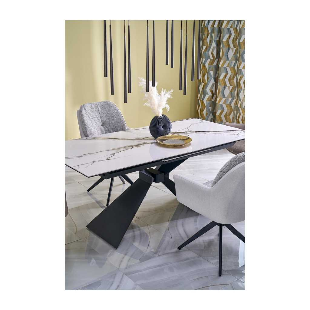 Jedálenský stôl Amir predstavuje ideálne riešenie pre moderné domácnosti, ktoré hľadajú kombináciu dizajnu a funkčnosti. Vďaka rozkladacej funkcii sa stôl jednoducho prispôsobí počtu hostí, čo oceníte pri rodinných večeriach alebo spoločných chvíľach s priateľmi. Povrchová doska je vyrobená z kvalitnej keramiky a skla, ktorá zabezpečuje odolnosť voči poškriabaniu a jednoduchú údržbu, zatiaľ čo kovová podnož dodáva stolíku stabilitu a pevnosť.