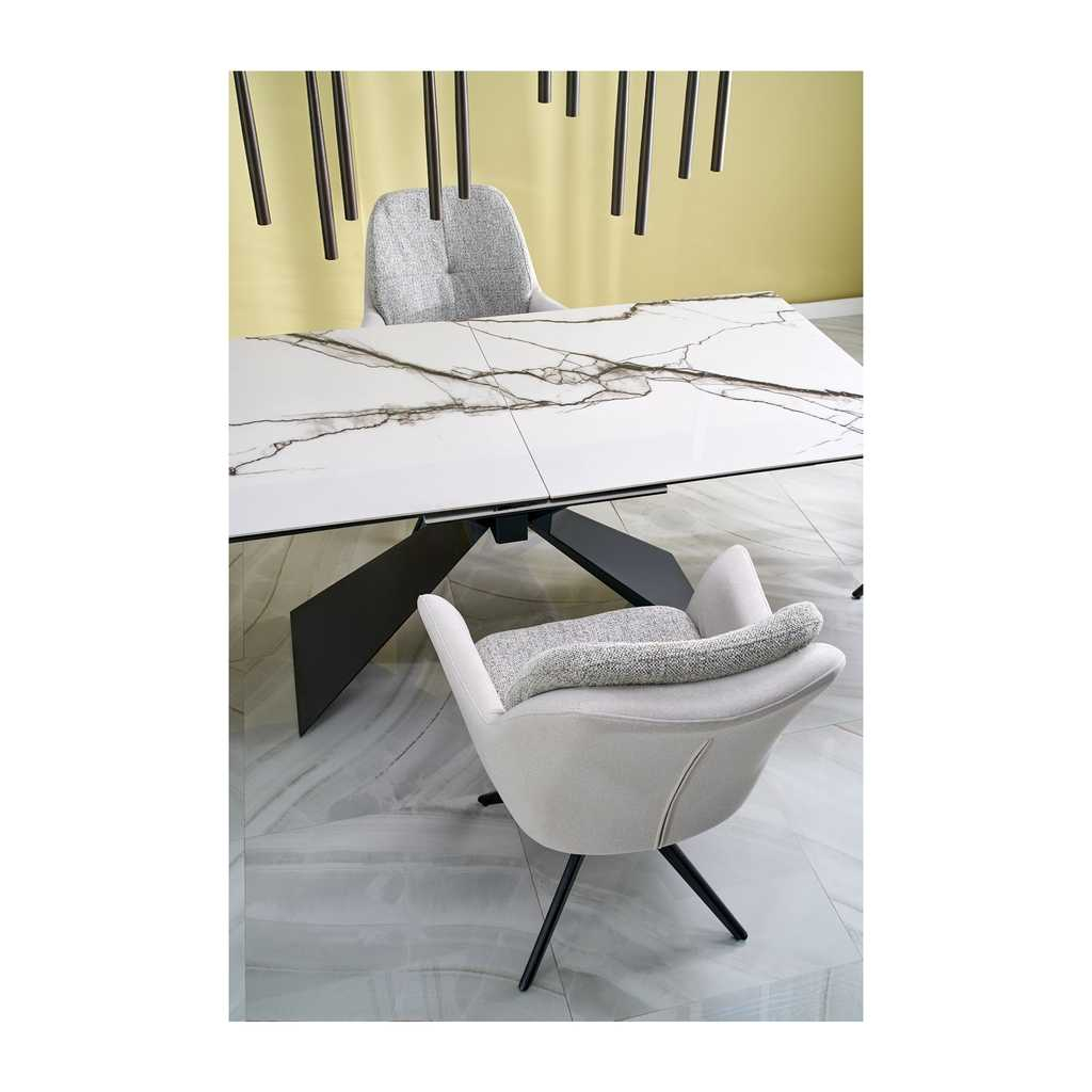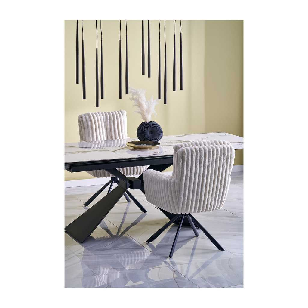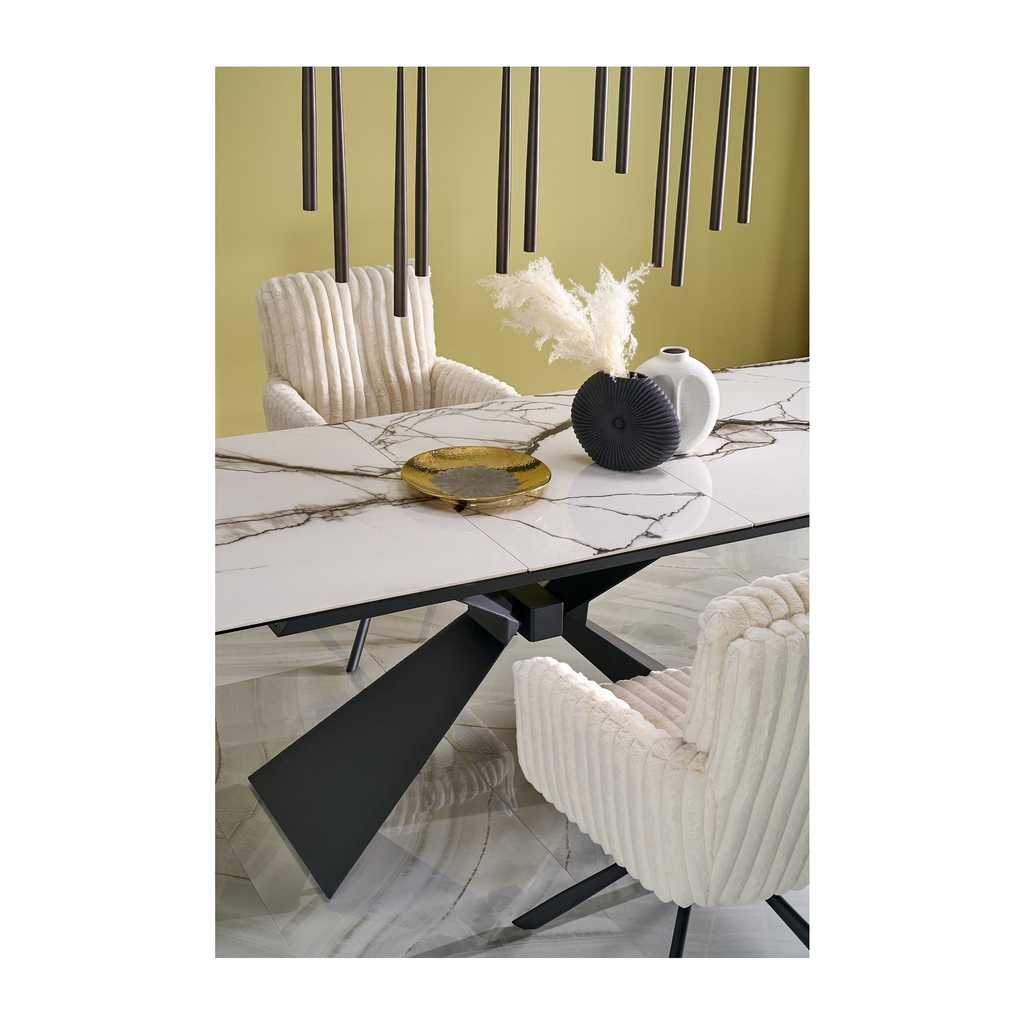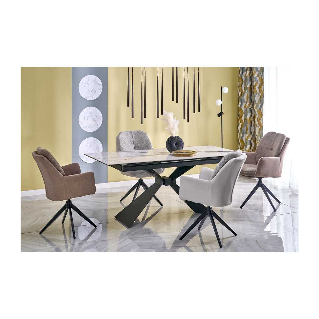 Jedálenský stôl Amir predstavuje ideálne riešenie pre moderné domácnosti, ktoré hľadajú kombináciu dizajnu a funkčnosti. Vďaka rozkladacej funkcii sa stôl jednoducho prispôsobí počtu hostí, čo oceníte pri rodinných večeriach alebo spoločných chvíľach s priateľmi. Povrchová doska je vyrobená z kvalitnej keramiky a skla, ktorá zabezpečuje odolnosť voči poškriabaniu a jednoduchú údržbu, zatiaľ čo kovová podnož dodáva stolíku stabilitu a pevnosť.