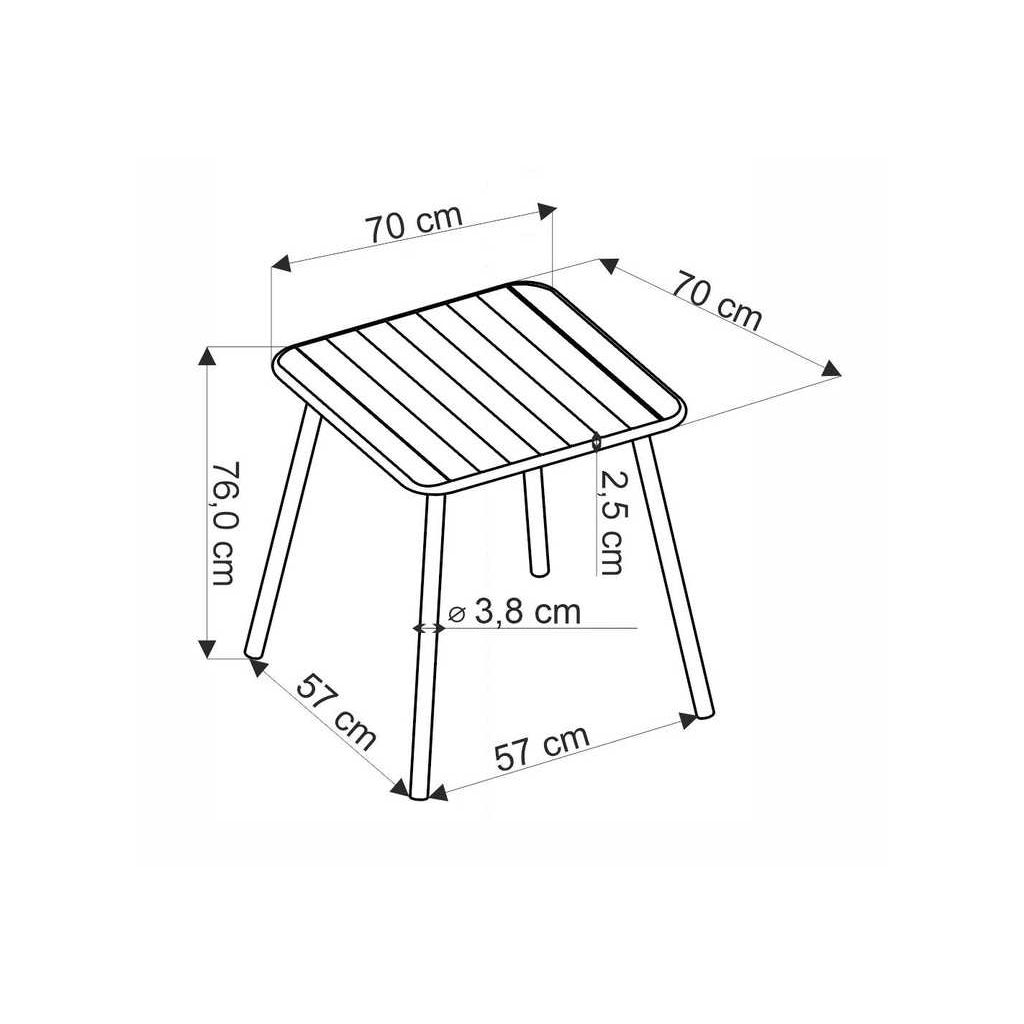 Stolová doska má rozmery 70 × 70 cm a výška dosky stola je 76 cm. Pri tejto veľkosti stola sa pohodlne usadia 4 osoby.