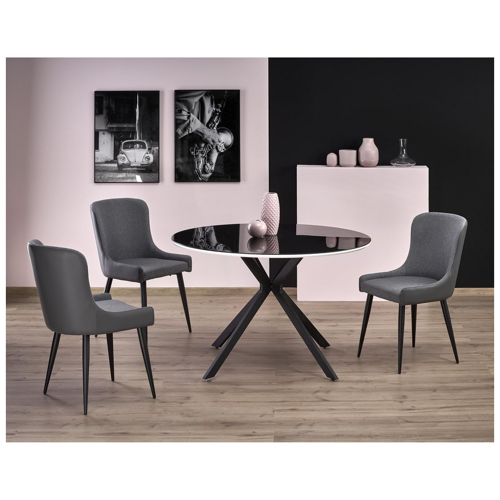 Ponúka dostatok priestoru k usadeniu 4 osôb naraz. Jeho konštrukcia sa skladá z guľatej hornej dosky zo skla a lakovaných MDF dosiek a z podnože z MDF dosiek v kombinácií s práškovanou oceľou. Nosnosť tohto jedálenského stolu je 40 kg.