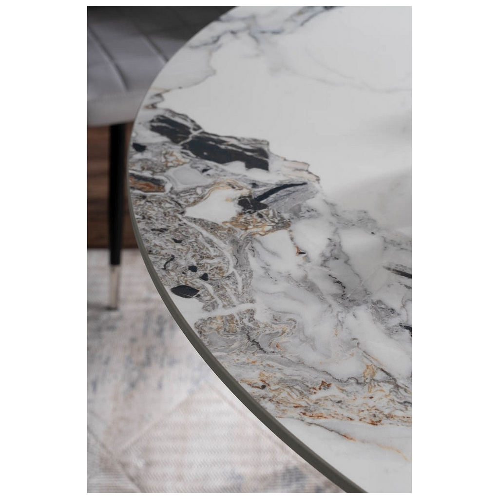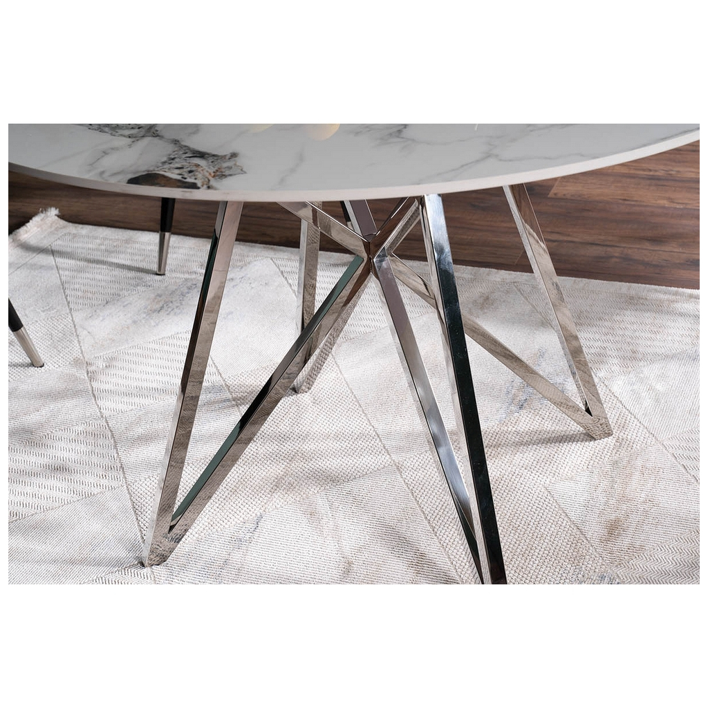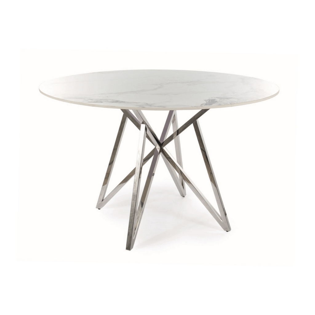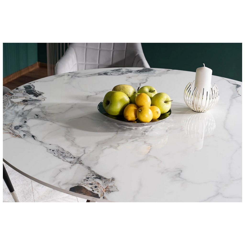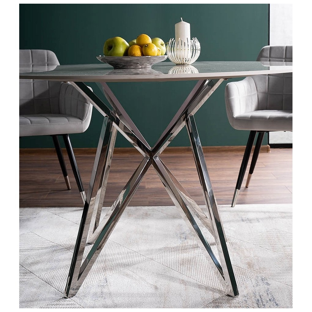 Jeho okrúhla doska z keramiky s priemerom 120 cm vás oslní sofistikovaným efektom mramoru. Dosku stola podopiera nevšedne riešená podnož. Tú tvoria krížiace sa kovové tyče. Celok je dokonalou kombináciou elegancie a odolnosti.