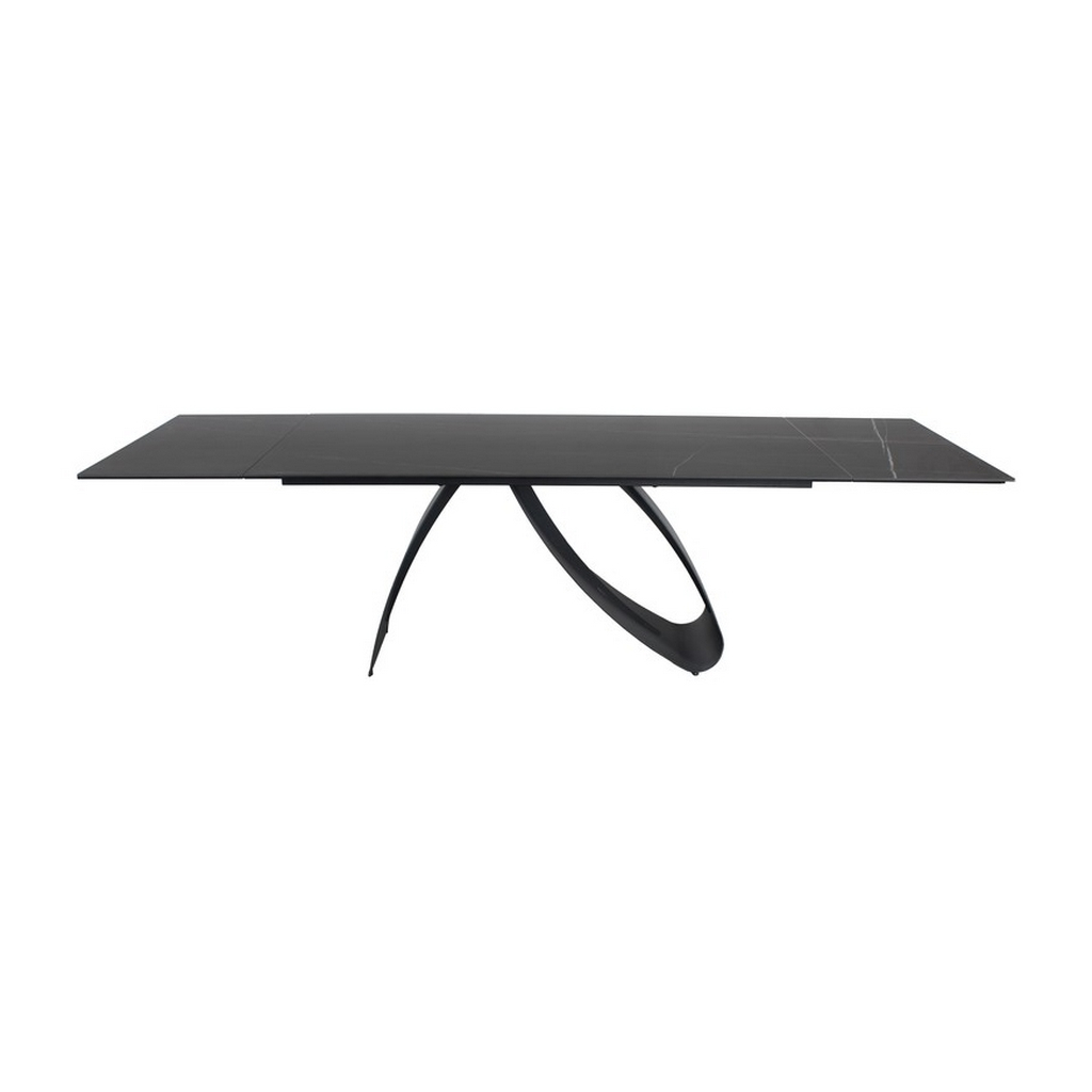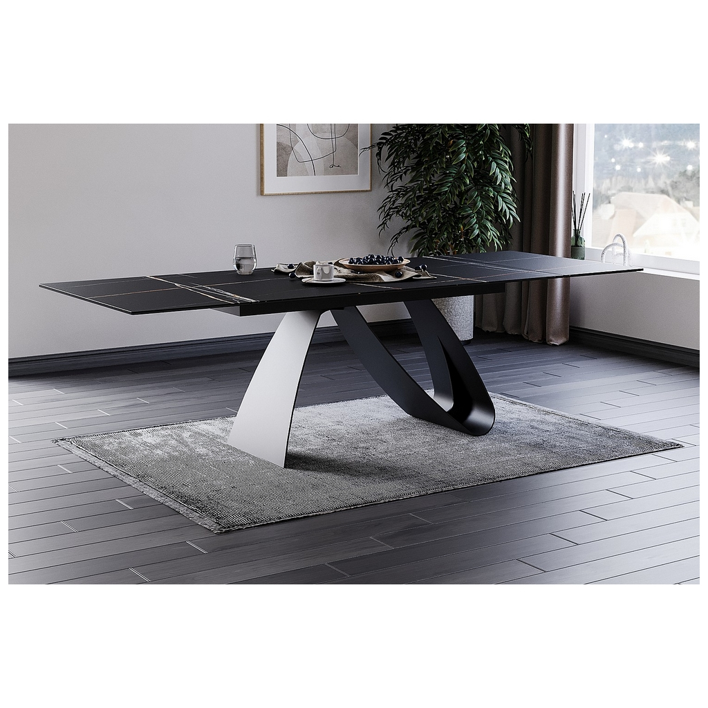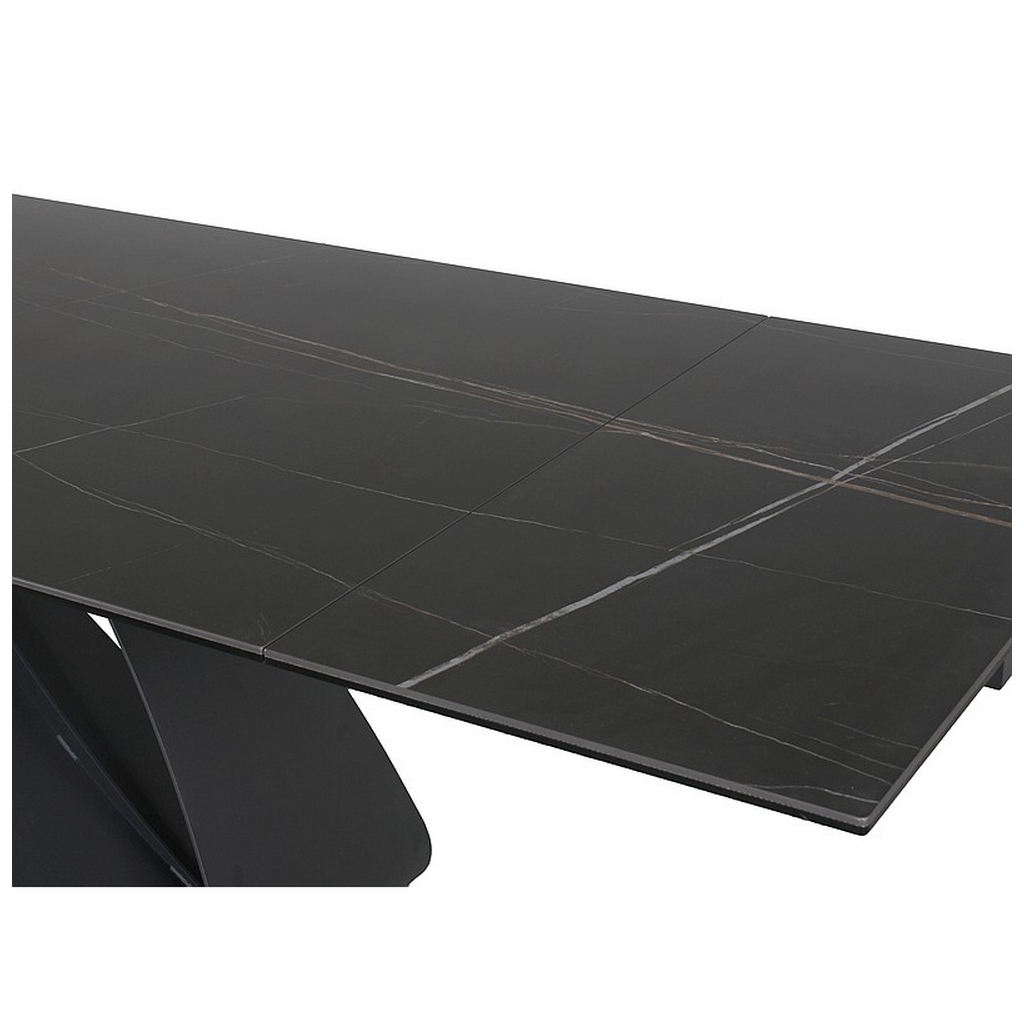 Doska stola je vyrobená z tvrdeného skla a talianskej keramiky. Tieto materiály sa spájajú, aby vytvorili mimoriadne odolný, ale aj vizuálne úchvatný povrch. Efekt prepychu umocňuje dekor mramoru Sahara Noir.