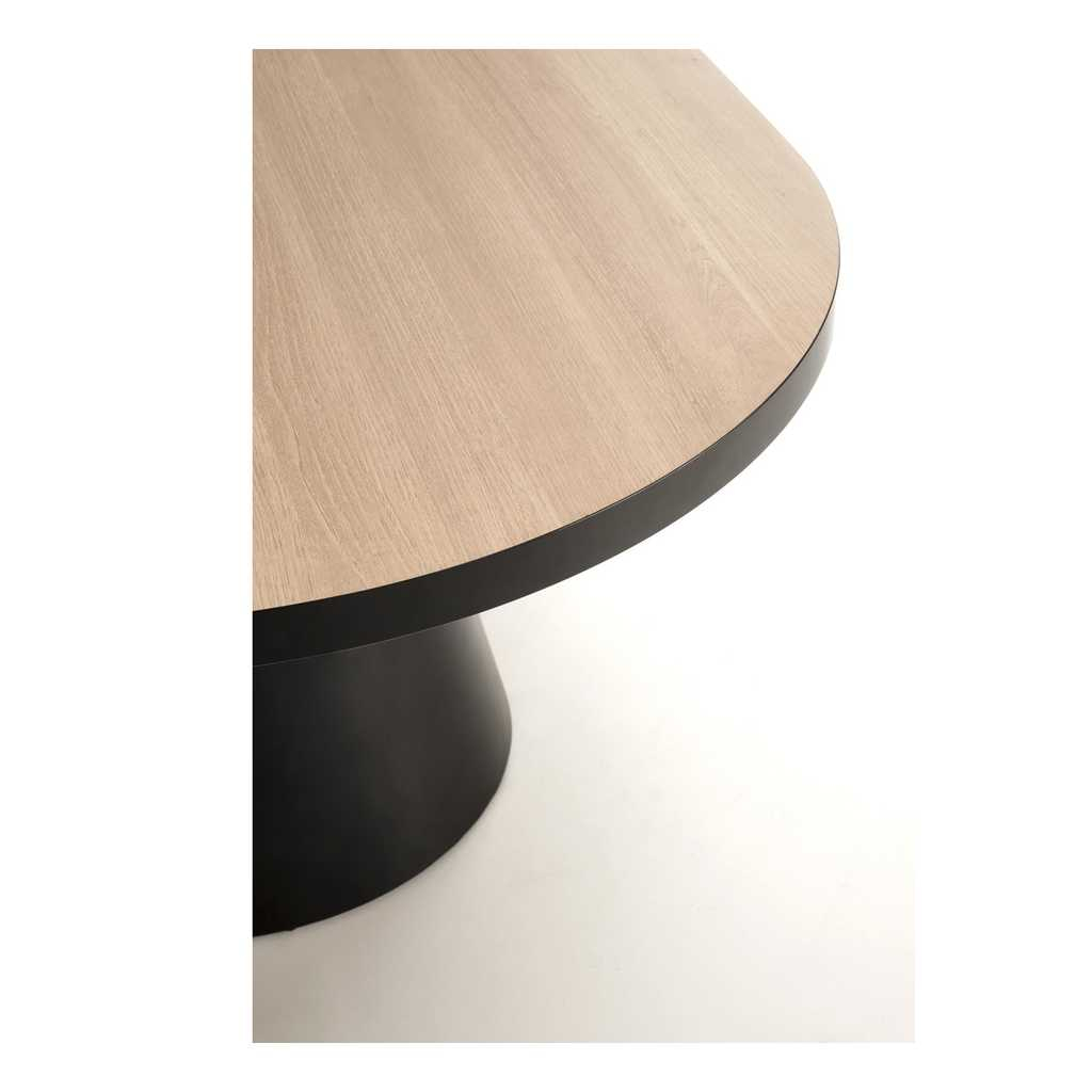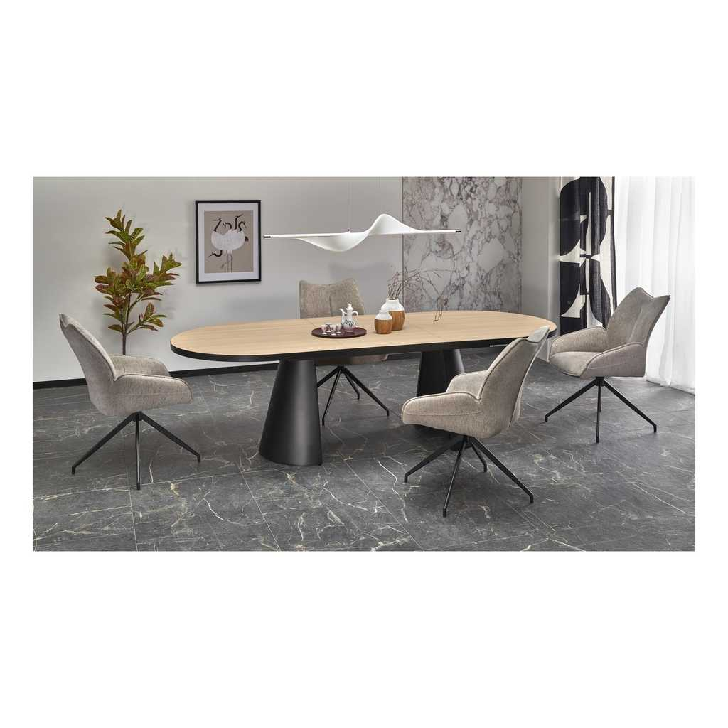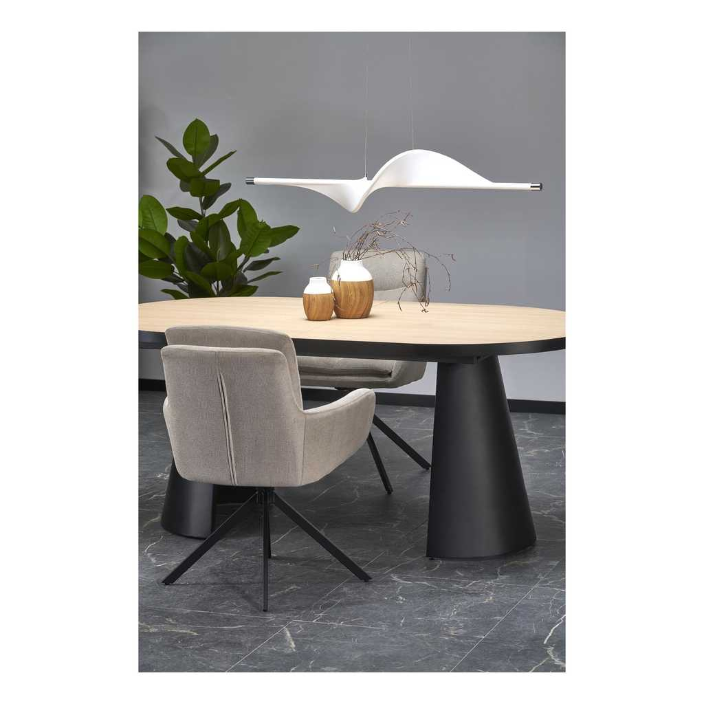 Podnož stola tvoria výrazné masívne oceľové nohy s práškovou povrchovou úpravou. Tieto nohy majú zaujímavý a robustný tvar, ktorý dodáva stolu nielen stabilitu, ale aj jedinečný vizuálny charakter. Čierna oceľová konštrukcia nádherne kontrastuje so svetlou vrchnou doskou, čím vytvára sofistikovaný a zároveň moderný vzhľad.