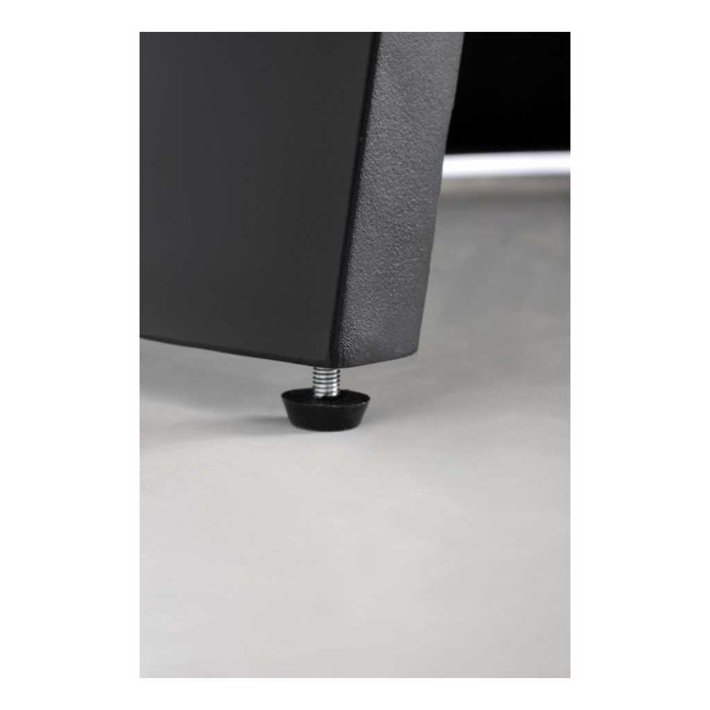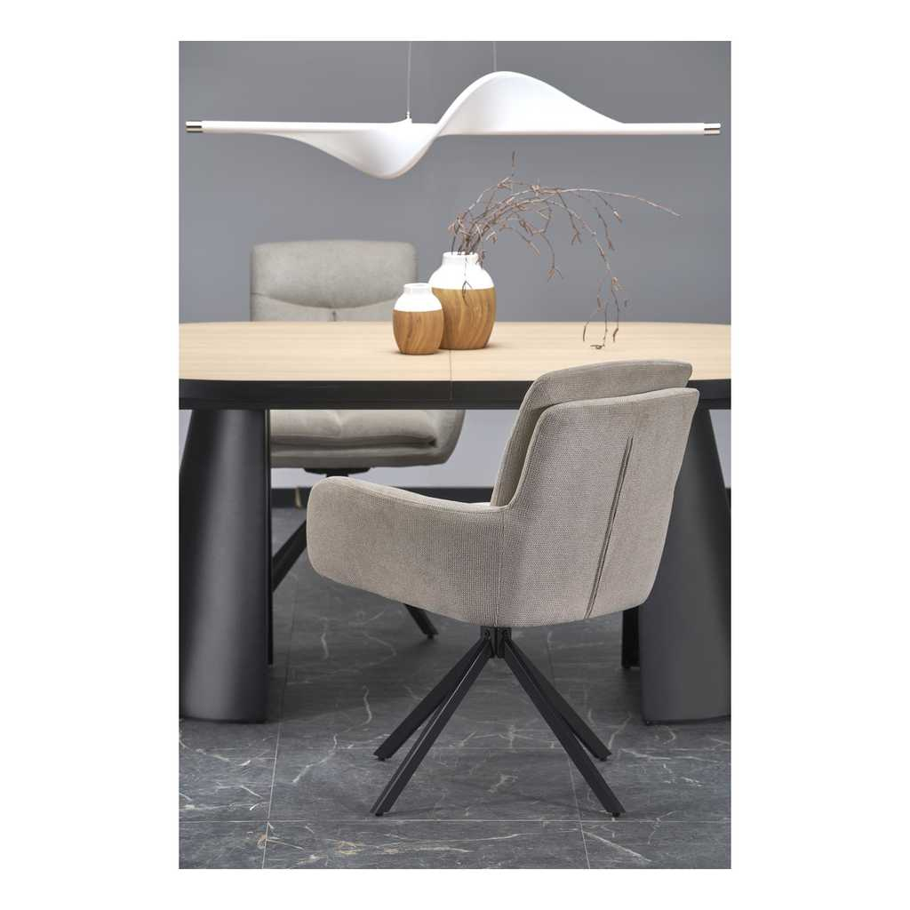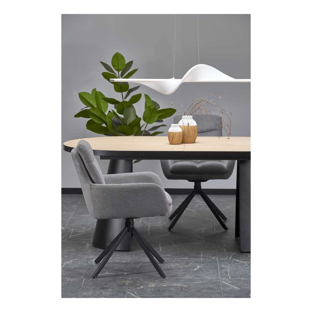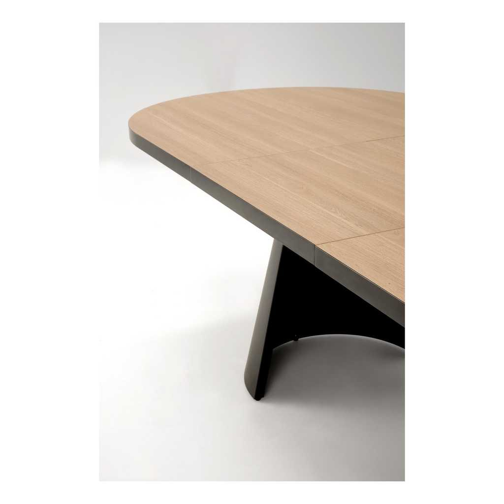 Podnož stola tvoria výrazné masívne oceľové nohy s práškovou povrchovou úpravou. Tieto nohy majú zaujímavý a robustný tvar, ktorý dodáva stolu nielen stabilitu, ale aj jedinečný vizuálny charakter. Čierna oceľová konštrukcia nádherne kontrastuje so svetlou vrchnou doskou, čím vytvára sofistikovaný a zároveň moderný vzhľad.