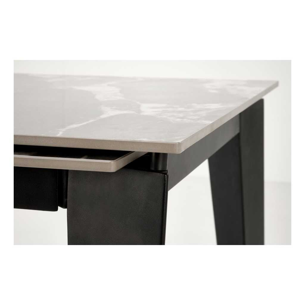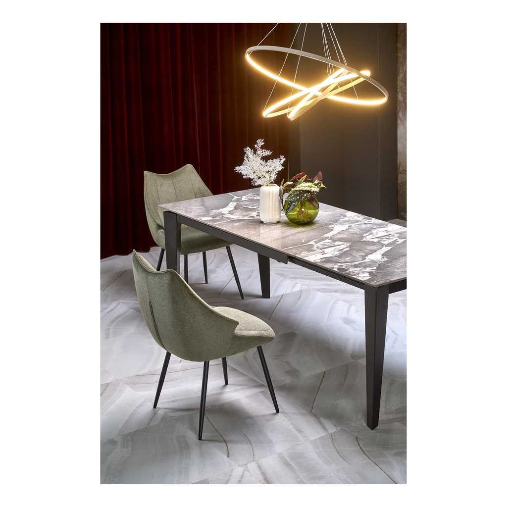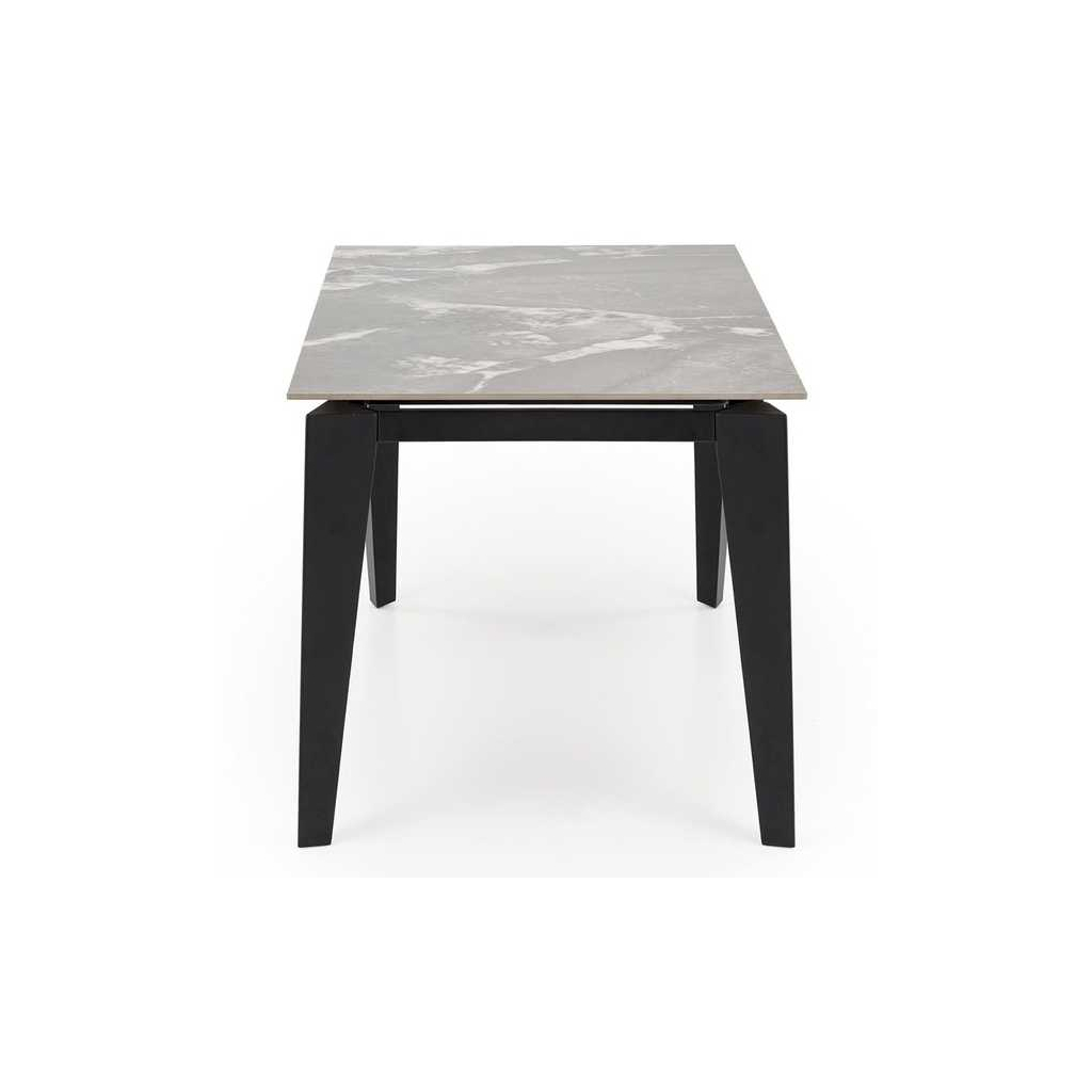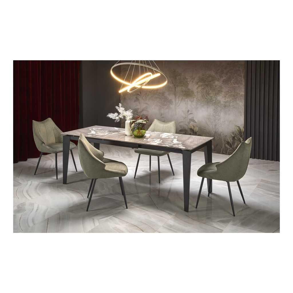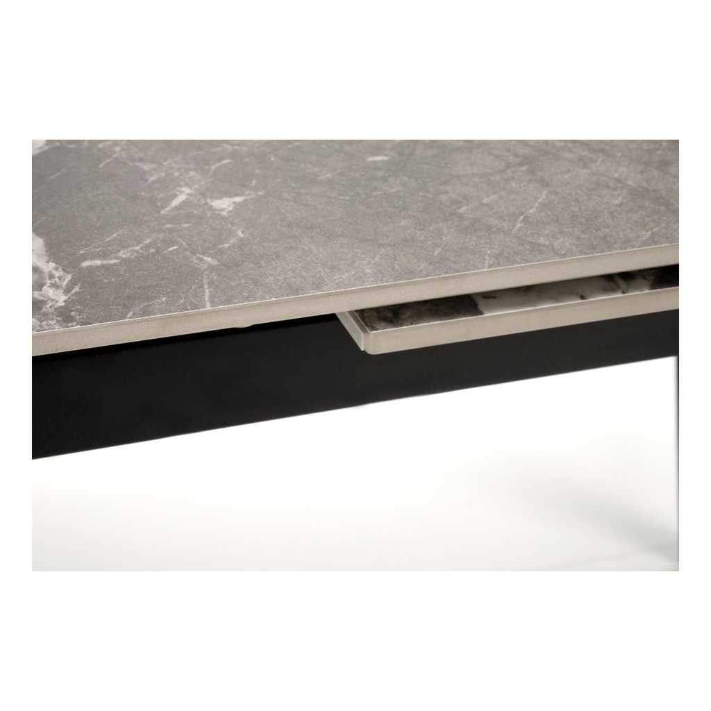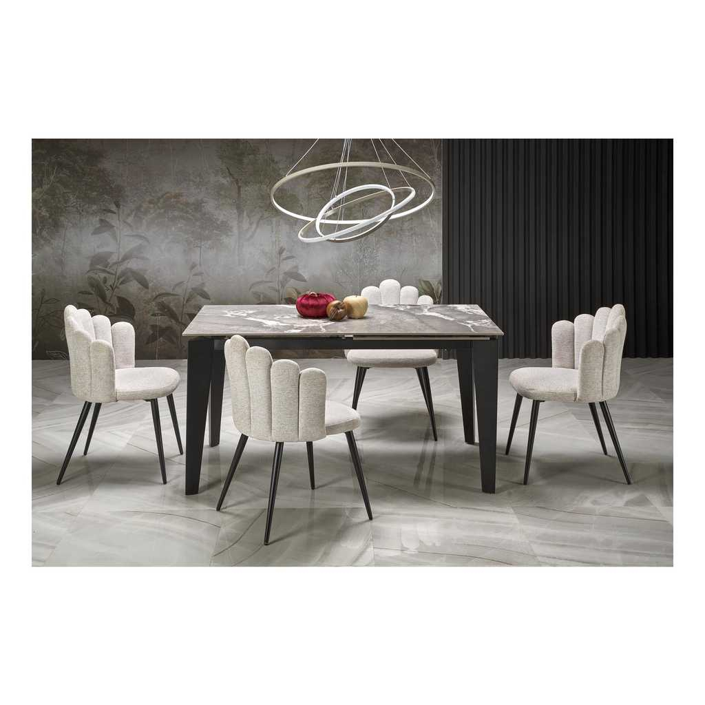 Doska stola je vyrobená zo sintra, vizuálne ohromujúci povrch vytvára dekor mramoru. Stabilitu a eleganciu stolu dodáva jeho oceľová podnož s práškovým nástrekom, ktorú tvoria 4 nohy. Napriek svojej pevnosti pôsobí podnož vzdušne a zabezpečuje dokonalé ukotvenie stola k podlahe. Celá konštrukcia stola je navrhnutá tak, aby uniesla 40 kg dobrôt.