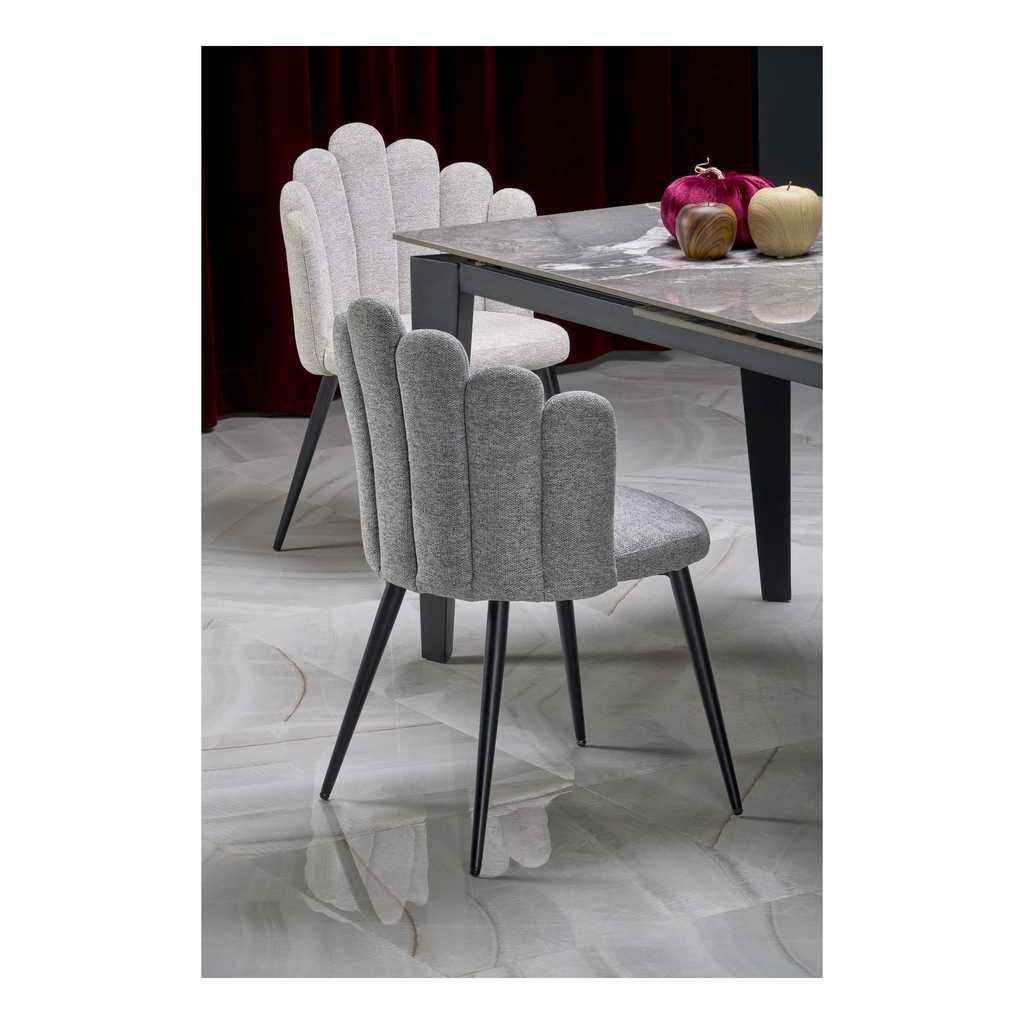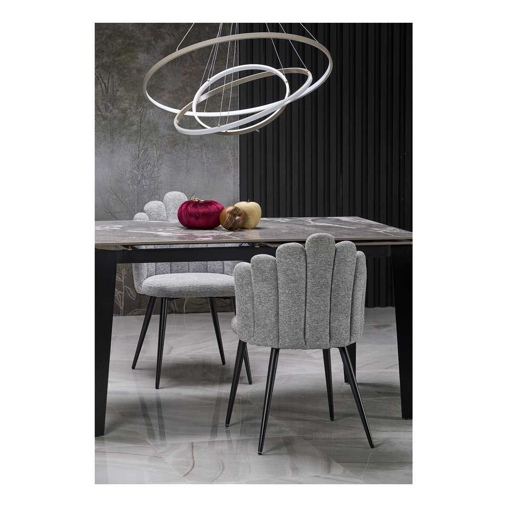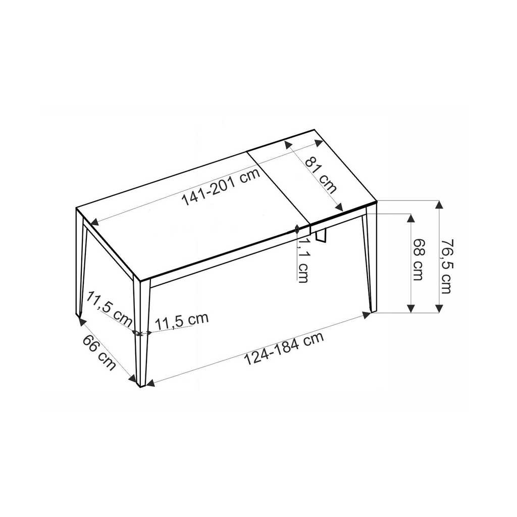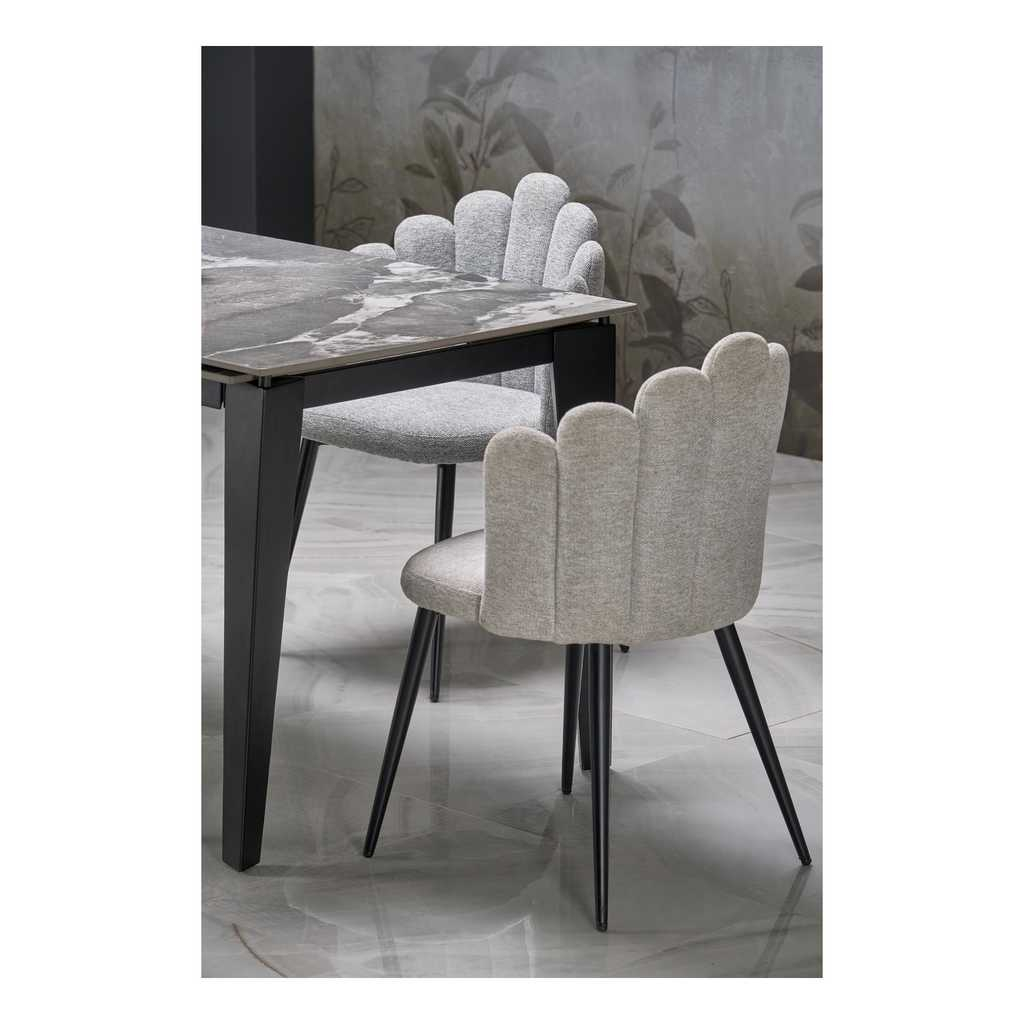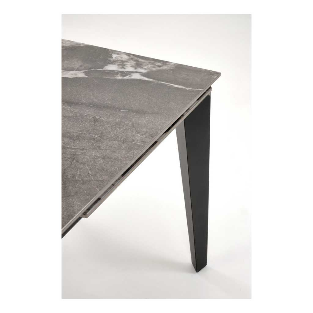 Doska stola je vyrobená zo sintra, vizuálne ohromujúci povrch vytvára dekor mramoru. Stabilitu a eleganciu stolu dodáva jeho oceľová podnož s práškovým nástrekom, ktorú tvoria 4 nohy. Napriek svojej pevnosti pôsobí podnož vzdušne a zabezpečuje dokonalé ukotvenie stola k podlahe. Celá konštrukcia stola je navrhnutá tak, aby uniesla 40 kg dobrôt.