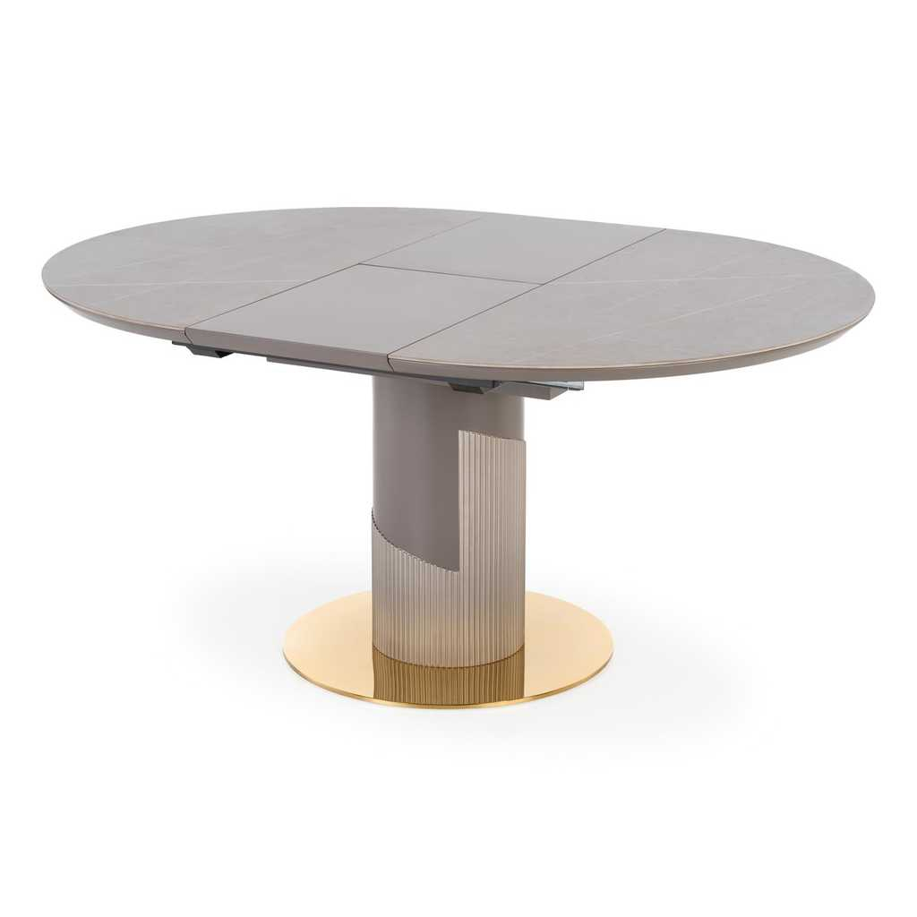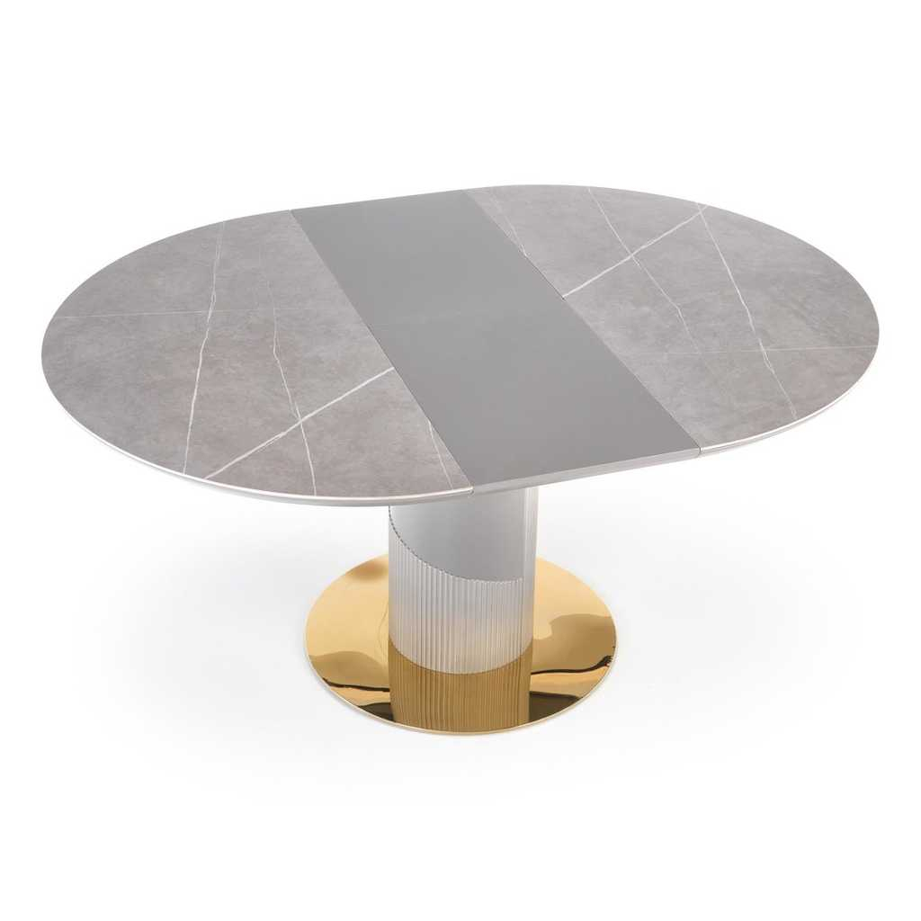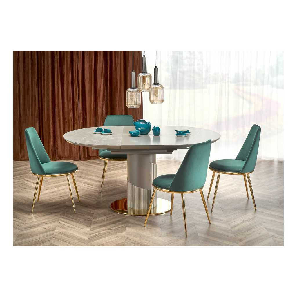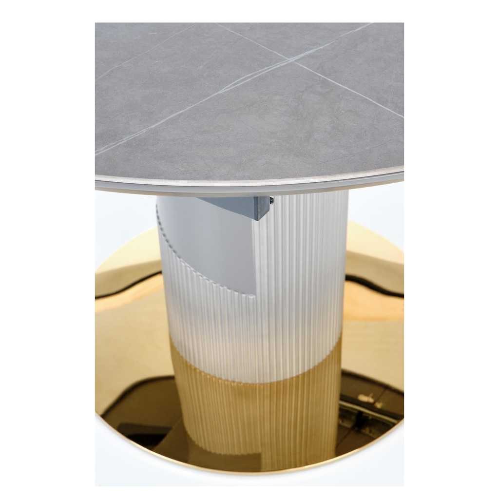 Doska stola je vyrobená z lakovanej MDF a keramiky s efektným mramorovým povrchom. Stabilitu a honosnosť stolu dodáva jeho podnož z chrómovanej ocele a plastu. Zlatá podnož je dizajnovým prvkom a zároveň zabezpečuje pevné ukotvenie stola k podlahe. Celá konštrukcia stola je navrhnutá tak, aby zvládla zaťaženie 60 kg dobrôt.