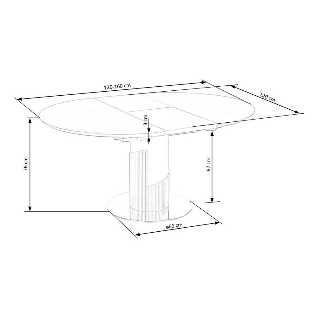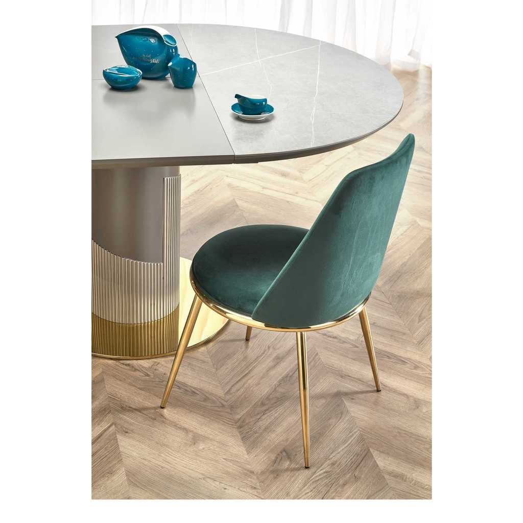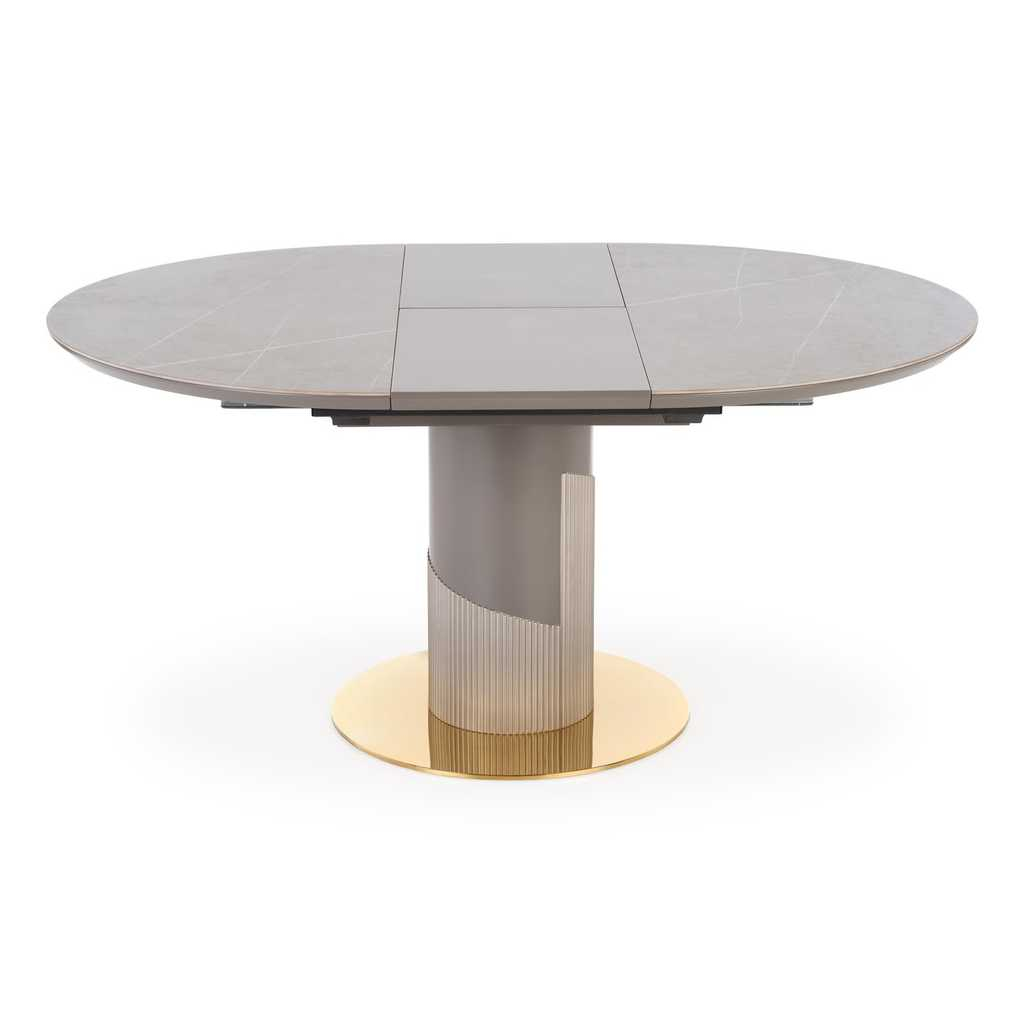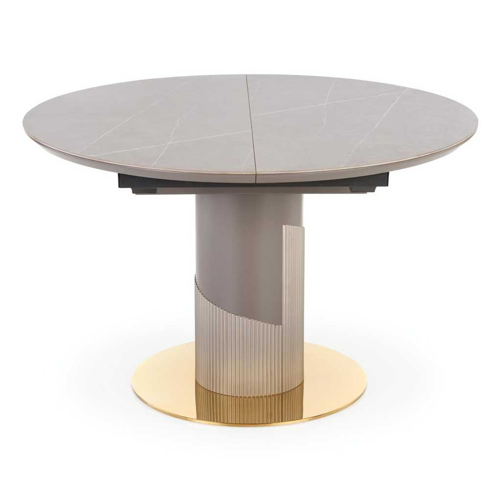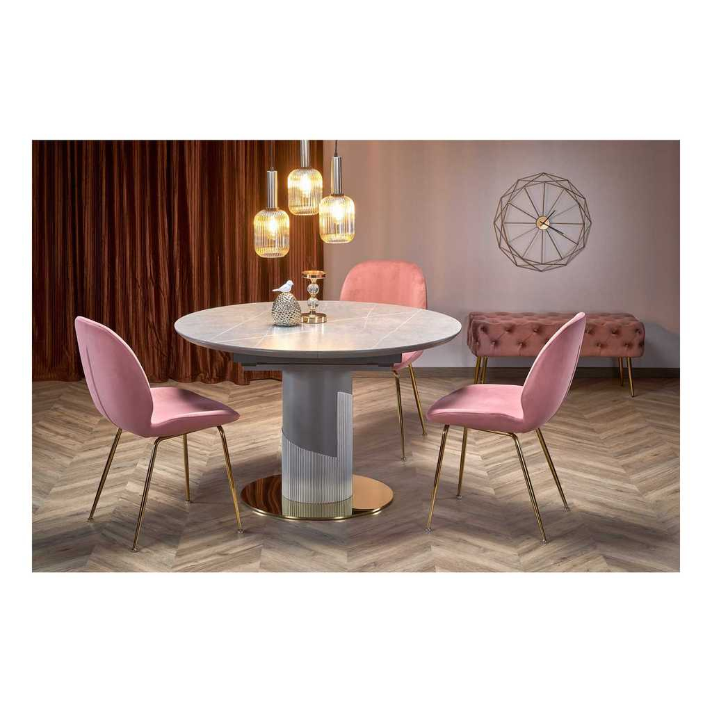 Doska stola je vyrobená z lakovanej MDF a keramiky s efektným mramorovým povrchom. Stabilitu a honosnosť stolu dodáva jeho podnož z chrómovanej ocele a plastu. Zlatá podnož je dizajnovým prvkom a zároveň zabezpečuje pevné ukotvenie stola k podlahe. Celá konštrukcia stola je navrhnutá tak, aby zvládla zaťaženie 60 kg dobrôt.