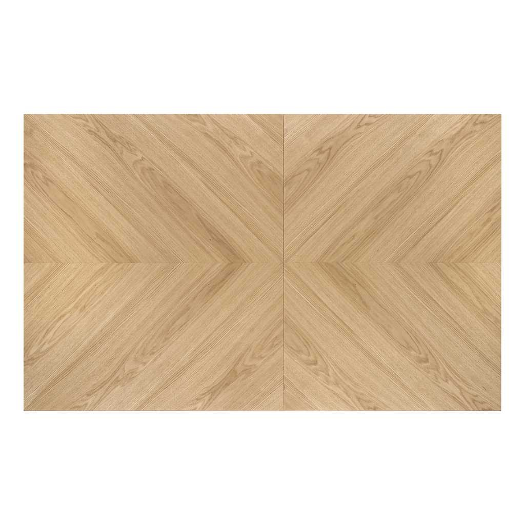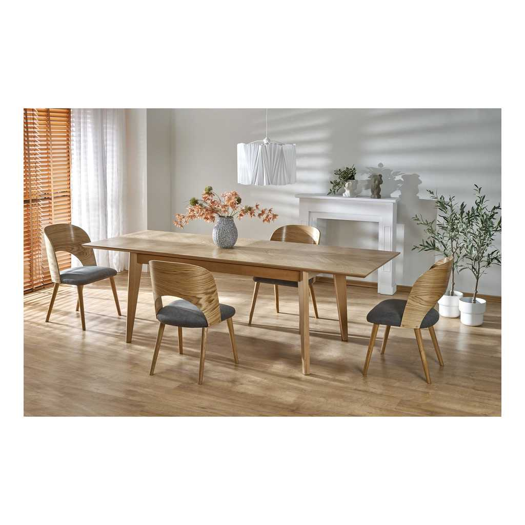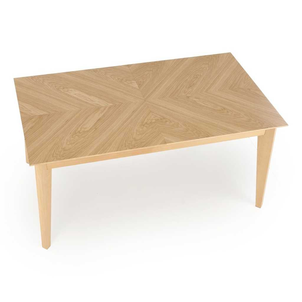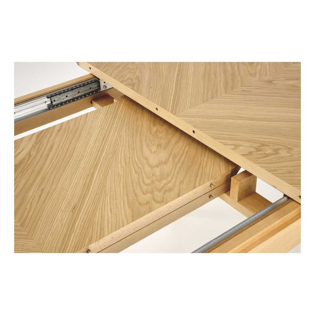 Obdĺžniková doska stola je vyrobená z drevotrieskovej dosky, ktorá je pokrytá prírodnou dubovou dyhou, čo jej dodáva autentický vzhľad dreva a zároveň zaručuje odolnosť a jednoduchú údržbu. Povrch dyhy má jemnú štruktúru, ktorá dodáva stolu príjemný a teplý vzhľad, ktorý vnáša do interiéru pocit pohodlia.