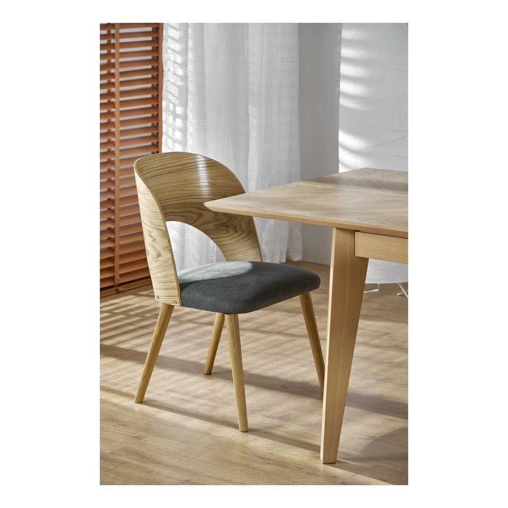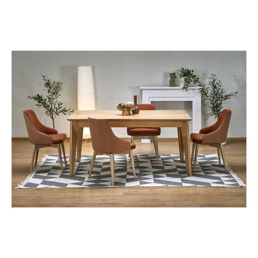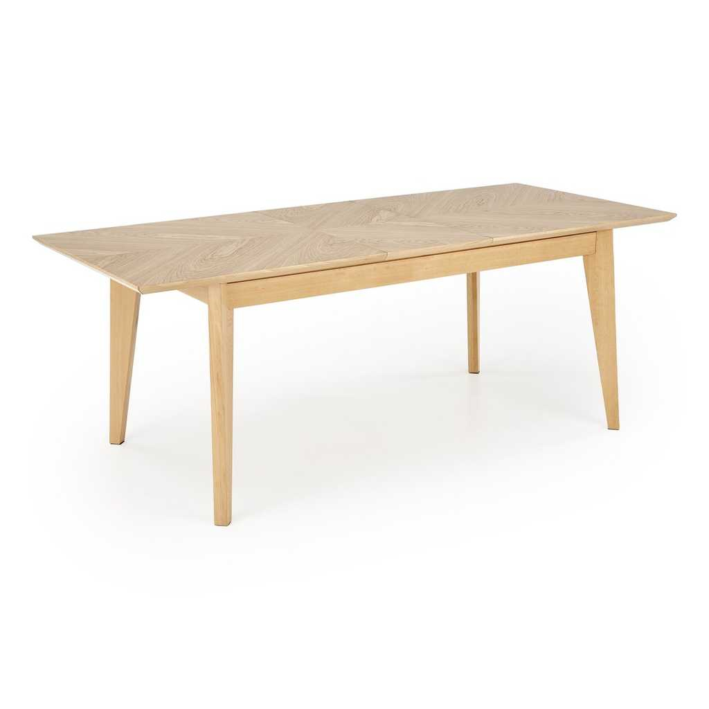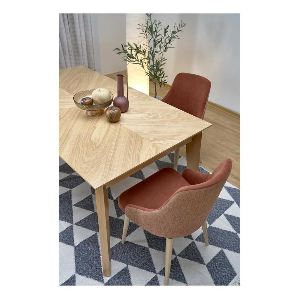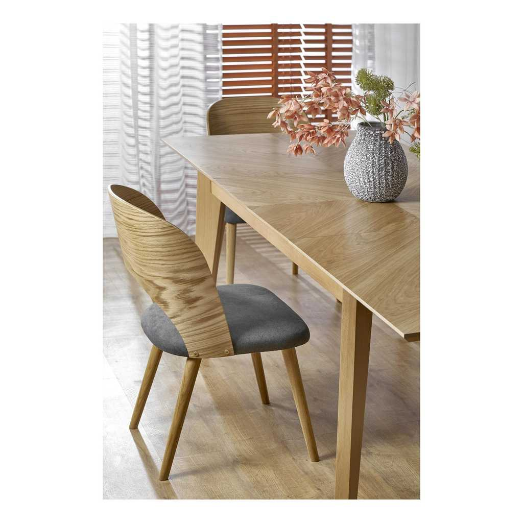 Obdĺžniková doska stola je vyrobená z drevotrieskovej dosky, ktorá je pokrytá prírodnou dubovou dyhou, čo jej dodáva autentický vzhľad dreva a zároveň zaručuje odolnosť a jednoduchú údržbu. Povrch dyhy má jemnú štruktúru, ktorá dodáva stolu príjemný a teplý vzhľad, ktorý vnáša do interiéru pocit pohodlia.