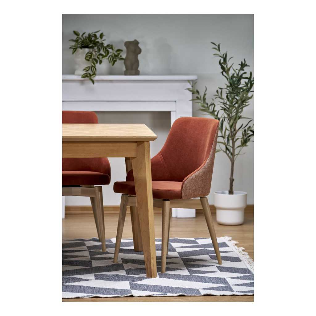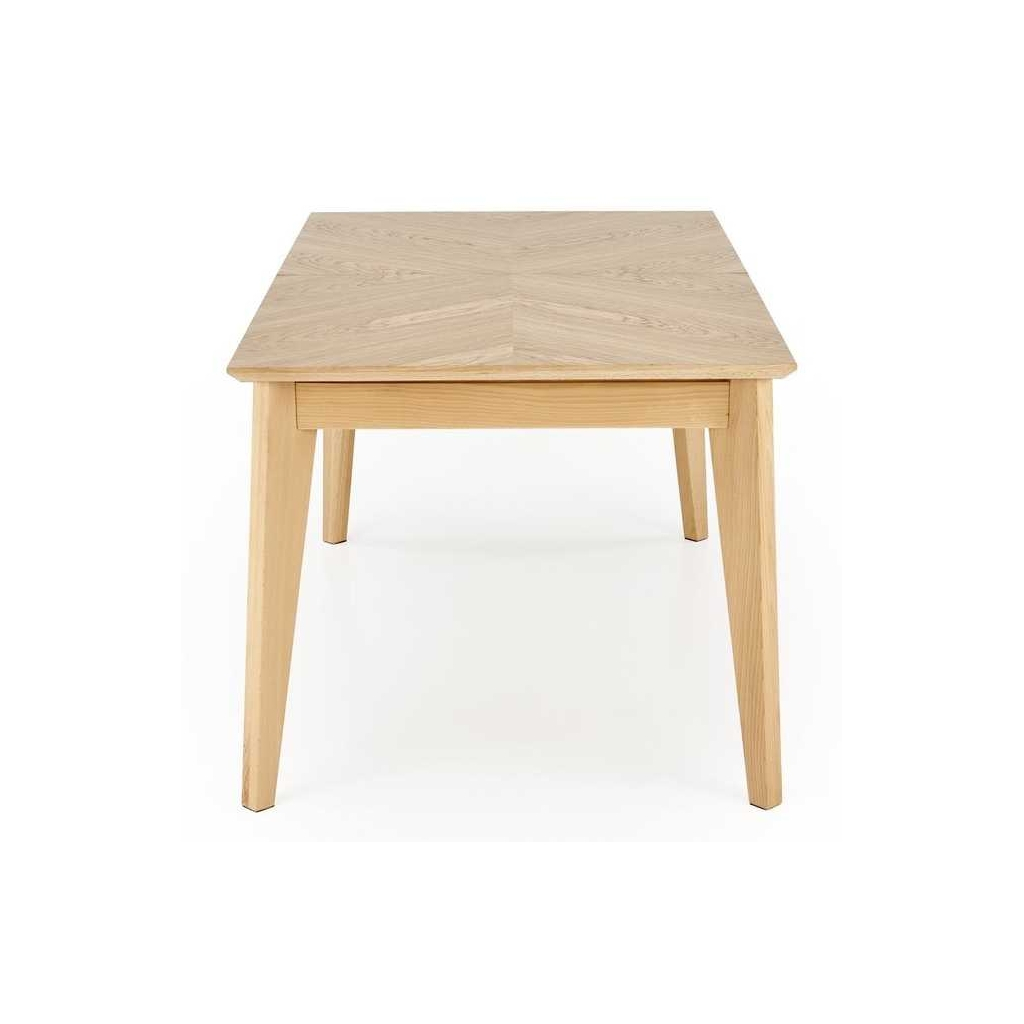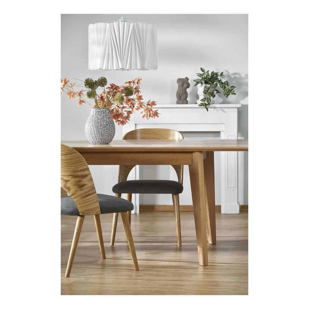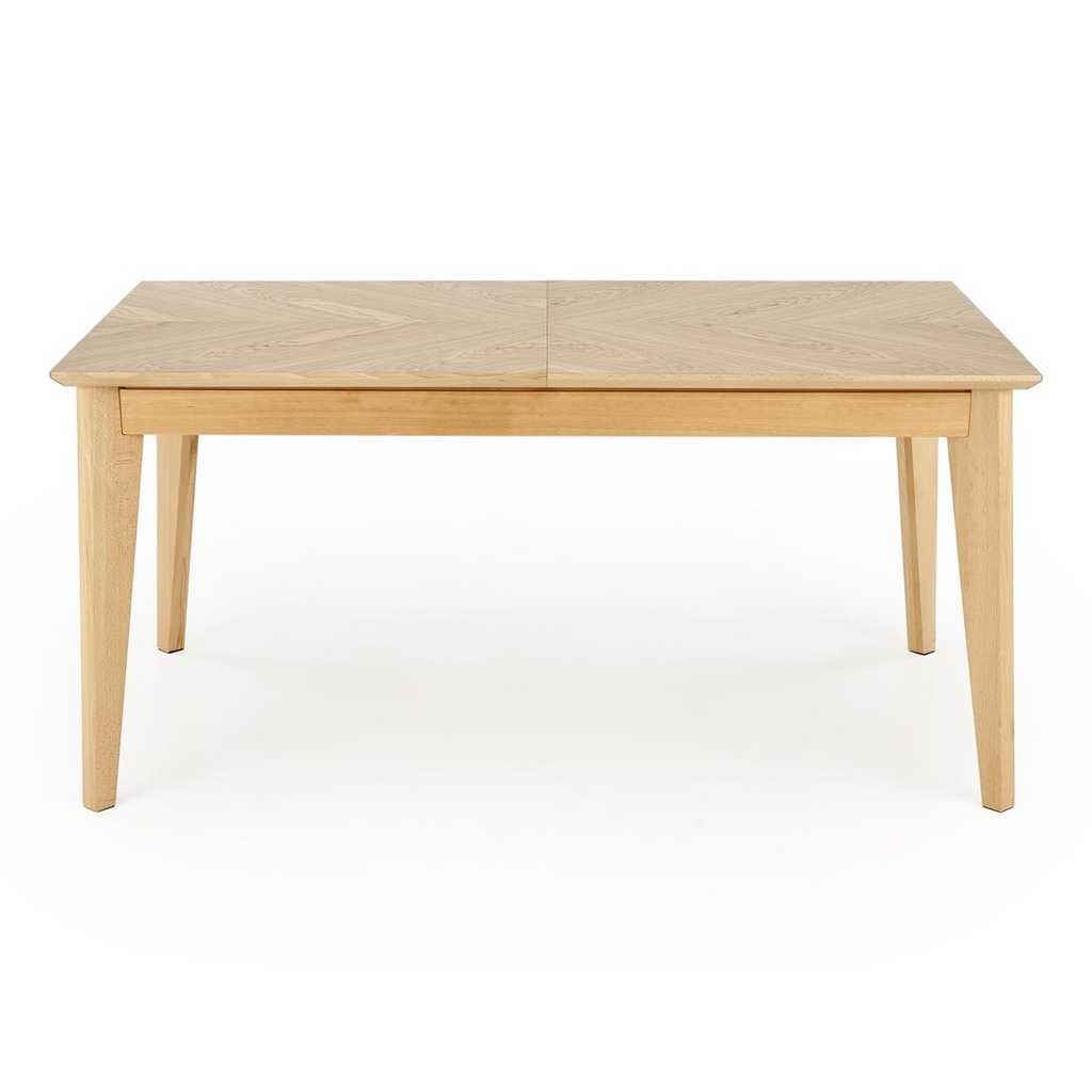 Obdĺžniková doska stola je vyrobená z drevotrieskovej dosky, ktorá je pokrytá prírodnou dubovou dyhou, čo jej dodáva autentický vzhľad dreva a zároveň zaručuje odolnosť a jednoduchú údržbu. Povrch dyhy má jemnú štruktúru, ktorá dodáva stolu príjemný a teplý vzhľad, ktorý vnáša do interiéru pocit pohodlia.