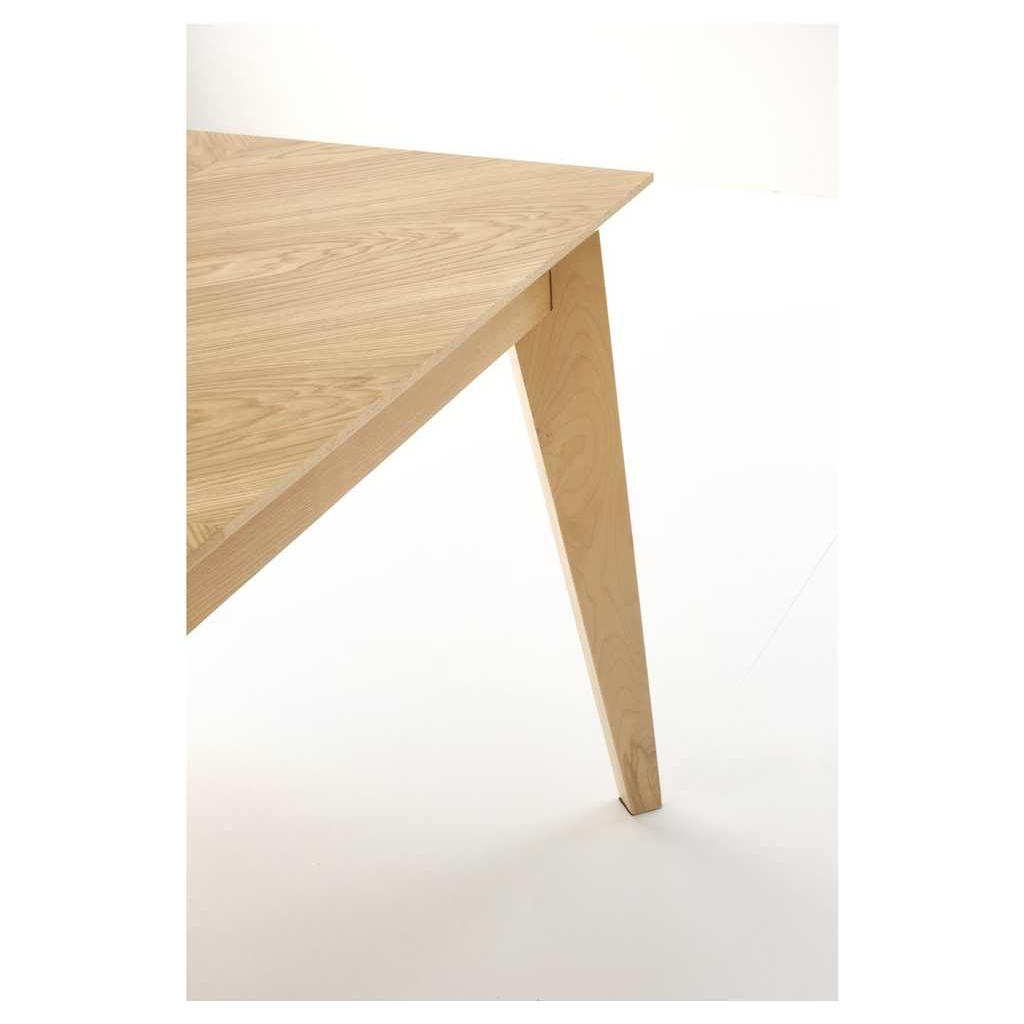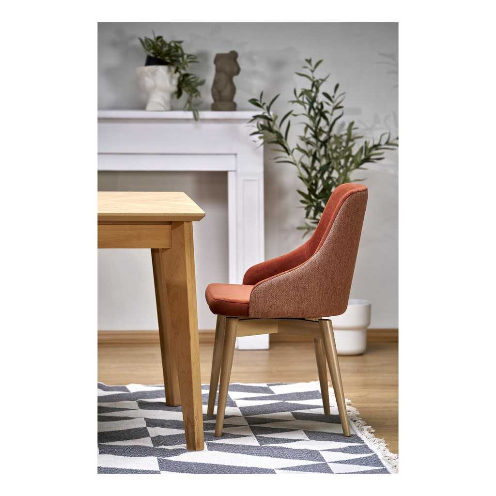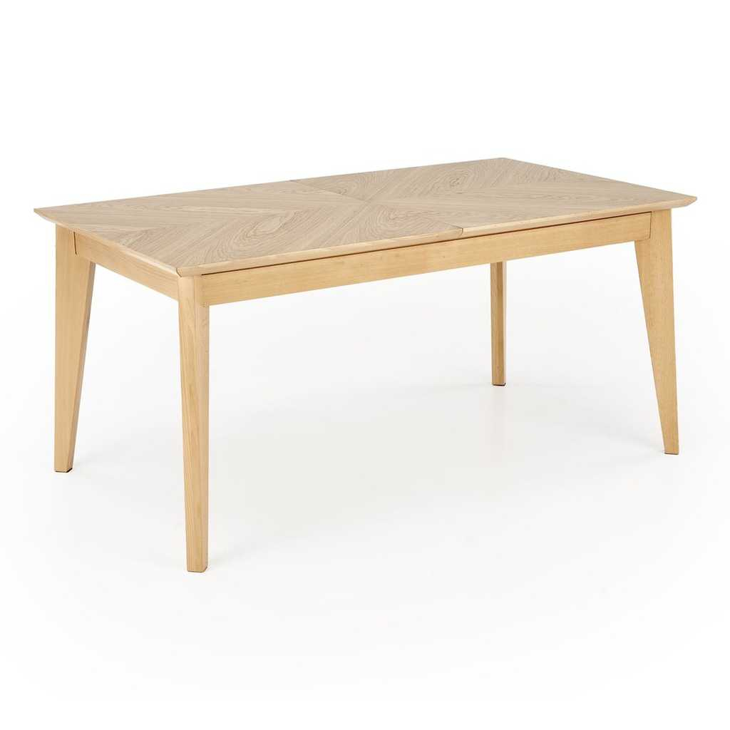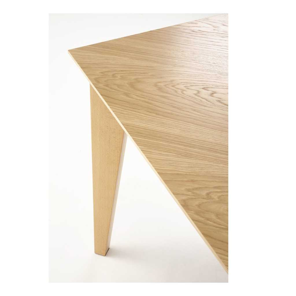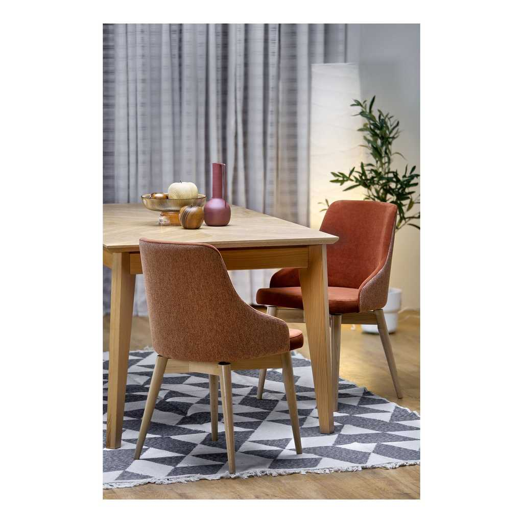Obdĺžniková doska stola je vyrobená z drevotrieskovej dosky, ktorá je pokrytá prírodnou dubovou dyhou, čo jej dodáva autentický vzhľad dreva a zároveň zaručuje odolnosť a jednoduchú údržbu. Povrch dyhy má jemnú štruktúru, ktorá dodáva stolu príjemný a teplý vzhľad, ktorý vnáša do interiéru pocit pohodlia.