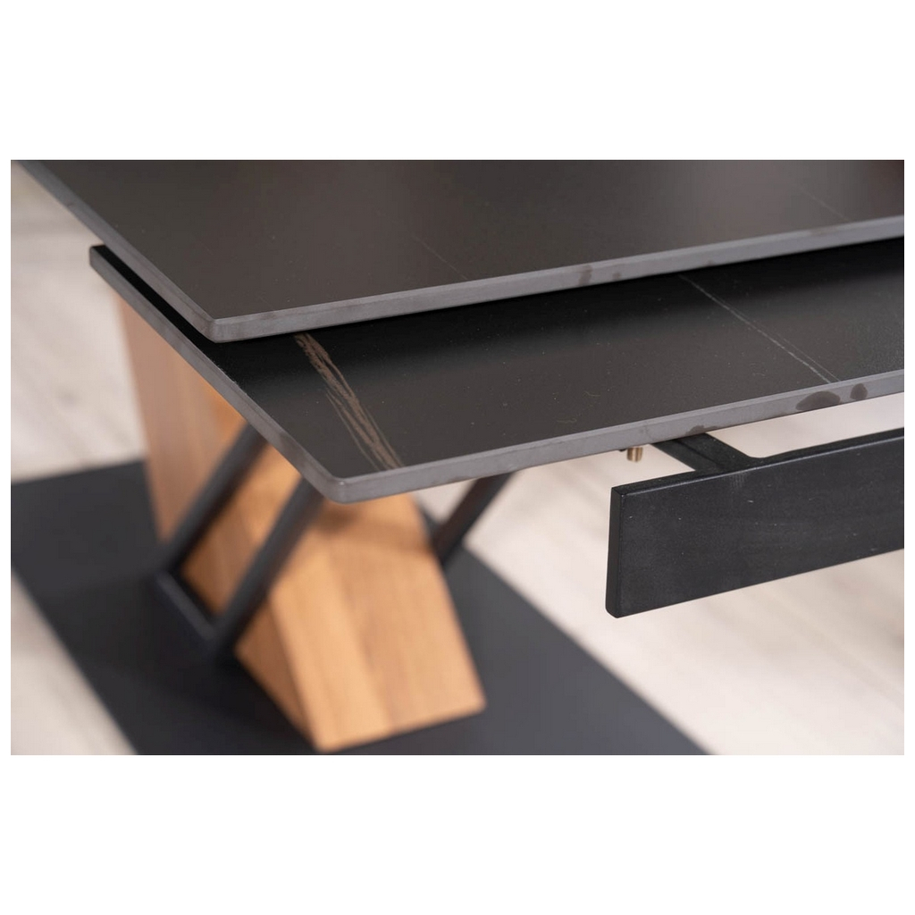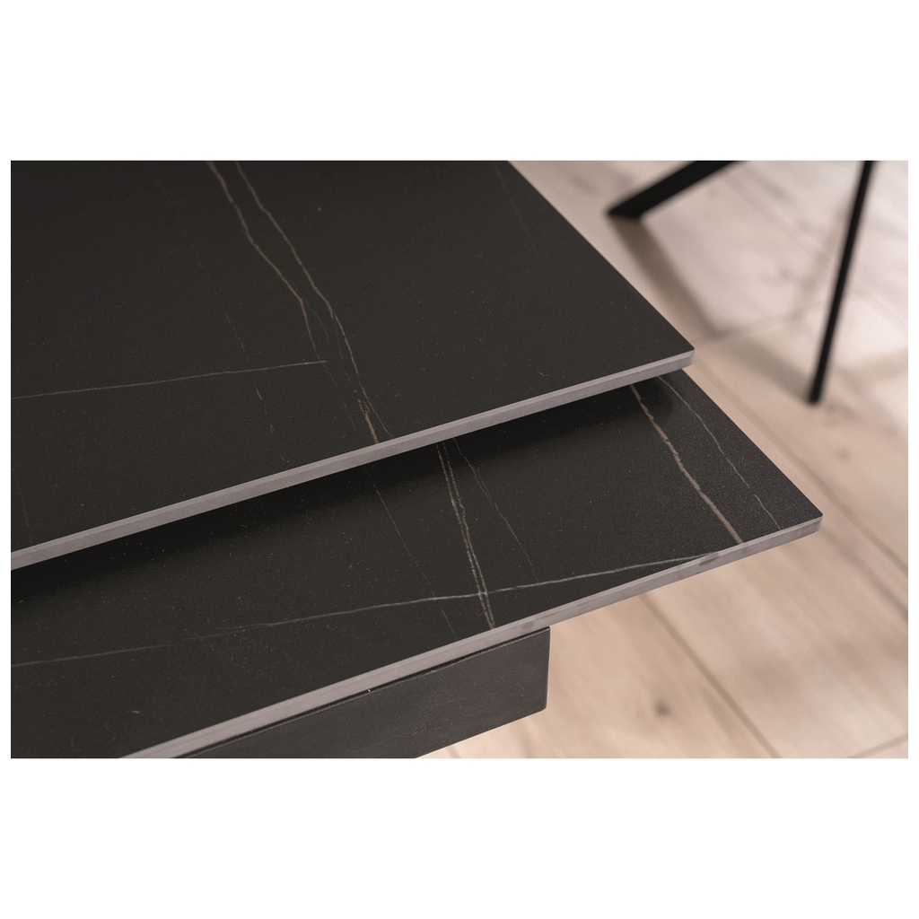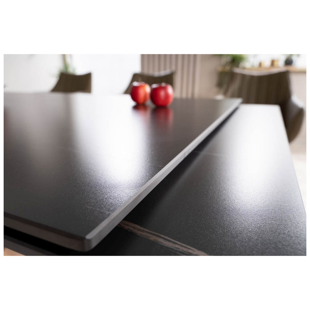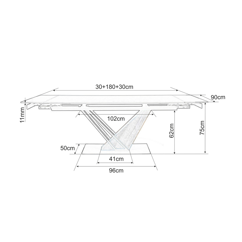 Doska stola je vyrobená z keramiky. Tá vytvára odolný, ale aj vizuálne úchvatný povrch. Efekt prepychu umocňuje dekor mramoru.