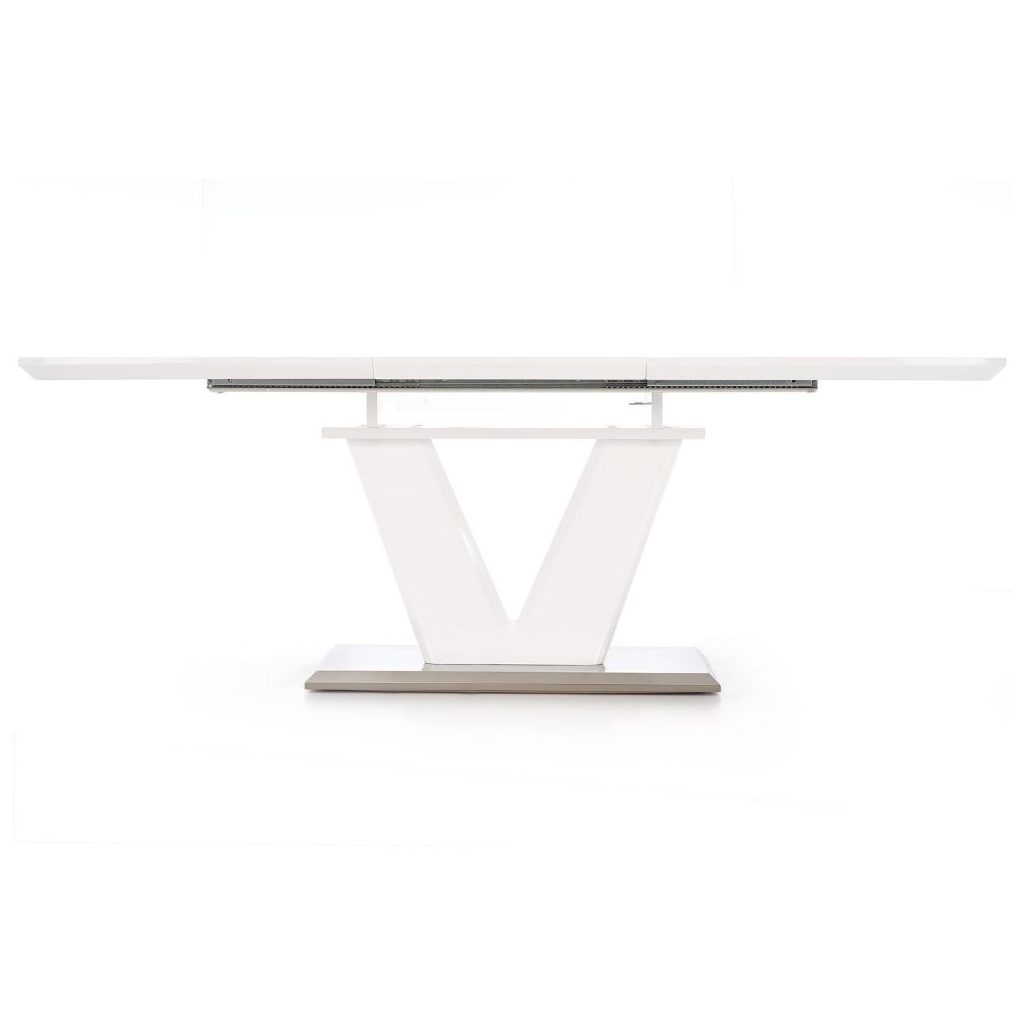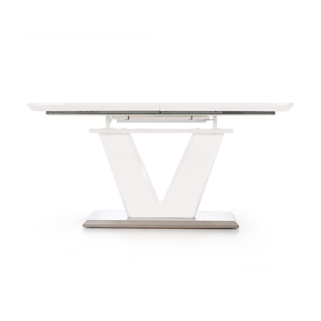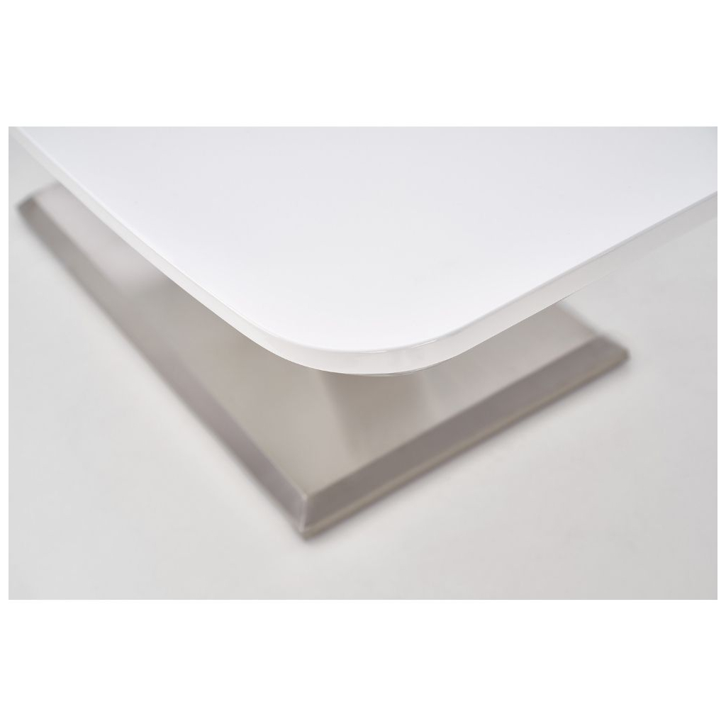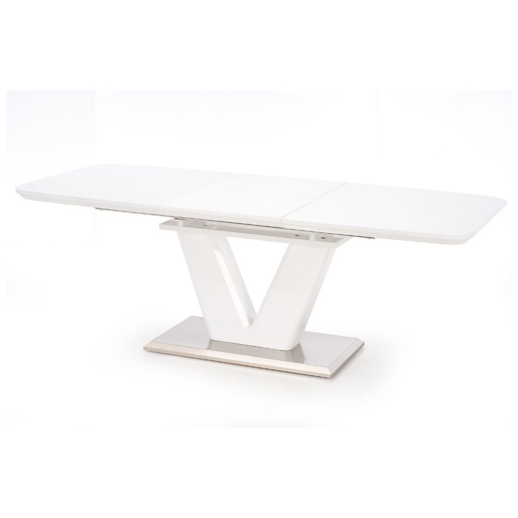 Robustná stolová doska je vyrobená z lakovanej MDF v bielej farbe. Noha stola je tvarovaná tak, aby neprekážala pri sedení a zároveň poskytovala stolu maximálnu stabilitu. Tú umocňuje jej povrchová úprava z nehrdzavejúcej ocele v bielej farbe.