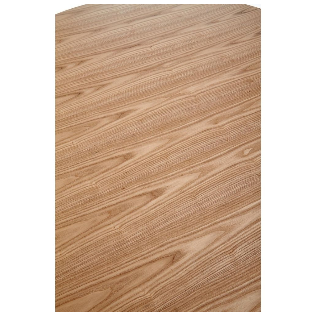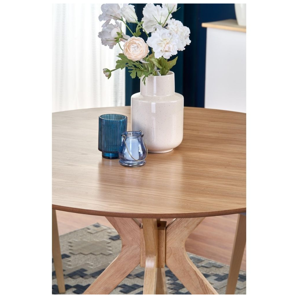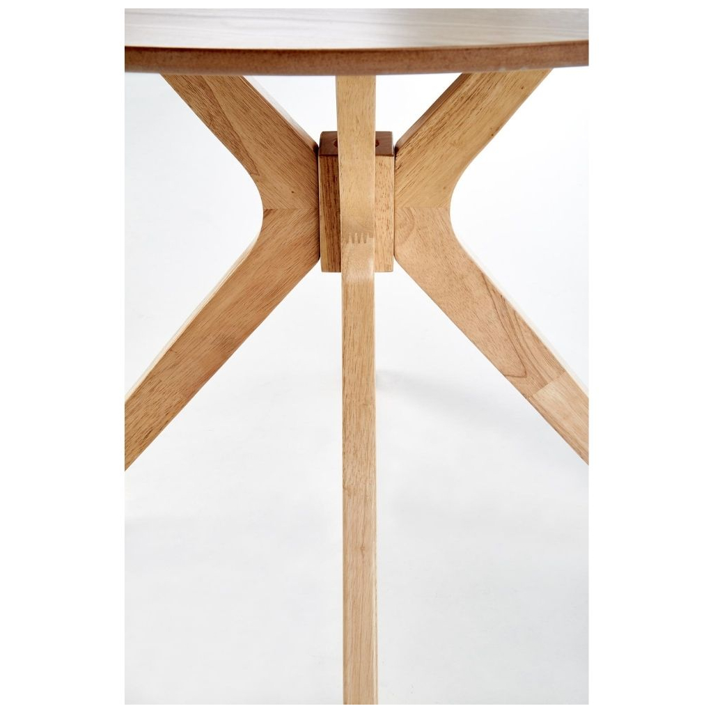 Robustná doska stola je vyrobená z prírodnej MDF vo farebnom prevedení dub prírodný. Nohy stola sú konštruované tak, aby zo stola vytvorili dizajnovú záležitosť a súčasne zaistili stolu maximálnu stabilitu. Tú umocňuje ich prevedenie z masívneho dreva v prírodnej farbe.