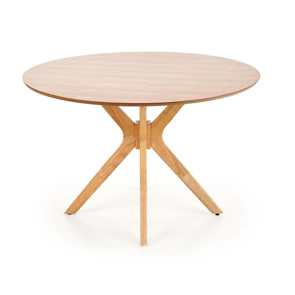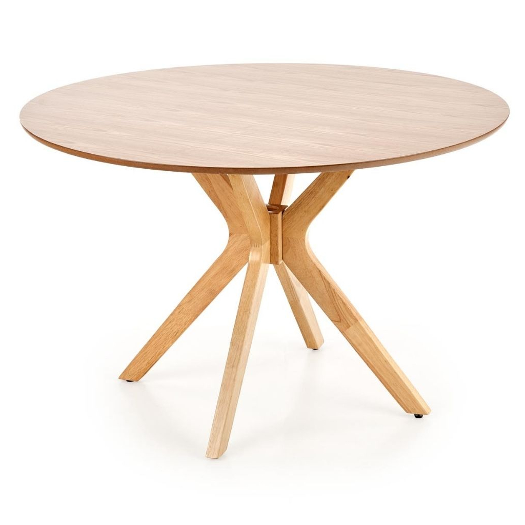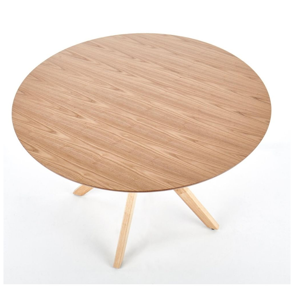 Robustná doska stola je vyrobená z prírodnej MDF vo farebnom prevedení dub prírodný. Nohy stola sú konštruované tak, aby zo stola vytvorili dizajnovú záležitosť a súčasne zaistili stolu maximálnu stabilitu. Tú umocňuje ich prevedenie z masívneho dreva v prírodnej farbe.