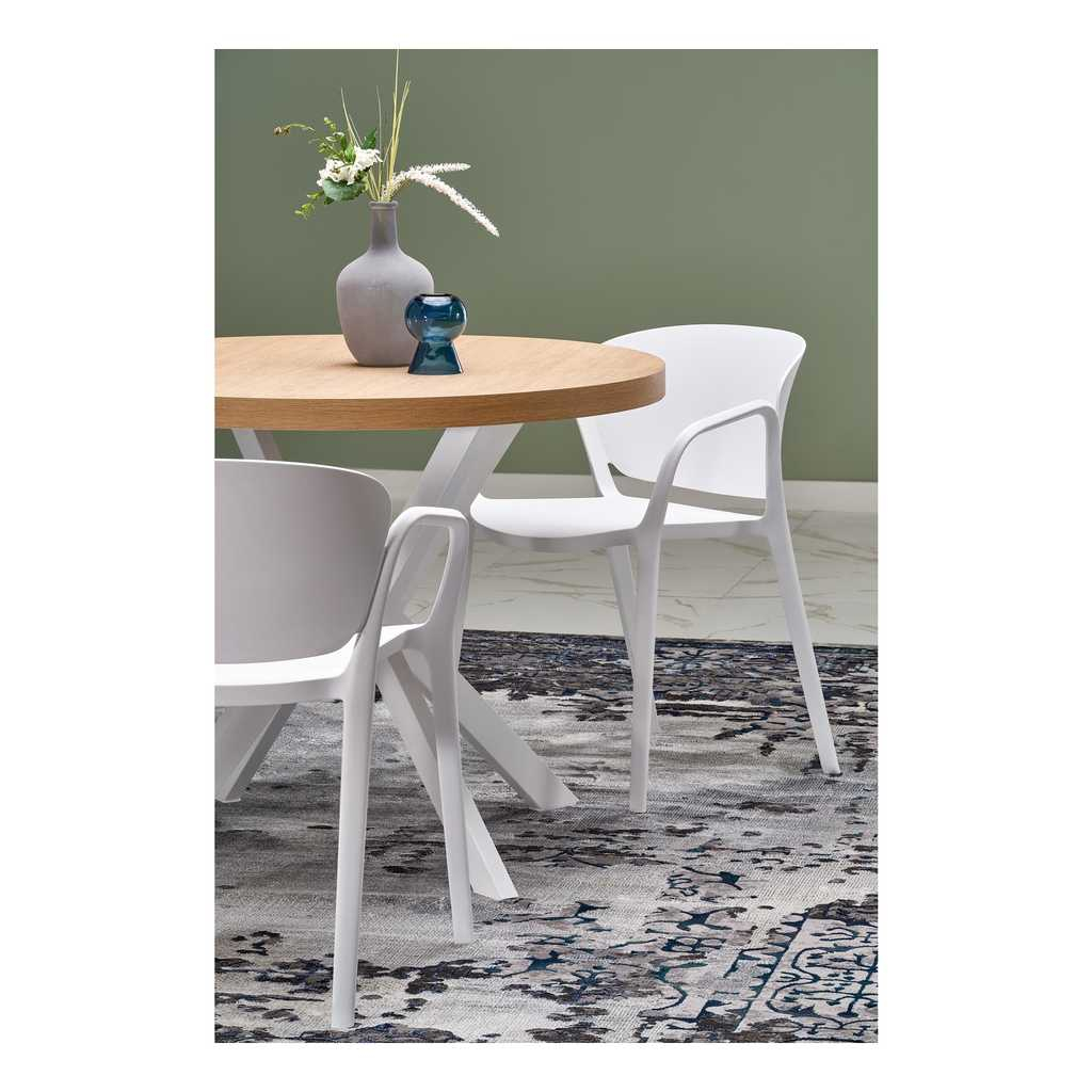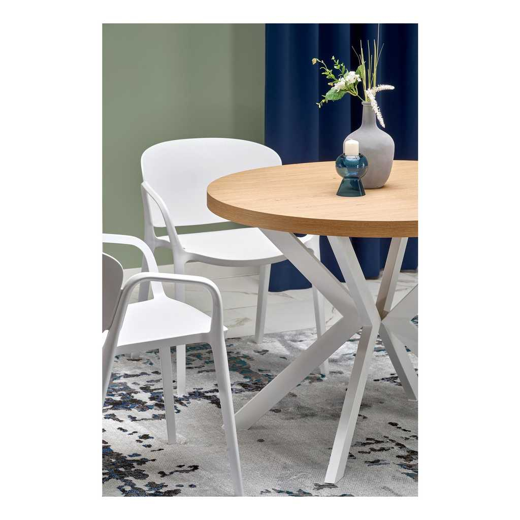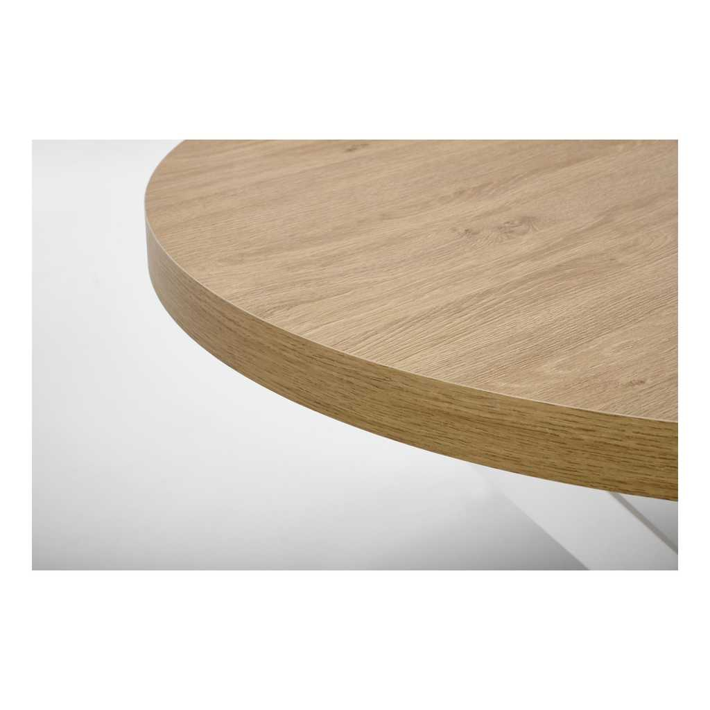 Okrúhla doska stola je vyrobená z kombinácie dyhovaných drevotrieskových dosiek, čo jej dodáva prírodný vzhľad s odolnou povrchovou úpravou. Tento materiál je ideálny na každodenné používanie vďaka jednoduchej údržbe a odolnosti voči poškodeniu. Prírodný odtieň dodáva stolu teplý a príjemný vzhľad, ktorý krásne doplní každý moderný interiér.