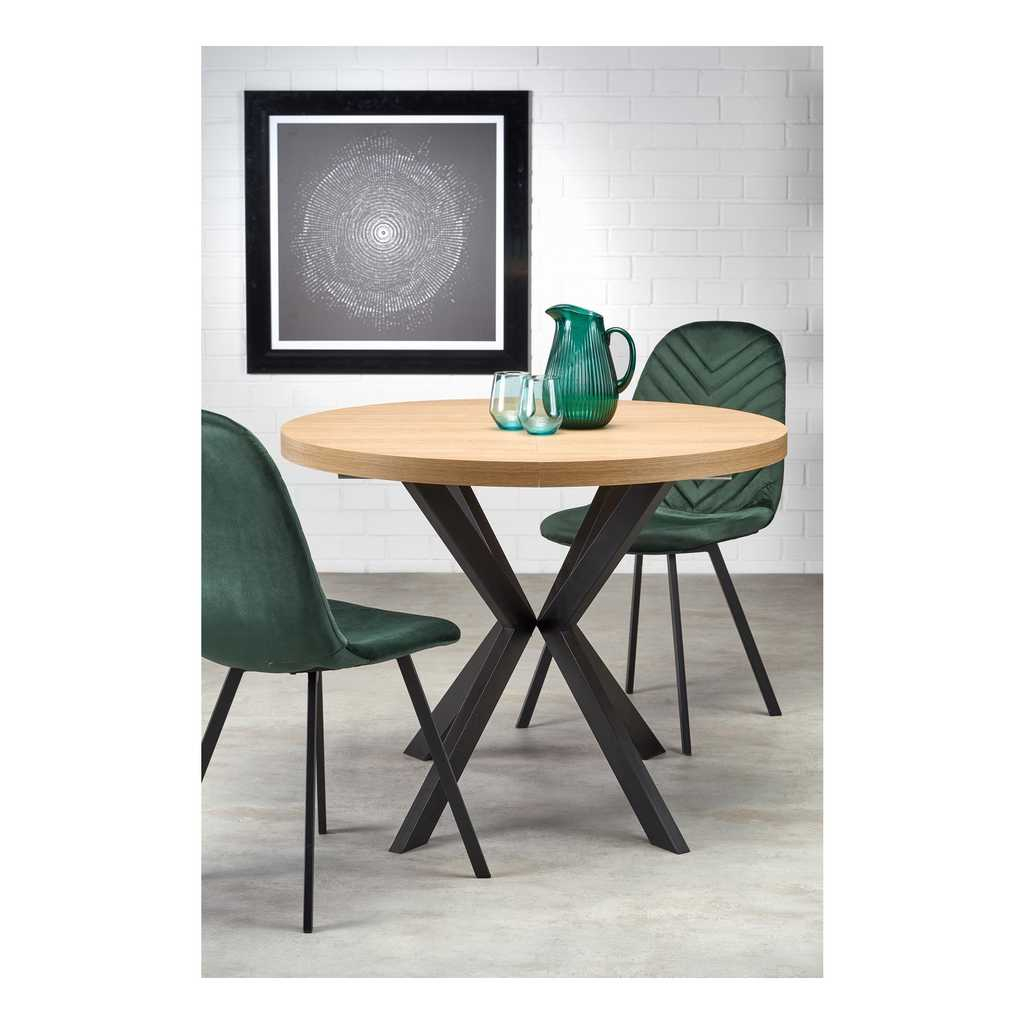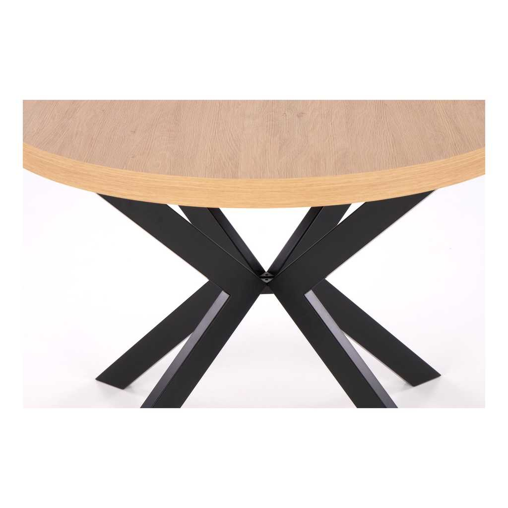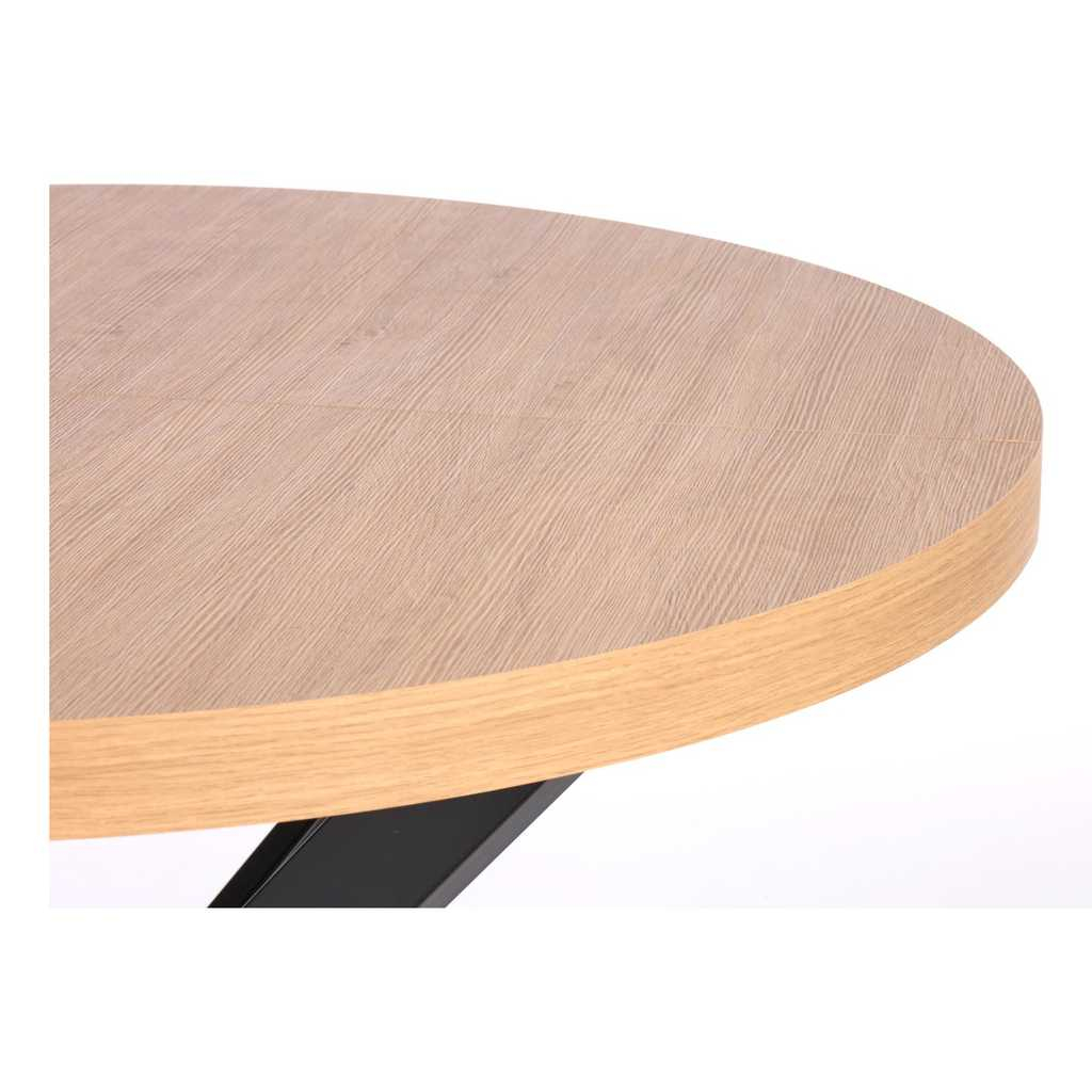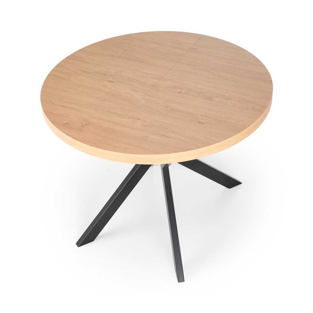 Okrúhla doska stola je vyrobená z kombinácie dyhovaných drevotrieskových dosiek, čo jej dodáva prírodný vzhľad s odolnou povrchovou úpravou. Tento materiál je ideálny na každodenné používanie vďaka jednoduchej údržbe a odolnosti voči poškodeniu. Prírodný odtieň dodáva stolu teplý a príjemný vzhľad, ktorý krásne doplní každý moderný interiér.