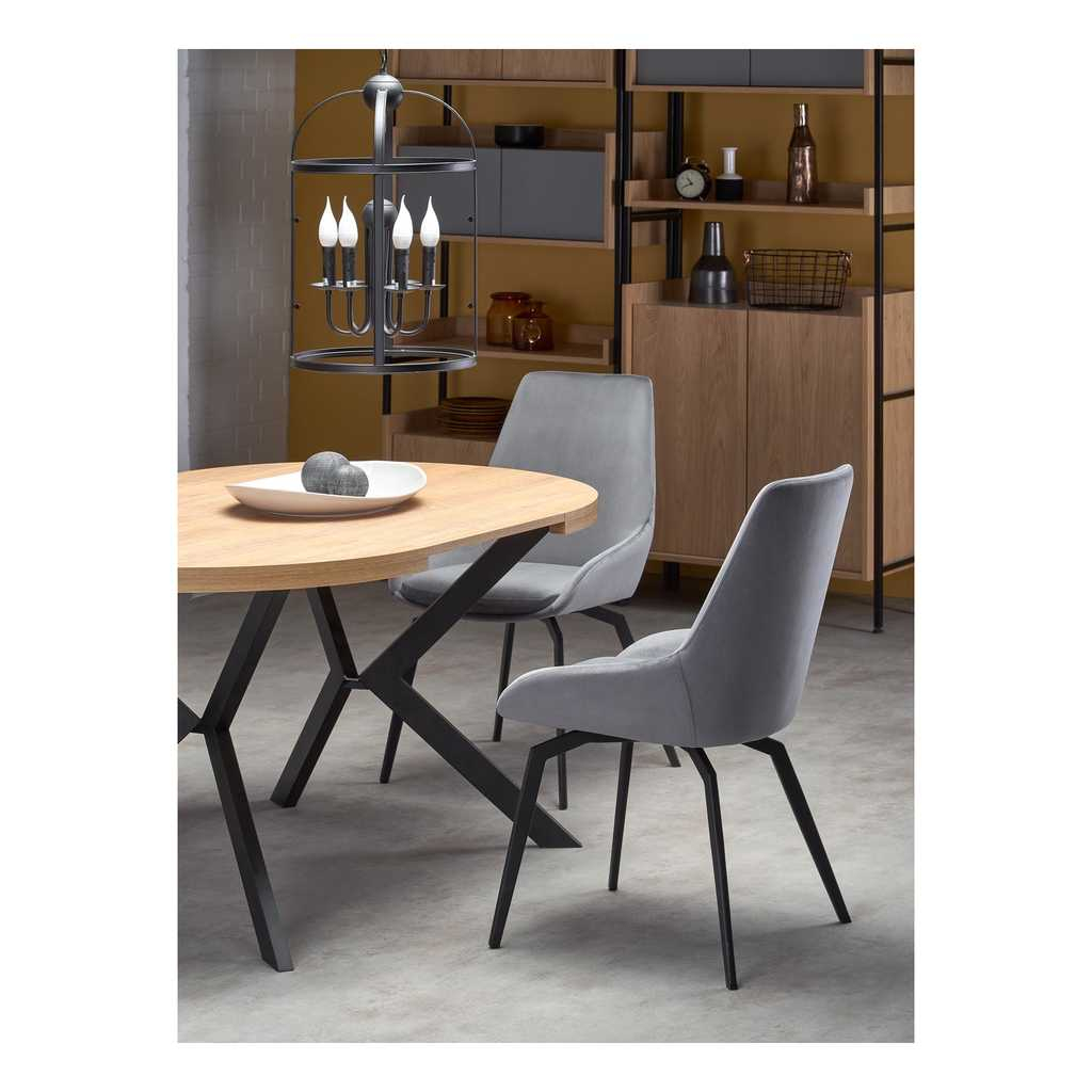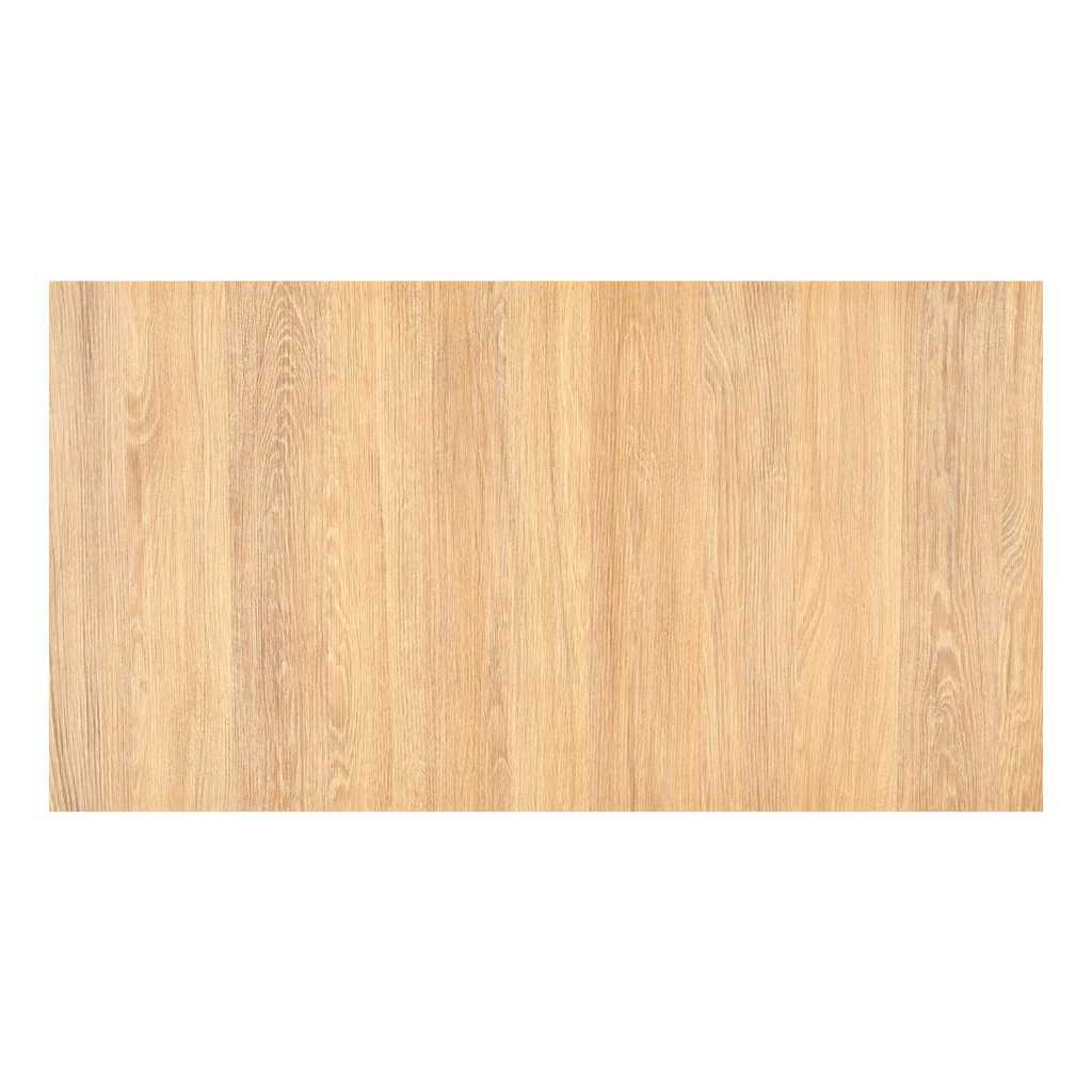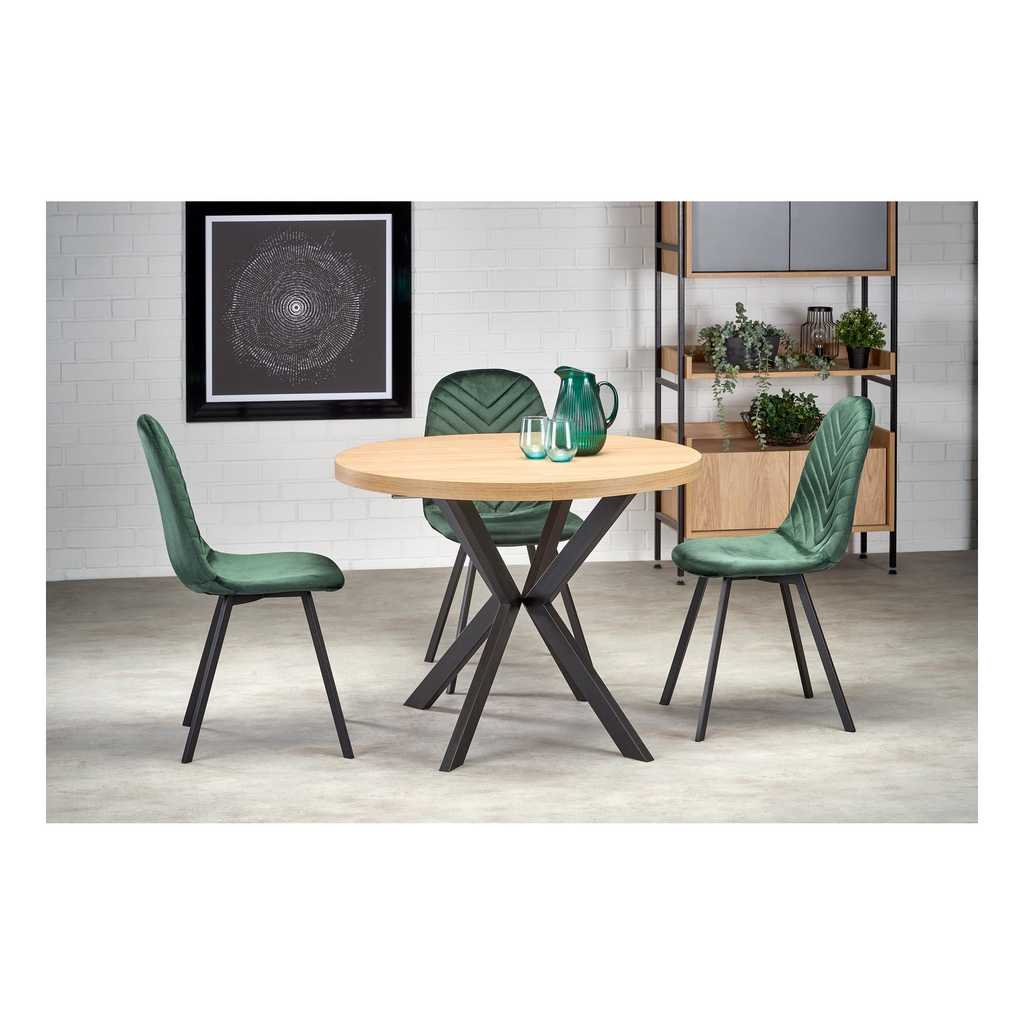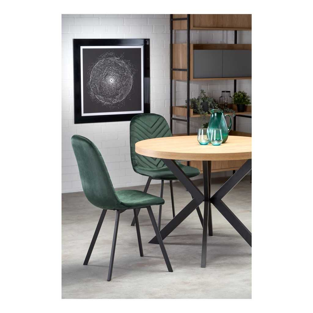Okrúhla doska stola je vyrobená z kombinácie dyhovaných drevotrieskových dosiek, čo jej dodáva prírodný vzhľad s odolnou povrchovou úpravou. Tento materiál je ideálny na každodenné používanie vďaka jednoduchej údržbe a odolnosti voči poškodeniu. Prírodný odtieň dodáva stolu teplý a príjemný vzhľad, ktorý krásne doplní každý moderný interiér.