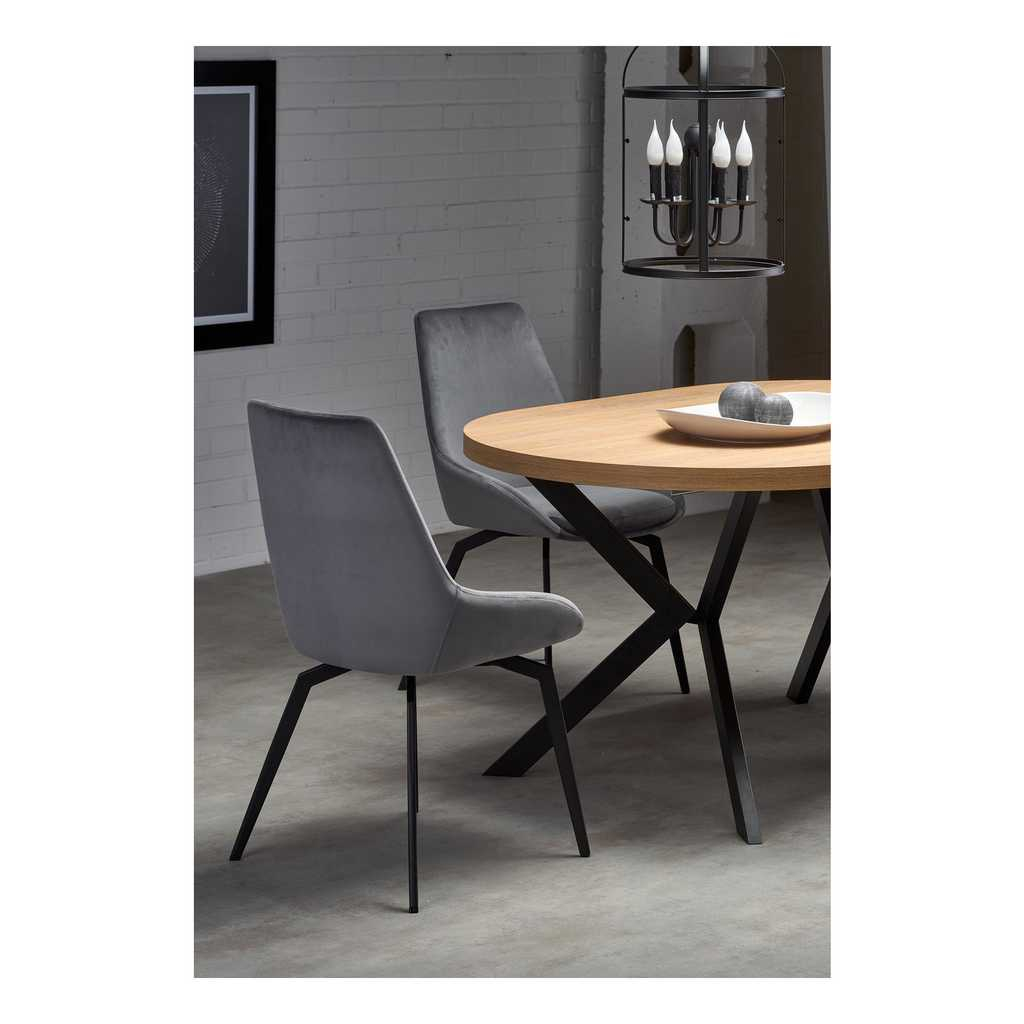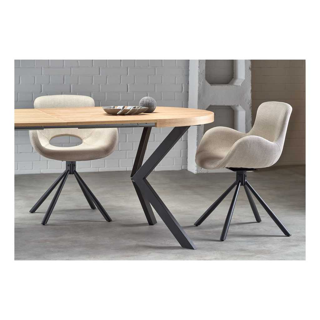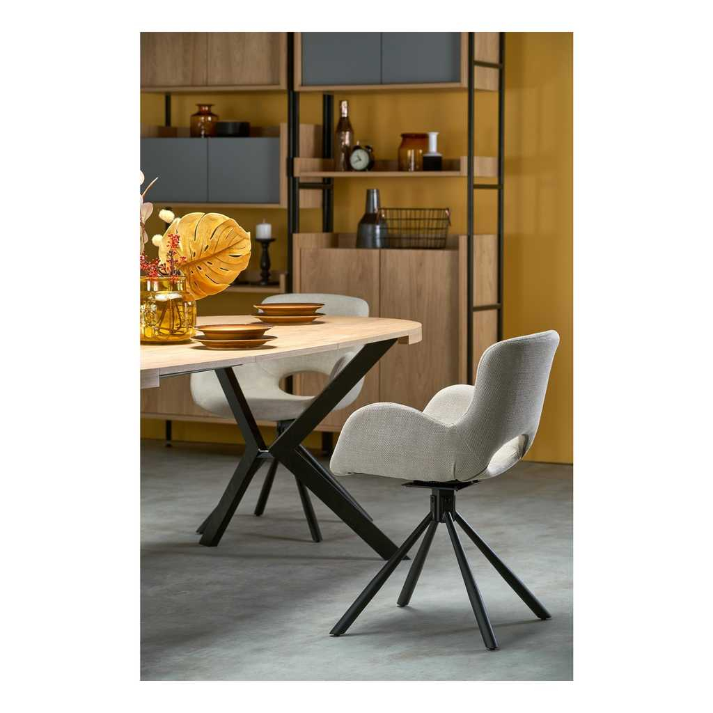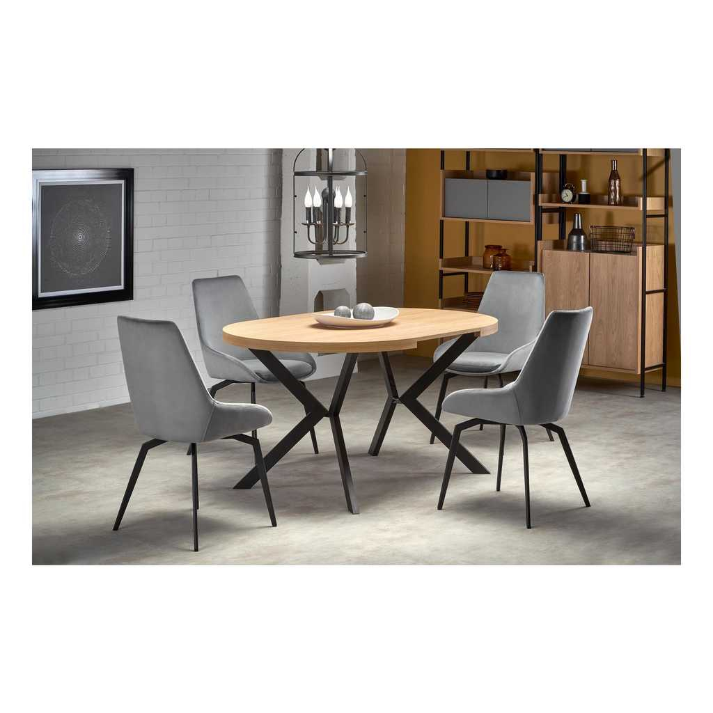 Okrúhla doska stola je vyrobená z kombinácie dyhovaných drevotrieskových dosiek, čo jej dodáva prírodný vzhľad s odolnou povrchovou úpravou. Tento materiál je ideálny na každodenné používanie vďaka jednoduchej údržbe a odolnosti voči poškodeniu. Prírodný odtieň dodáva stolu teplý a príjemný vzhľad, ktorý krásne doplní každý moderný interiér.